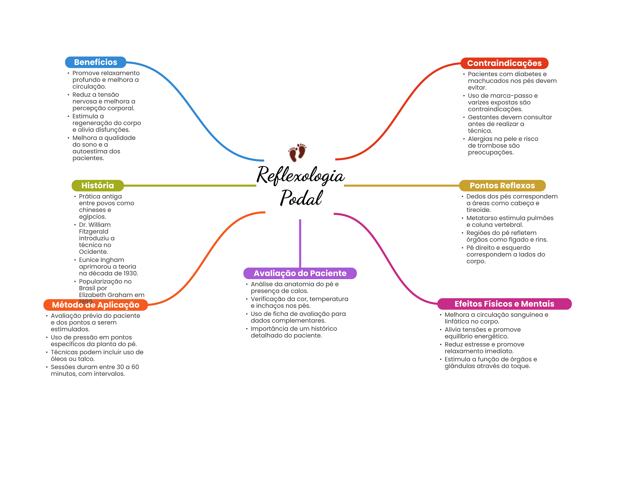 Benefícios Contraindicações Promove relaxamento Pacientes com diabetes e profundo e melhora a machucados nos pés devem circulação. evitar. Reduz a tensão Uso de marca-passo e nervosa e melhora a varizes expostas são percepção corporal. contraindicações. Estimula a Gestantes devem consultar regeneração do corpo antes de realizar a e alivia disfunções. técnica. Melhora a qualidade Alergias na pele e risco do sono e a de trombose são autoestima dos preocupações. pacientes. Reflexologia História Pontos Reflexos Prática antiga Podal Dedos dos pés correspondem entre povos como a áreas como cabeça e chineses e tireoide. egípcios. Metatarso estimula pulmões Dr. William e coluna vertebral. Fitzgerald Regiões do pé refletem introduziu a órgãos como fígado e rins. técnica no Pé direito e esquerdo Ocidente. correspondem a lados do Eunice Ingham corpo. aprimorou a teoria na década de 1930. Avaliação do Paciente Popularização no Análise da anatomia do pé e Brasil por presença de calos. Elizabeth Graham em Verificação da cor, temperatura Método de Aplicação e inchaços nos pés. Efeitos Físicos e Mentais Avaliação prévia do paciente Uso de ficha de avaliação para Melhora a circulação sanguínea e e dos pontos a serem dados complementares. linfática no corpo. estimulados. Importância de um histórico Alivia tensões e promove Uso de pressão em pontos detalhado do paciente. equilíbrio energético. específicos da planta do pé. Reduz estresse e promove Técnicas podem incluir uso de relaxamento imediato. óleos ou talco. Estimula a função de órgãos e Sessões duram entre 30 a 60 glândulas através do toque. minutos, com intervalos.