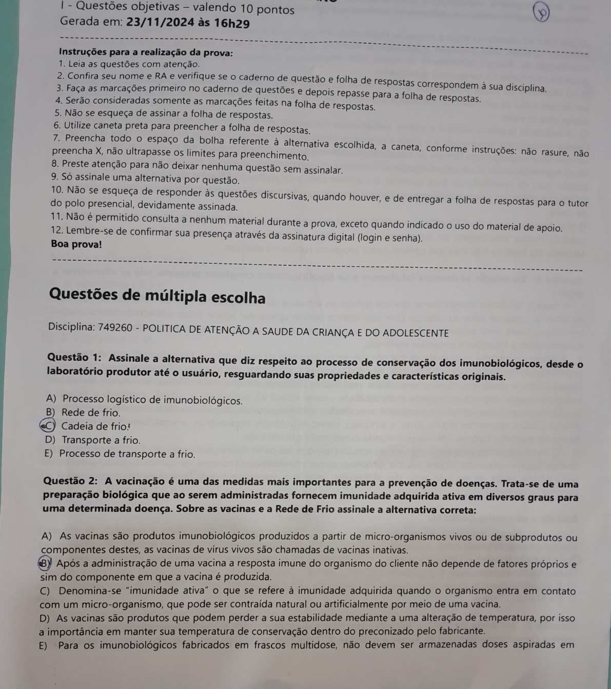 Questões objetivas valendo 10 pontos Gerada em: 23/11/2024 às 16h29 Instruções para a realização da prova: 1. Leia as questões com atenção. 2. Confira seu nome e RA e verifique se o caderno de questão e folha de respostas correspondem à sua disciplina. 3. Faça as marcações primeiro no caderno de questões e depois repasse para a folha de respostas. 4. Serão consideradas somente as marcações feitas na folha de respostas. 5. Não se esqueça de assinar a folha de respostas. 6. Utilize caneta preta para preencher a folha de respostas. 7. Preencha todo o espaço da bolha referente à alternativa - escolhida, a caneta, conforme instruções: não rasure, não preencha X, não ultrapasse os limites para preenchimento. 8. Preste atenção para não deixar nenhuma questão sem assinalar. 9. Só assinale uma alternativa por questão. 10. Não se esqueça de responder às questões discursivas, quando houver, e de entregar a folha de respostas para o tutor do polo presencial, devidamente assinada. 11. Não é permitido consulta a nenhum material durante a prova, exceto quando indicado o uso do material de apoio. 12. Lembre-se de confirmar sua presença através da assinatura digital (login e senha). Boa prova! Questões de múltipla escolha Disciplina: 749260 POLITICA DE ATENÇÃO A SAUDE DA CRIANÇA E DO ADOLESCENTE Questão 1: Assinale a alternativa que diz respeito ao processo de conservação dos imunobiológicos, desde o laboratório produtor até o usuário, resguardando suas propriedades e características originais. A) Processo logístico de imunobiológicos. B) Rede de frio. Cadeia de frio! D) Transporte a frio. E) Processo de transporte a frio. Questão 2: A vacinação é uma das medidas mais importantes para a prevenção de doenças. Trata-se de uma preparação biológica que ao serem administradas fornecem imunidade adquirida ativa em diversos graus para uma determinada doença. Sobre as vacinas e a Rede de Frio assinale a alternativa correta: A) As vacinas são produtos imunobiológicos produzidos a partir de micro-organismos vivos ou de subprodutos ou componentes destes, as vacinas de vírus vivos são chamadas de vacinas inativas. B Após a administração de uma vacina a resposta imune do organismo do cliente não depende de fatores próprios e sim do componente em que a vacina é produzida. C) Denomina-se "imunidade ativa" o que se refere à imunidade adquirida quando o organismo entra em contato com um micro-organismo, que pode ser contraída natural ou artificialmente por meio de uma vacina. D) As vacinas são produtos que podem perder a sua estabilidade mediante a uma alteração de temperatura, por isso a importância em manter sua temperatura de conservação dentro do preconizado pelo fabricante. E) Para os imunobiológicos fabricados em frascos multidose, não devem ser armazenadas doses aspiradas emseringas, essa conservação não é adequada ao imunizante. Questão 3: A Semana Mundial de Aleitamento Materno (SMAM) é considerada como veículo para promoção da amamentação e ocorre em 120 países de a 7 de agosto. A Aliança Mundial de Ação Pró-Amamentação (WABA) define, a cada ano, o tema a ser trabalhado na semana, lançando materiais que são traduzidos em 14 idiomas. Entretanto, a data e o tema podem ser adaptados em cada país, para que sejam obtidos os melhores resultados no evento. No Brasil, o Ministério da Saúde coordena a SMAM desde 1999, sendo responsável pela adaptação do tema para nosso país e elaboração e distribuição de cartaz e folder. Considerando as iniciativas e projetos nacionais para o incentivo ao aleitamento materno assinale abaixo a alternativa INCORRETA: A) Em 1981 foi criando no Brasil o Programa Nacional de Incentivo ao Aleitamento Materno (PNIAM) que foi uma das primeiras condutas para promover o aleitamento materno. O programa recebeu destaque em todo o país, com a contribuição de diversos profissionais da saúde, com atendimento individualizado nas unidades básicas de saúde, materiais informativos e campanhas publicitárias. B) Ministério da Saúde entendendo a importância do aleitamento materno exclusivo por seis meses determinou por lei que todas as empresas devem obrigatoriamente oferecer a licença maternidade por um período mínimo de 6 meses para as mães. C) A legislação brasileira ampara a mulher trabalhadora contemplando a garantia de emprego desde a gestação, a licença-maternidade remunerada e o apoio à prática do aleitamento materno. Com isso, há garantia para as mulheres com vínculos empregatícios formais de benefícios trabalhistas de apoio à maternidade e à amamentação. D) Agosto Dourado é um mês dedicado ao incentivo do aleitamento materno. A cor dourada está relacionada ao padrão ouro de qualidade do leite materno. De acordo com a Organização Mundial da Saúde (OMS), cerca de 6 milhões de vidas são salvas anualmente por causa do aumento das taxas de amamentação exclusiva até o sexto mês de idade. E) Em parceria com a UNICEP a OMS em 1990 lançou a iniciativa ao Hospital amigo da criança e juntamente para conduzir melhor esse projeto foi estabelecido um programa chamado Dez Passos para o Sucesso do Aleitamento Materno. No Brasil os hospitais que aderem a esse programa recebem benefícios. Questão 4: Em relação às doenças falciformes e ao hipotireoidismo congênito primário, leia as afirmativas a seguir: A doença falciforme caracteriza-se por um defeito na estrutura da hemoglobina, fazendo com que as hemácias assumam a forma de foice. As crianças com esta doença podem apresentar alguns sinais e sintomas, como: anemia hemolítica, crises vaso-oclusivas, crises de dor, insuficiência renal progressiva, acidente vascular cerebral, maior suscetibilidade a infecções e sequestro esplênico. A doença falciforme caracteriza-se por um defeito na estrutura da hemoglobina, fazendo com que as hemácias assumam a forma de foice. As crianças com esta doenç