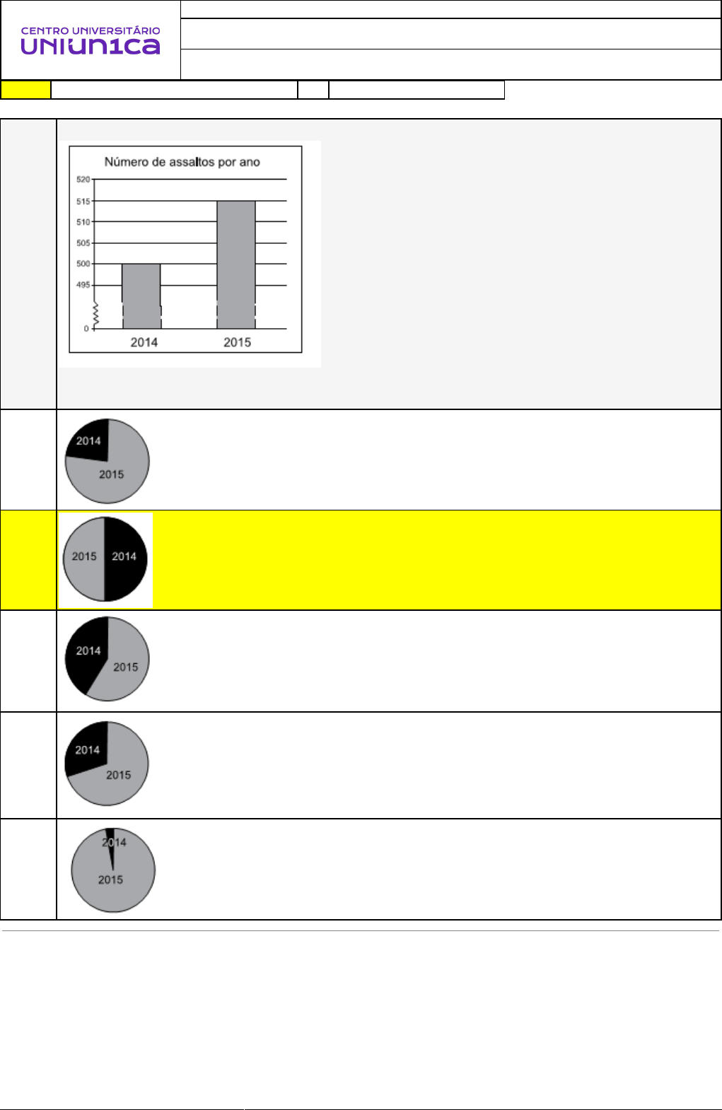 10/11/2025 17:24:27 1/5 REVISÃO DE SIMULADO Nome: POLIANA PEREIRA DA SILVA DE OLIVEIRA Disciplina: Estatística Aplicada à Educação Respostas corretas são marcadas em amarelo X Respostas marcardas por você. Questão 001 (VUNESP – 2016) Observe o gráfico a seguir para responder à questão. Construindo um gráfico de setores com os dados sobre o número de assaltos em 2014 e 2015, obtém-se um gráfico parecido com: A) X B) C) D) E) 10/11/2025 17:24:27 2/5 Questão 002 (VUNESP – 2017) Ricardo registrou o número de pessoas que ele atendeu nos últimos 10 dias em um gráfico. A partir dos dados do gráfico, é correto afirmar que Ricardo A) atendeu mais pessoas no período da tarde. B) atendeu mais pessoas nos primeiros 5 dias do que nos últimos 5. C) atendeu uma média diária de 15 pessoas. D) em 20% dos dias, atendeu mais do que 18 pessoas por dia. X E) em metade desses dias, atendeu mais de 80 pessoas. Questão 003 (VUNESP – 2017) Leia o enunciado a seguir para responder à questão. A tabela apresenta o número de acertos dos 600 candidatos que realizaram a prova da segunda fase de um concurso, que continha 5 questões de múltipla escolha. Analisando-se as informações apresentadas na tabela, é correto afirmar que A) mais da metade dos candidatos acertou menos de 50% da prova. B) exatamente 168 candidatos acertaram, no mínimo, 2 questões. X C) 264 candidatos acertaram, no máximo, 3 questões. D) menos da metade dos candidatos acertou mais de 50% da prova. E) 132 candidatos acertaram a questão de número 4. Questão 004 (VUNESP – 2020) Os alunos do 9° ano de um colégio promoveram um jogo beneficente, e venderam cada ingresso para o jogo por R$ 4,00. O gráfico mostra o número de ingressos vendidos por essas turmas. Imagem associada para resolução da questão O valor total arrecadado com a venda desses ingressos por essas turmas foi R$ 292,00. O número de ingressos vendidos pela turma E foi Alternativas 10/11/2025 17:24:27 3/5 A) 15. B) 16. C) 12. D) 14. X E) 13. Questão 005 (Marinha – 2018) A representação gráfica de uma distribuição de frequência formada por um conjunto de retângulos justapostos, cujas bases se localizam sobre o eixo horizontal, de tal modo que seus pontos médios coincidem com os pontos médios dos intervalos de classe é denominada A) pictograma. B) polígono de frequência. C) gráfico polar. D) curva de frequência. X E) Histograma. Questão 006 (VUNESP – 2016) O gráfico mostra a variação da massa corporal, em kg, de uma pessoa no decorrer dos seis primeiros meses do ano de 2016. De acordo com as informações apresentadas no gráfico, é correto afirmar que a massa corporal dessa pessoa A) atingiu o menor valor em maio. X B) apresentou a maior redução mensal entre março e abril. C) sempre diminuiu entre março e junho. D) apresentou o maior aumento mensal entre maio e junho. E) aumentou somente entre janeiro e março. 10/11/2025 17:24:27 4/5 Questão 007 (ENADE – 2017) Os britânicos decidiram sair da União Europeia (UE). A de cisão do referendo abalou os mercados financeiros em meio às incertezas sobre os possíveis impactos dessa saída. Os gráficos apresentam, respectivamente, as contribuições dos países integrantes do bloco para a UE, em 2014, que somam € 144,9 bilhões de euros, e a comparação entre a contribuição do Reino Unido para a UE e a contrapartida dos gastos da UE com o Reino Unido. Considerando o texto e as informações apresentadas nos gráficos, assinale a opção correta. X A) A diferença da contribuição do Reino Unido em relação ao recebido do bloco econômico foi 38,94%. B) O grupo “Outros países” contribui u para esse bloco econômico com 42,1%. C) O percentual de participação do Reino Unido com bloco econômico em 2014 foi de 17, 8%, o que colocou entre os quatro maiores participantes. D) A contribuição dos quatro maiores países do bloco somou 41,13%. E) A soma das participações dos três países com maior contribuição para o bloco econômico supera 50%. Questão 008 (VUNESP – 2020) Um grupo de funcionários de uma empresa participou de uma enquete na qual poderiam ser votados um ou dois de três projetos de apoio aos filhos de funcionários. A tabela a seguir mostra a distribuição dos votos. Imagem associada para resolução da questão. O número dos que votaram apenas no programa C supera a soma daqueles que votaram apenas em A ou apenas em B em uma quantidade igual a A) 10. X B) 6. C) 9. 10/11/2025 17:24:27 5/5 D) 2. E) 5.