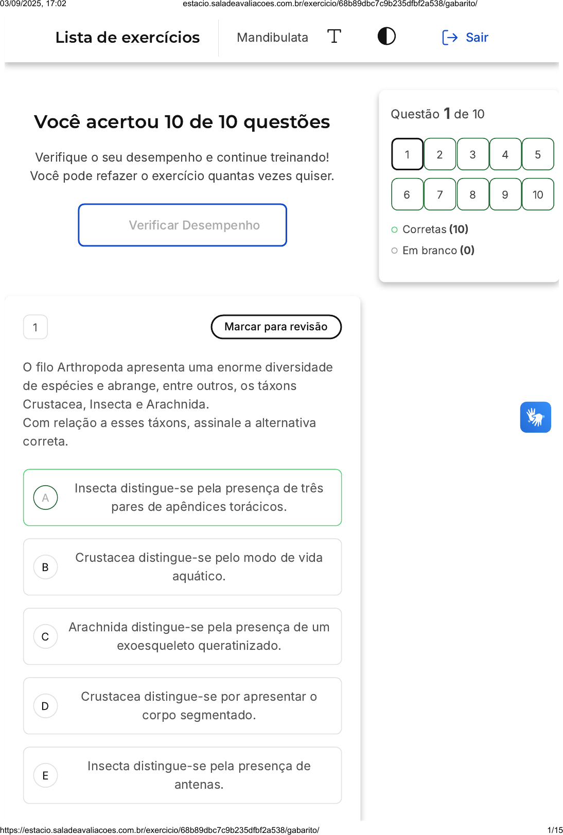 Você acertou 10 de 10 questões Verifique o seu desempenho e continue treinando! Você pode refazer o exercício quantas vezes quiser. Verificar Desempenho A B C D E 1 Marcar para revisão O filo Arthropoda apresenta uma enorme diversidade de espécies e abrange, entre outros, os táxons Crustacea, Insecta e Arachnida. Com relação a esses táxons, assinale a alternativa correta. Insecta distingue-se pela presença de três pares de apêndices torácicos. Crustacea distingue-se pelo modo de vida aquático. Arachnida distingue-se pela presença de um exoesqueleto queratinizado. Crustacea distingue-se por apresentar o corpo segmentado. Insecta distingue-se pela presença de antenas. Questão 1 de 10 Corretas (10) Em branco (0) 1 2 3 4 5 6 7 8 9 10 Lista de exercícios Mandibulata Sair 03/09/2025, 17:02 estacio.saladeavaliacoes.com.br/exercicio/68b89dbc7c9b235dfbf2a538/gabarito/ https://estacio.saladeavaliacoes.com.br/exercicio/68b89dbc7c9b235dfbf2a538/gabarito/ 1/15 Resposta correta Parabéns, você selecionou a alternativa correta. Confira o gabarito comentado! Gabarito Comentado A alternativa correta é a letra A, que afirma que o táxon Insecta se distingue pela presença de três pares de apêndices torácicos. Isso é verdadeiro, pois os insetos, que pertencem a este táxon, possuem três pares de pernas, que são apêndices torácicos. As demais alternativas apresentam afirmações incorretas ou incompletas. Por exemplo, a alternativa B sugere que o táxon Crustacea se distingue pelo modo de vida aquático, o que não é totalmente verdadeiro, pois, apesar da maioria dos crustáceos serem aquáticos, existem espécies que vivem em ambiente terrestre, como é o caso da ordem Isopoda. Da mesma forma, a alternativa C está incorreta, pois todos os artrópodes, e não apenas os Arachnida, possuem um exoesqueleto. Por fim, as alternativas D e E também estão incorretas, pois a segmentação do corpo e a presença de antenas não são características exclusivas dos táxons Crustacea e Insecta, respectivamente. 2 Marcar para revisão O esquema a seguir ilustra as etapas do desenvolvimento de uma mosca. 03/09/2025, 17:02 estacio.saladeavaliacoes.com.br/exercicio/68b89dbc7c9b235dfbf2a538/gabarito/ https://estacio.saladeavaliacoes.com.br/exercicio/68b89dbc7c9b235dfbf2a538/gabarito/ 2/15 A B C D E Retirado de: http://areaprojectojns.blogspot.com/2009/11/ciclo- de-vida.html A partir desse esquema, marque a alternativa correta. A mosca adulta é um inseto hemimetábolo e díptero. A mosca apresenta uma metamorfose incompleta, pois é um inseto de desenvolvimento indireto. A mosca corresponde a um inseto do grupo dos holometábolos. A mosca possui uma fase larval e outra de pupa. A mosca possui o mesmo tipo de metamorfose apresentada por baratas e gafanhotos. Resposta correta Parabéns, você selecionou a alternativa correta. Confira o gabarito comentado! 03/09/2025, 17:02 estacio.saladeavaliacoes.com.br/exercicio/68b89dbc7c9b235dfbf2a538/gabarito/ https://estacio.saladeavaliacoes.com.br/exercicio/68b89dbc7c9b235dfbf2a538/gabarito/ 3/15 A B C Gabarito Comentado A mosca é um díptero (Ordem Diptera), juntamente com os mosquitos, e é um inseto com desenvolvimento holometábolo. Lembrando que o desenvolvimento holometábolo com metamorfose completa, apresenta 4 fases: o ovo, larva, pupa (com metamorfose) e adulto. Baratas e gafanhotos são insetos hemimetábolos. 3 Marcar para revisão (COSEAC/RJ/2018 - adaptada) Uma proposta de atividade para o estudo do filo Arthropoda, grupo dos insetos, consiste em distribuir para os alunos modelos em biscuit dos diferentes animais, como caranguejo, abelha, aranha, siri, borboleta, barata, grilo, formiga etc., para que, a partir da semelhança de suas características externas, eles os agrupem. Ao final da atividade, espera-se que os alunos utilizem as seguintes características para reestruturar os animais no grupo dos insetos Presença de exoesqueleto, par de pernas articuladas em cada segmento corporal e dois pares de antenas. Um par de pernas no segmento torácico, um par de antenas e um par de quelíceras. Corpo dividido em cabeça, tórax e abdome, um par de antenas e um par de pernas em cada segmento torácico. 03/09/2025, 17:02 estacio.saladeavaliacoes.com.br/exercicio/68b89dbc7c9b235dfbf2a538/gabarito/ https://estacio.saladeavaliacoes.com.br/exercicio/68b89dbc7c9b235dfbf2a538/gabarito/ 4/15 D E Corpo dividido em cabeça e tronco, exoesqueleto de quitina. Corpo dividido em duas ou três partes, três pares de pernas, um par de antenas. Resposta correta Parabéns, você selecionou a alternativa correta. Confira o gabarito comentado! Gabarito Comentado Os insetos, pertencentes ao filo Arthropoda, possuem características específicas que os diferenciam de outros artrópodes. Eles apresentam apenas um par de antenas, diferentemente dos crustáceos, que são os únicos artrópodes com dois pares de antenas. Além disso, os insetos não possuem quelíceras, que são características do grupo Chelicerata. O corpo dos insetos é dividido em três partes: cabeça, tórax e abdome. Cada segmento torácico possui um par de pernas. Portanto, a alternativa que corretamente descreve as características dos insetos é a "Corpo dividido em cabeça, tórax e abdome, um par de antenas e um par de pernas em cada segmento torácico". 4 Marcar para revisão A figura abaixo é a representação de um tipo de desenvolvimento característico de alguns grupos de insetos. Marque a alternativa que apresenta o grupo de insetos que não se desenvolve como na representação. 03/09/2025, 17:02 estacio.saladeavaliacoes.com.br/exercicio/68b89dbc7c9b235dfbf2a538/gabarito/ https://estacio.saladeavaliacoes.com.br/exercicio/68b89dbc7c9b235dfbf2a538/gabarito/ 5/15 A B C D E Marque a alternativa que apresenta as afirmativas corretas. Mariposas (Lepidoptera) Gafanhotos (Orthoptera) Abelhas (Hymenoptera) Moscas (Diptera) Besouros (Coleoptera) Resposta correta Parabéns, você selecionou 
