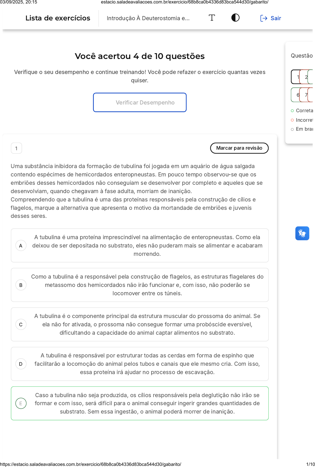 Você acertou 4 de 10 questões Verifique o seu desempenho e continue treinando! Você pode refazer o exercício quantas vezes quiser. Verificar Desempenho A B C D E 1 Marcar para revisão Uma substância inibidora da formação de tubulina foi jogada em um aquário de água salgada contendo espécimes de hemicordados enteropneustas. Em pouco tempo observou-se que os embriões desses hemicordados não conseguiam se desenvolver por completo e aqueles que se desenvolviam, quando chegavam à fase adulta, morriam de inanição. Compreendendo que a tubulina é uma das proteínas responsáveis pela construção de cílios e flagelos, marque a alternativa que apresenta o motivo da mortandade de embriões e juvenis desses seres. A tubulina é uma proteína imprescindível na alimentação de enteropneustas. Como ela deixou de ser depositada no substrato, eles não puderam mais se alimentar e acabaram morrendo. Como a tubulina é a responsável pela construção de flagelos, as estruturas flagelares do metassomo dos hemicordados não irão funcionar e, com isso, não poderão se locomover entre os túneis. A tubulina é o componente principal da estrutura muscular do prossoma do animal. Se ela não for ativada, o prossoma não consegue formar uma probóscide eversível, dificultando a capacidade do animal captar alimentos no substrato. A tubulina é responsável por estruturar todas as cerdas em forma de espinho que facilitarão a locomoção do animal pelos tubos e canais que ele mesmo cria. Com isso, essa proteína irá ajudar no processo de escavação. Caso a tubulina não seja produzida, os cílios responsáveis pela deglutição não irão se formar e com isso, será difícil para o animal conseguir ingerir grandes quantidades de substrato. Sem essa ingestão, o animal poderá morrer de inanição. Questão Correta Incorret Em bran 1 2 6 7 Lista de exercícios Introdução À Deuterostomia e… Sair 03/09/2025, 20:15 estacio.saladeavaliacoes.com.br/exercicio/68b8ca0b4336d83bca544d30/gabarito/ https://estacio.saladeavaliacoes.com.br/exercicio/68b8ca0b4336d83bca544d30/gabarito/ 1/10 A B C D E Resposta correta Parabéns, você selecionou a alternativa correta. Confira o gabarito comentado! Gabarito Comentado A tubulina é uma proteína que compõe a estrutura de cílios e flagelos. No caso dos hemicordados enteropneustas, a faringe desses animais é repleta de cílios que auxiliam na manipulação e deglutição do sedimento ingerido. Quando a produção de tubulina é inibida, esses cílios não se formam adequadamente, dificultando a ingestão de alimentos. Isso pode levar à inanição e, consequentemente, à morte do animal. Portanto, a alternativa E é a correta, pois explica corretamente a relação entre a inibição da produção de tubulina e a morte dos hemicordados enteropneustas por inanição. 2 Marcar para revisão Caminhando pelas areias de uma praia, um grupo de jovens se deparou com a imagem abaixo. Muitos se assustaram, pois acharam ser proveniente de algum tipo de animal serpentiforme. Um dos jovens, ao observar a imagem, alertou que não precisavam sentir medo pois aquela imagem demonstrava que o solo daquela região estava sendo muito bem cuidado. Marque alternativa que remetem a que grupo de animais segundo a imagem e a fala do jovem. A equinodermos Holothuroides, como os pepinos-do-mar. A equinoides, como bolachas-do-mar que constroem túneis e ficam sob a terra. A hemicordados formadores de tubos como os Pterobranchias. A Enteropneustas, tipo de hemicordados cavadores de túneis. A cefalocordados, grupo de protocordados marinhos bentônicos. 03/09/2025, 20:15 estacio.saladeavaliacoes.com.br/exercicio/68b8ca0b4336d83bca544d30/gabarito/ https://estacio.saladeavaliacoes.com.br/exercicio/68b8ca0b4336d83bca544d30/gabarito/ 2/10 A B C D E Resposta incorreta Opa! A alternativa correta é a letra D. Confira o gabarito comentado! Gabarito Comentado Os tubos apresentados na imagem são provenientes da ação digestiva de hemicordados enteropneustas, que vivem cavando buracos no solo e, simultaneamente, comendo a areia e substrato e os digerindo, promovendo uma reciclagem de nutrientes para o solo daquela região. Alguns equinodermos até chegam a se esconder no substrato, mas não são capazes de cavar túneis desse tamanho, assim como cefalocordados, que são animais suspensívoros e que não têm capacidade para tamanha escavação. 3 Marcar para revisão Dentro de um aquário de criação de equinodermos, foi notado que um grupo de pepinos do mar de uma certa geração estava morrendo com baixo índice de nutrientes em seu organismo. Os criadores fizeram uma análise do substrato, não indicando nenhum tipo de problema que pudesse ocasionar isso. Então, levaram amostras dos indivíduos mortos para um laboratório de análises genéticas e descobriram que um dos genitores dessa geração passou aos seus descendentes um gene que, quando ativado, reduz o tamanho da estrutura responsável por esta nutrição. Com base no texto, marque a alternativa que apresenta a estrutura que provavelmente teve o seu tamanho reduzido. Tentáculo Faringe Madreporito Mesentério Vesícula poliana Resposta correta Parabéns, você selecionou a alternativa correta. Confira o gabarito comentado! Gabarito Comentado Os tentáculos dos pepinos do mar desempenham um papel crucial na obtenção de nutrientes. Eles são responsáveis por capturar plânctons ou pequenas partículas, seja do substrato, seja em suspensão, e conduzi-los até a boca do animal. Portanto, se o desenvolvimento dos tentáculos for interrompido, como sugerido pelo gene descoberto, a capacidade do animal de captar alimento será seriamente prejudicada. Isso explica o baixo 03/09/2025, 20:15 estacio.saladeavaliacoes.com.br/exercicio/68b8ca0b4336d83bca544d30/gabarito/ https://estacio.saladeavaliacoes.com.br/exercicio/68b8ca0b4336d83bca544d30/gabarito/ 3/10 A B C D E índice de nutrientes observado nos indivíduos dessa geração, lev
