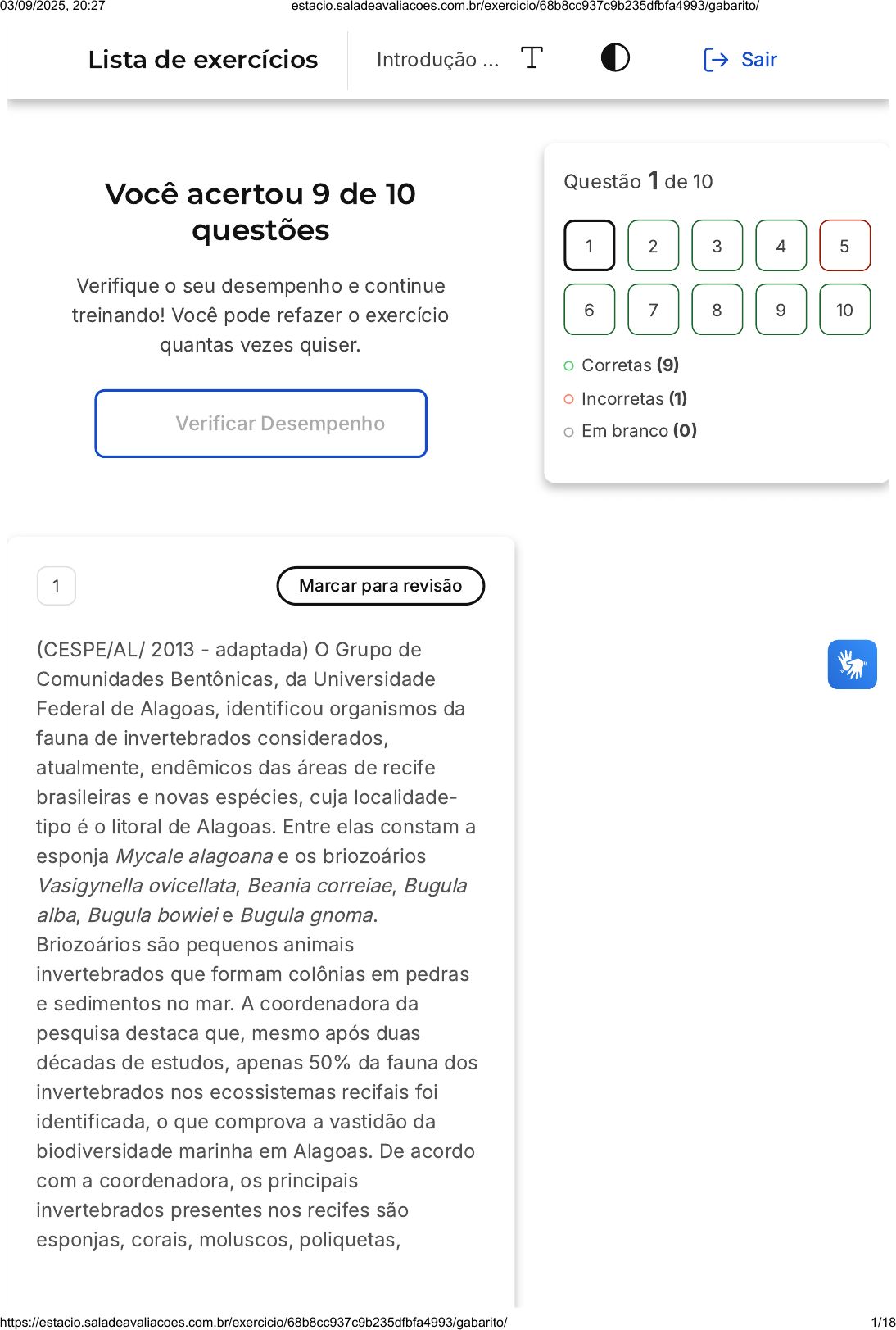 Você acertou 9 de 10 questões Verifique o seu desempenho e continue treinando! Você pode refazer o exercício quantas vezes quiser. Verificar Desempenho 1 Marcar para revisão (CESPE/AL/ 2013 - adaptada) O Grupo de Comunidades Bentônicas, da Universidade Federal de Alagoas, identificou organismos da fauna de invertebrados considerados, atualmente, endêmicos das áreas de recife brasileiras e novas espécies, cuja localidade- tipo é o litoral de Alagoas. Entre elas constam a esponja Mycale alagoana e os briozoários Vasigynella ovicellata, Beania correiae, Bugula alba, Bugula bowiei e Bugula gnoma. Briozoários são pequenos animais invertebrados que formam colônias em pedras e sedimentos no mar. A coordenadora da pesquisa destaca que, mesmo após duas décadas de estudos, apenas 50% da fauna dos invertebrados nos ecossistemas recifais foi identificada, o que comprova a vastidão da biodiversidade marinha em Alagoas. De acordo com a coordenadora, os principais invertebrados presentes nos recifes são esponjas, corais, moluscos, poliquetas, Questão 1 de 10 Corretas (9) Incorretas (1) Em branco (0) 1 2 3 4 5 6 7 8 9 10 Lista de exercícios Introdução … Sair 03/09/2025, 20:27 estacio.saladeavaliacoes.com.br/exercicio/68b8cc937c9b235dfbfa4993/gabarito/ https://estacio.saladeavaliacoes.com.br/exercicio/68b8cc937c9b235dfbfa4993/gabarito/ 1/18 A B C D E crustáceos, briozoários, equinodermos e ascídias. Marque a alternativa que apresenta as evidências evolutivas que demonstram que os equinodermos são os mais próximos filogeneticamente dos animais do filo Chordata. Placas calcáreas internas simulando um endoesqueleto. Celoma trimérico, além de uma simetria pentarradial. Espinhos dérmicos e notocórdio. Clivagem radial e blastóporo originando o ânus. Celoma esquizocélico e fendas faríngeas. Resposta correta Parabéns, você selecionou a alternativa correta. Confira o gabarito comentado! Gabarito Comentado Embora os equinodermos apresentem placas calcáreas, representando um esqueleto interno, há uma série de cordados que não as apresentam. Além disso, a simetria pentarradial é exclusiva dos equinodermos. Os espinhos dérmicos, de origem calcárea, também são um fator dos equinodermos, mas a notocorda é encontrada apenas em cordados. O celoma de ambos é enterocélico. No entanto, a 03/09/2025, 20:27 estacio.saladeavaliacoes.com.br/exercicio/68b8cc937c9b235dfbfa4993/gabarito/ https://estacio.saladeavaliacoes.com.br/exercicio/68b8cc937c9b235dfbfa4993/gabarito/ 2/18 A B alternativa que melhor representa a proximidade filogenética dos equinodermos com os animais do filo Chordata é a clivagem radial e o blastóporo originando o ânus, que são características compartilhadas por ambos os grupos, conforme indicado na alternativa D. 2 Marcar para revisão Uma substância inibidora da formação de tubulina foi jogada em um aquário de água salgada contendo espécimes de hemicordados enteropneustas. Em pouco tempo observou-se que os embriões desses hemicordados não conseguiam se desenvolver por completo e aqueles que se desenvolviam, quando chegavam à fase adulta, morriam de inanição. Compreendendo que a tubulina é uma das proteínas responsáveis pela construção de cílios e flagelos, marque a alternativa que apresenta o motivo da mortandade de embriões e juvenis desses seres. A tubulina é uma proteína imprescindível na alimentação de enteropneustas. Como ela deixou de ser depositada no substrato, eles não puderam mais se alimentar e acabaram morrendo. Como a tubulina é a responsável pela construção de flagelos, as estruturas flagelares do metassomo dos hemicordados não irão funcionar e, com isso, não poderão se locomover entre os túneis. 03/09/2025, 20:27 estacio.saladeavaliacoes.com.br/exercicio/68b8cc937c9b235dfbfa4993/gabarito/ https://estacio.saladeavaliacoes.com.br/exercicio/68b8cc937c9b235dfbfa4993/gabarito/ 3/18 C D E A tubulina é o componente principal da estrutura muscular do prossoma do animal. Se ela não for ativada, o prossoma não consegue formar uma probóscide eversível, dificultando a capacidade do animal captar alimentos no substrato. A tubulina é responsável por estruturar todas as cerdas em forma de espinho que facilitarão a locomoção do animal pelos tubos e canais que ele mesmo cria. Com isso, essa proteína irá ajudar no processo de escavação. Caso a tubulina não seja produzida, os cílios responsáveis pela deglutição não irão se formar e com isso, será difícil para o animal conseguir ingerir grandes quantidades de substrato. Sem essa ingestão, o animal poderá morrer de inanição. Resposta correta Parabéns, você selecionou a alternativa correta. Confira o gabarito comentado! Gabarito Comentado A tubulina é uma proteína que compõe a estrutura de cílios e flagelos. No caso dos hemicordados enteropneustas, a faringe desses animais é repleta de cílios que auxiliam na manipulação e deglutição do sedimento ingerido. Quando a produção de tubulina é inibida, esses cílios não se formam adequadamente, dificultando a ingestão de alimentos. Isso pode levar à inanição e, consequentemente, à morte do 03/09/2025, 20:27 estacio.saladeavaliacoes.com.br/exercicio/68b8cc937c9b235dfbfa4993/gabarito/ https://estacio.saladeavaliacoes.com.br/exercicio/68b8cc937c9b235dfbfa4993/gabarito/ 4/18 A B C animal. Portanto, a alternativa E é a correta, pois explica corretamente a relação entre a inibição da produção de tubulina e a morte dos hemicordados enteropneustas por inanição. 3 Marcar para revisão O sistema hidrovascular ou ambulacral de um equinodermo atua na locomoção, respiração, captura de alimento e como órgão sensorial, consistindo em um conjunto de canais no interior do corpo e de prolongamentos tubulares, os pés ambulacrais, que se projetam para fora através de poros. Com relação às principais características das classes de equinodermas, assinale a alternativa correta. As estr
