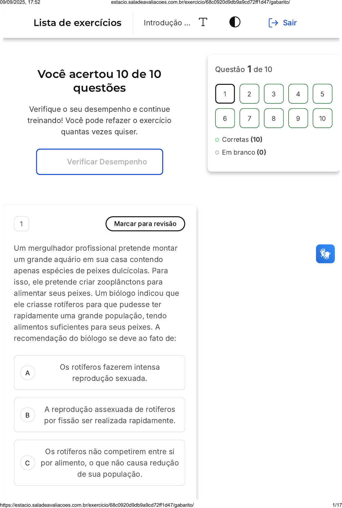 Você acertou 10 de 10 questões Verifique o seu desempenho e continue treinando! Você pode refazer o exercício quantas vezes quiser. Verificar Desempenho A B C 1 Marcar para revisão Um mergulhador profissional pretende montar um grande aquário em sua casa contendo apenas espécies de peixes dulcícolas. Para isso, ele pretende criar zooplânctons para alimentar seus peixes. Um biólogo indicou que ele criasse rotíferos para que pudesse ter rapidamente uma grande população, tendo alimentos suficientes para seus peixes. A recomendação do biólogo se deve ao fato de: Os rotíferos fazerem intensa reprodução sexuada. A reprodução assexuada de rotíferos por fissão ser realizada rapidamente. Os rotíferos não competirem entre si por alimento, o que não causa redução de sua população. Questão 1 de 10 Corretas (10) Em branco (0) 1 2 3 4 5 6 7 8 9 10 Lista de exercícios Introdução … Sair 09/09/2025, 17:52 estacio.saladeavaliacoes.com.br/exercicio/68c0920d9db9a9cd72ff1d47/gabarito/ https://estacio.saladeavaliacoes.com.br/exercicio/68c0920d9db9a9cd72ff1d47/gabarito/ 1/17 D E A maioria dos rotíferos ser de fêmeas partenogenéticas. As fêmeas de rotíferos serem fertilizadas pelos machos ainda quando estão em seus ovócitos. Resposta correta Parabéns, você selecionou a alternativa correta. Confira o gabarito comentado! Gabarito Comentado A alternativa correta é a D, que afirma que a maioria dos rotíferos é composta por fêmeas partenogenéticas. Isso significa que essas fêmeas são capazes de se reproduzir assexuadamente, sem a necessidade de fertilização por um macho. Essa característica permite que a população de rotíferos cresça rapidamente, tornando-os uma fonte de alimento eficiente para os peixes do aquário. É importante notar que, embora a reprodução assexuada por fissão seja um processo rápido, ela não é a principal forma de reprodução dos rotíferos, como mencionado na alternativa B. Portanto, a recomendação do biólogo para a criação de rotíferos se deve à predominância de fêmeas partenogenéticas nesse grupo, que permite uma rápida proliferação desses organismos. 2 Marcar para revisão 09/09/2025, 17:52 estacio.saladeavaliacoes.com.br/exercicio/68c0920d9db9a9cd72ff1d47/gabarito/ https://estacio.saladeavaliacoes.com.br/exercicio/68c0920d9db9a9cd72ff1d47/gabarito/ 2/17 A B C Em um mergulho noturno, pesquisadores observaram, junto ao plâncton, indivíduos que "dançavam¿ ao redor de outros microrganismos. Esses indivíduos embelezavam o cenário marinho noturno, pois apresentavam bioluminescência. Ao serem coletados, tais indivíduos foram triados e analisados. Um dos pesquisadores fez o seguinte desenho esquemático da região cefálica desses seres para auxiliar na identificação: Imagem: Wikimedia.org A partir da análise desse desenho, podemos identificar que tais indivíduos pertencem ao filo dos: Rotíferos. Platelmintos. Quetognatos. 09/09/2025, 17:52 estacio.saladeavaliacoes.com.br/exercicio/68c0920d9db9a9cd72ff1d47/gabarito/ https://estacio.saladeavaliacoes.com.br/exercicio/68c0920d9db9a9cd72ff1d47/gabarito/ 3/17 D E Cnidários. Anelídeos. Resposta correta Parabéns, você selecionou a alternativa correta. Confira o gabarito comentado! Gabarito Comentado Quetognatos apresentam espinhos orais articulados envolvidos por um capuz. No caso da figura, os espinhos estão abertos, em movimento para predação. Outra característica importante é o formato da cabeça, parecendo a ponta de uma seta. Rotíferos não apresentam tais espinhos, e sim cílios em sua corona. Platelmintos não têm essas estruturas orais. Alguns cestódeos podem apresentar ganchos, mas são diferentes das estruturas desenhadas. Cnidários não apresentam espinhos como os da figura. Alguns poliquetos anelídeos podem apresentar estruturas cerdosas para captura, mas o formato da cabeça é diferente. 3 Marcar para revisão A esquistossomose (barriga-d'água) caracteriza-se pela inflamação do fígado e do baço causada pelo verme Schistosoma mansoni (esquistossomo). O contágio ocorre depois que larvas do verme são liberadas na água pelo caramujo do gênero Biomphalaria, 09/09/2025, 17:52 estacio.saladeavaliacoes.com.br/exercicio/68c0920d9db9a9cd72ff1d47/gabarito/ https://estacio.saladeavaliacoes.com.br/exercicio/68c0920d9db9a9cd72ff1d47/gabarito/ 4/17 A B C D E seu hospedeiro intermediário, e penetram na pele humana. Após o diagnóstico, o tratamento tradicional utiliza medicamentos por via oral para matar o parasita dentro do corpo. Uma nova estratégia terapêutica baseia-se na utilização de uma vacina, feita a partir de uma proteína extraída do verme, que induz o organismo humano a produzir anticorpos para combater e prevenir a doença. Uma vantagem da vacina em relação ao tratamento tradicional é que ela poderá: Impedir a penetração do parasita pela pele. Eliminar o caramujo para que não haja contágio. Impedir o acesso do esquistossomo especificamente para o fígado. Eliminar o esquistossomo antes que ocorra contato com o organismo. Eliminar o esquistossomo dentro do organismo antes da manifestação de sintomas. Resposta correta Parabéns, você selecionou a alternativa correta. Confira o gabarito comentado! Gabarito Comentado A vacina, em comparação ao tratamento convencional, apresenta a vantagem de eliminar o esquistossomo no interior do 09/09/2025, 17:52 estacio.saladeavaliacoes.com.br/exercicio/68c0920d9db9a9cd72ff1d47/gabarito/ https://estacio.saladeavaliacoes.com.br/exercicio/68c0920d9db9a9cd72ff1d47/gabarito/ 5/17 A B C organismo antes que os sintomas da doença se manifestem. Isso ocorre porque a vacina induz o organismo humano a produzir anticorpos específicos que neutralizam as larvas cercarias do esquistossomo. É importante ressaltar que a vacina atua no organismo humano, portanto, não tem a capacidade de impedir a penetração das larvas na pele ou de exterminar os caramujos, que são os hospedeiros intermed