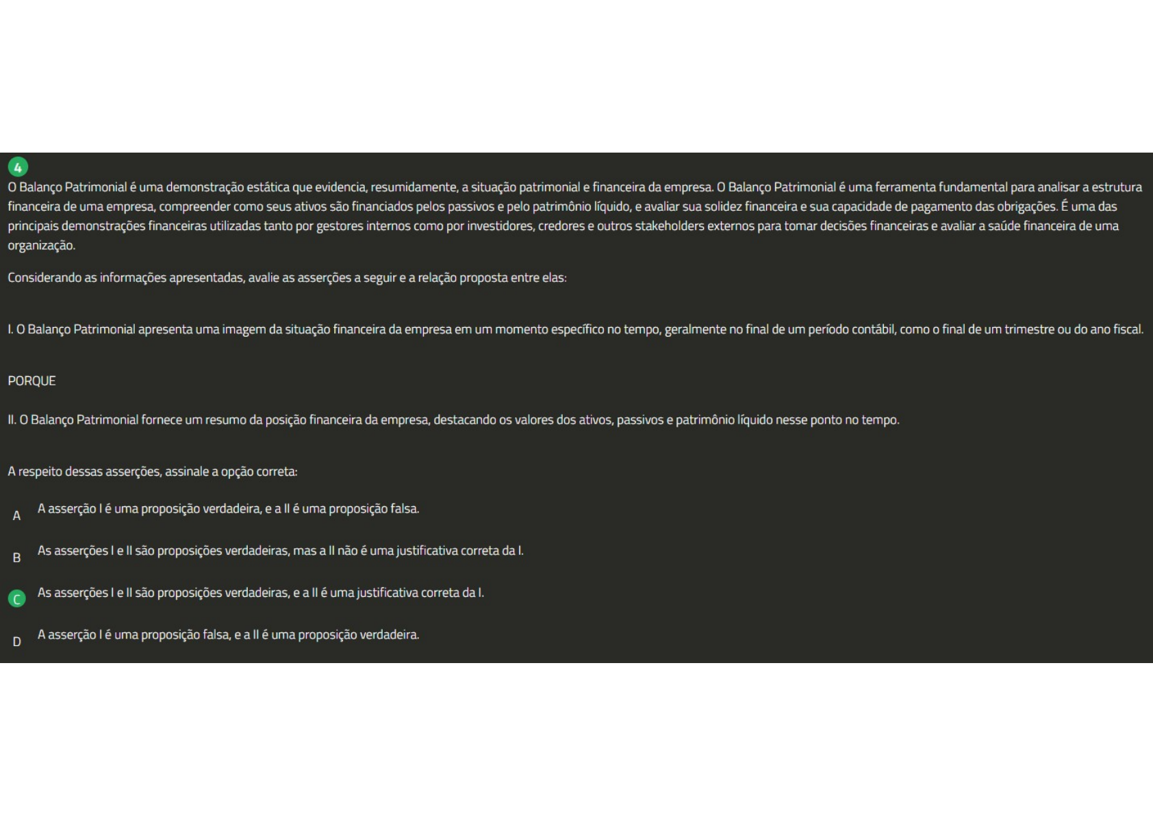 4 0 Balanço Patrimonial é uma demonstração estática que evidencia, resumidamente, a situação patrimonial e financeira da empresa. 0 Balanço Patrimonial é uma ferramenta fundamental para analisar a estrutura financeira de uma empresa, compreender como seus ativos são financiados pelos passivos e pelo patrimônio líquido, e avaliar sua solidez financeira e sua capacidade de pagamento das obrigações. É uma das principais demonstrações financeiras utilizadas tanto por gestores internos como por investidores, credores e outros stakeholders externos para tomar decisões financeiras e avaliar a saúde financeira de uma organização. Considerando as informações apresentadas, avalie as asserções a seguir e a relação proposta entre elas: I. 0 Balanço Patrimonial apresenta uma imagem da situação financeira da empresa em um momento específico no tempo, geralmente no final de um período contábil, como final de um trimestre ou do ano fiscal. PORQUE II. 0 Balanço Patrimonial fornece um resumo da posição financeira da empresa, destacando valores dos ativos, passivos e patrimônio líquido nesse ponto no tempo. A respeito dessas asserções, assinale a opção correta: A A asserção lé uma proposição verdadeira, e a é uma proposição falsa. As asserções e são proposições verdadeiras, mas a II não é uma justificativa correta da I. As asserções I e são proposições verdadeiras, e a II é uma justificativa correta da I. D A asserção é uma proposição falsa, e a é uma proposição verdadeira.