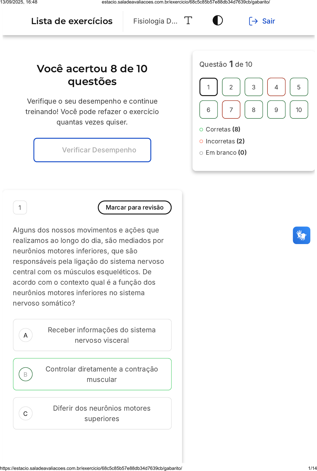 Você acertou 8 de 10 questões Verifique o seu desempenho e continue treinando! Você pode refazer o exercício quantas vezes quiser. Verificar Desempenho A B C 1 Marcar para revisão Alguns dos nossos movimentos e ações que realizamos ao longo do dia, são mediados por neurônios motores inferiores, que são responsáveis pela ligação do sistema nervoso central com os músculos esqueléticos. De acordo com o contexto qual é a função dos neurônios motores inferiores no sistema nervoso somático? Receber informações do sistema nervoso visceral Controlar diretamente a contração muscular Diferir dos neurônios motores superiores Questão 1 de 10 Corretas (8) Incorretas (2) Em branco (0) 1 2 3 4 5 6 7 8 9 10 Lista de exercícios Fisiologia D… Sair 13/09/2025, 16:48 estacio.saladeavaliacoes.com.br/exercicio/68c5c85b57e88db34d7639cb/gabarito/ https://estacio.saladeavaliacoes.com.br/exercicio/68c5c85b57e88db34d7639cb/gabarito/ 1/14 D E Apontar diretamente para o cérebro Definir a musculatura que será usado no momento das ações Resposta correta Parabéns, você selecionou a alternativa correta. Confira o gabarito comentado! Gabarito Comentado Os neurônios motores inferiores são responsáveis por controlar diretamente a contração muscular. Os neurônios motores inferiores, também conhecidos como neurônios motores alfa, são responsáveis por enviar impulsos nervosos para estimular a contração muscular. Eles são considerados a conexão final entre o sistema nervoso central e os músculos esqueléticos do corpo, sendo essenciais para a execução de movimentos voluntários e reflexos motores. 2 Marcar para revisão Marque a opção que apresenta os órgãos receptores sensoriais implicados na propriocepção muscular: 13/09/2025, 16:48 estacio.saladeavaliacoes.com.br/exercicio/68c5c85b57e88db34d7639cb/gabarito/ https://estacio.saladeavaliacoes.com.br/exercicio/68c5c85b57e88db34d7639cb/gabarito/ 2/14 A B C D E Órgão Tendinoso de Golgi e Fuso Neuromuscular Órgão Tendinoso de Golgi e Corpúsculo de Rufini Órgão Tendinoso de Golgi e Corpúsculo de Paccini Fuso Neuromuscular e Corpúsculo de Rufini Fuso Neuromuscular e Corpúsculo de Paccini Resposta correta Parabéns, você selecionou a alternativa correta. Confira o gabarito comentado! Gabarito Comentado A propriocepção muscular é um sentido que informa ao sistema nervoso central sobre a posição e movimento dos músculos. Os órgãos receptores sensoriais envolvidos nesse processo são o Órgão Tendinoso de Golgi e o Fuso Neuromuscular. O Órgão Tendinoso de Golgi é um receptor sensorial que responde à alteração na tensão muscular, enquanto o Fuso Neuromuscular é um receptor sensorial que responde à alteração no comprimento do músculo. Portanto, a alternativa correta é a opção A: 13/09/2025, 16:48 estacio.saladeavaliacoes.com.br/exercicio/68c5c85b57e88db34d7639cb/gabarito/ https://estacio.saladeavaliacoes.com.br/exercicio/68c5c85b57e88db34d7639cb/gabarito/ 3/14 A B C D E Órgão Tendinoso de Golgi e Fuso Neuromuscular. 3 Marcar para revisão Os gânglios simpáticos são estruturas do sistema nervoso autônomo que contêm os corpos celulares dos neurônios pós- ganglionares do sistema nervoso simpático. Onde podemos localizar os gânglios simpáticos? Ao longo dos corpos da coluna vertebral da parte superior cervical até o cóccix No abdômen adjacente ao cóccix No abdômen adjacente à aorta abdominal No abdômen adjacente ao fígado Na cabeça Resposta correta Parabéns, você selecionou a alternativa correta. Confira o gabarito comentado! Gabarito Comentado As fibras simpáticas pré-ganglionares passam sucessivamente através das raízes 13/09/2025, 16:48 estacio.saladeavaliacoes.com.br/exercicio/68c5c85b57e88db34d7639cb/gabarito/ https://estacio.saladeavaliacoes.com.br/exercicio/68c5c85b57e88db34d7639cb/gabarito/ 4/14 A B ventrais (referidas como o fluxo toracolombar), dos nervos espinhais, ramos de nervos espinais e do tronco simpático. As fibras terminam em (1) gânglios da cadeia simpática (tronco) ou (2) eles passam pela corrente e entram nos nervos viscerais, que vão para os gânglios pré-vertebrais (colaterais). Os gânglios, que estão localizados ao longo dos corpos da coluna vertebral da parte superior cervical através dos níveis coccígeos, recebem suas entradas exclusivamente da região toracolombar. 4 Marcar para revisão As fibras musculares vermelhas e brancas apresentam diferenças significativas em sua estrutura e função. Essas diferenças são importantes para entender a fisiologia muscular e como diferentes atividades físicas podem afetar o desempenho muscular. Quais são as principais diferenças entre as fibras musculares vermelhas e brancas? As fibras vermelhas são mais rápidas e fortes do que as brancas As fibras brancas têm mais mitocôndrias e enzimas especializadas para o metabolismo oxidativo do que as vermelhas 13/09/2025, 16:48 estacio.saladeavaliacoes.com.br/exercicio/68c5c85b57e88db34d7639cb/gabarito/ https://estacio.saladeavaliacoes.com.br/exercicio/68c5c85b57e88db34d7639cb/gabarito/ 5/14 C D E As fibras vermelhas utilizam principalmente o metabolismo anaeróbio, enquanto as brancas utilizam principalmente o metabolismo oxidativo As fibras vermelhas encolhem relativamente devagar, mas podem continuar encolhendo por muito tempo sem fadiga, enquanto as fibras brancas se cansam rapidamente As fibras brancas são encontradas apenas em músculos associados a reflexos de escape. Resposta incorreta Opa! A alternativa correta é a letra D. Confira o gabarito comentado! Gabarito Comentado As fibras musculares vermelhas possuem mais mitocôndrias e enzimas especializadas para o metabolismo oxidativo, o que lhes permite gerar energia de forma mais eficiente e duradoura, sem fadiga. Já as fibras brancas quase não têm mitocôndrias e utilizam principalmente o metabolismo anaeróbio, o que as torna mais rápidas e fortes, porém cansam-se rapidamente. 5 Marc