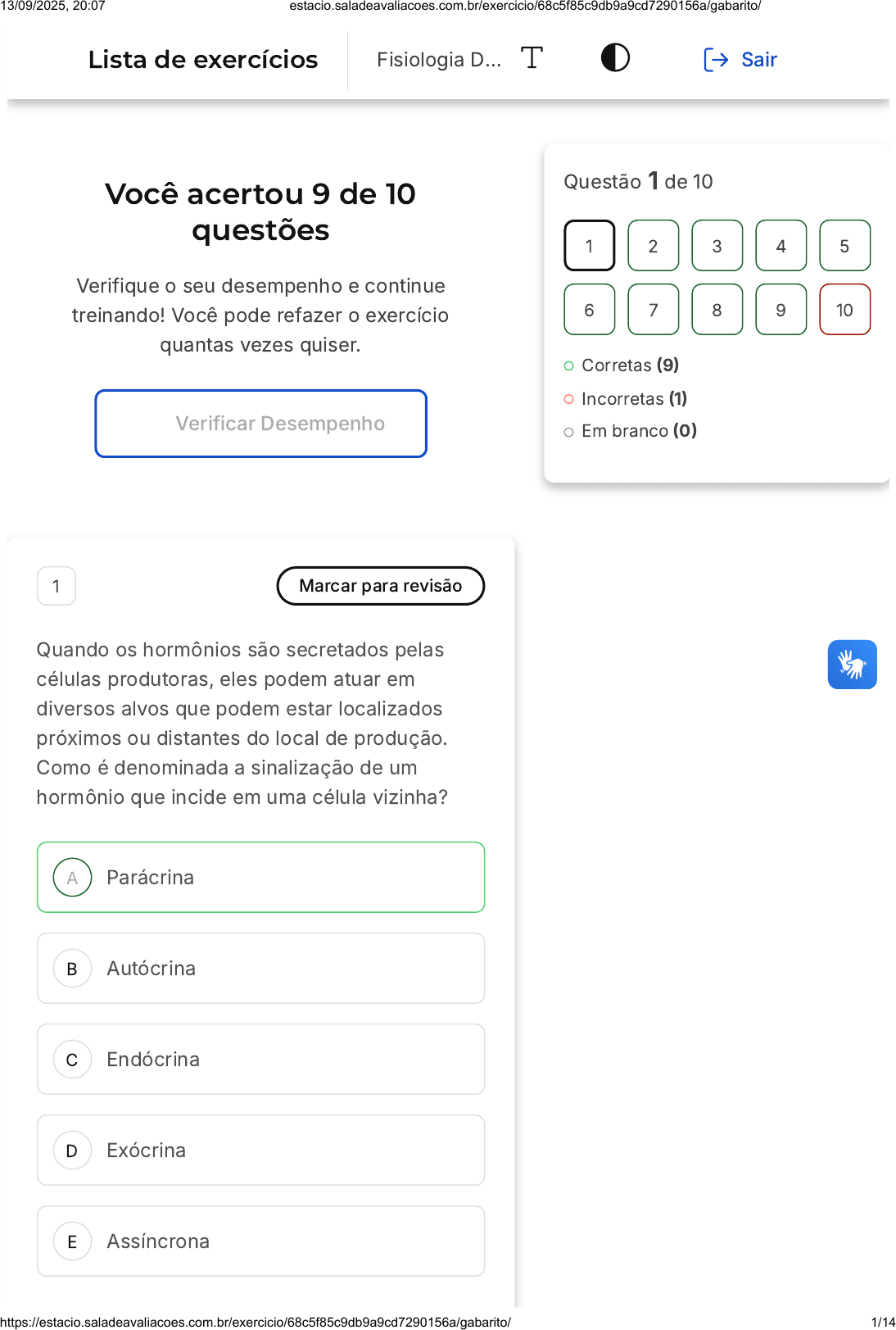 Você acertou 9 de 10 questões Verifique o seu desempenho e continue treinando! Você pode refazer o exercício quantas vezes quiser. Verificar Desempenho A B C D E 1 Marcar para revisão Quando os hormônios são secretados pelas células produtoras, eles podem atuar em diversos alvos que podem estar localizados próximos ou distantes do local de produção. Como é denominada a sinalização de um hormônio que incide em uma célula vizinha? Parácrina Autócrina Endócrina Exócrina Assíncrona Questão 1 de 10 Corretas (9) Incorretas (1) Em branco (0) 1 2 3 4 5 6 7 8 9 10 Lista de exercícios Fisiologia D… Sair 13/09/2025, 20:07 estacio.saladeavaliacoes.com.br/exercicio/68c5f85c9db9a9cd7290156a/gabarito/ https://estacio.saladeavaliacoes.com.br/exercicio/68c5f85c9db9a9cd7290156a/gabarito/ 1/14 Resposta correta Parabéns, você selecionou a alternativa correta. Confira o gabarito comentado! Gabarito Comentado A sinalização parácrina é aquela em que os hormônios atuam em células vizinhas ao local de produção. Dessa forma, a alternativa correta é a "Parácrina". As demais alternativas representam outros tipos de sinalização hormonal: a autócrina ocorre quando a célula que produz o hormônio é também a que responde a ele; a endócrina se dá quando o hormônio é liberado na corrente sanguínea e atua em células distantes; a exócrina ocorre quando o hormônio é liberado em ductos que levam a um local específico do corpo; e a assíncrona não é um termo usado para descrever a sinalização hormonal. 2 Marcar para revisão A sinalização é a forma que a célula possui de se comunicar com a outra célula, a partir de emissão de sinais. A sinalização por meio dos hormônios acontece através de processos intracelulares com características de cascatas de sinalização com mensagens passadas em sequência. A sinalização que ocorre com proteínas inseridas na membrana que atuam ativas ou inibidas pela proteínas G, com função de quebra de um lipídio que se encontra na membrana, é conhecido como: 13/09/2025, 20:07 estacio.saladeavaliacoes.com.br/exercicio/68c5f85c9db9a9cd7290156a/gabarito/ https://estacio.saladeavaliacoes.com.br/exercicio/68c5f85c9db9a9cd7290156a/gabarito/ 2/14 A B C D E Segundos mensageiros. Sistema da adenilato ciclase-AMPc. Sistema das fosfolipases. Sistema Cálcio-Calmodulina. Sistema íons. Resposta correta Parabéns, você selecionou a alternativa correta. Confira o gabarito comentado! Gabarito Comentado Assim como a adenilato ciclase, as fosfolipases também são proteínas inseridas nas membranas que podem ser ativas ou inibidas pela proteína G. Existem diferentes isoformas de fosfolipase, cuja função envolve principalmente a quebra de fosfolipídios de membrana, especialmente o fosfatidilinositol bifosfato (PIP2). 3 Marcar para revisão Alguns neurônios do hipotálamo sintetizam e secretam hormônios que tem a função de controlar outros hormônios na hipófise. Diante da vasta quantidade de hormônios produzidos 13/09/2025, 20:07 estacio.saladeavaliacoes.com.br/exercicio/68c5f85c9db9a9cd7290156a/gabarito/ https://estacio.saladeavaliacoes.com.br/exercicio/68c5f85c9db9a9cd7290156a/gabarito/ 3/14 A B C D E que atuam na regulação de outras glândulas, a hipófise já foi chamada de glândula mestra. Diante do contexto analise as alternativas que indique três hormônios produzidos pela hipófise que agem em outras glândulas: Adrenocorticotrófico, Tireoideotrópico, Luteinizante. Luteinizante, Calcitonina e Glicocorticoides. Glicocorticoides, Paratormônio e Adrenalina. Adrenalina, Tiroxina e Triiodotironina. Triiodotironina, Mineralocorticóides e Adrenocorticotrófico. Resposta correta Parabéns, você selecionou a alternativa correta. Confira o gabarito comentado! Gabarito Comentado Neurônios especializados no hipotálamo sintetizam e secretam hormônios, onde suas funções são controlar a liberação de outros hormônios na hipófise, especialmente na adeno-hipófise. Em alguns casos, os neuro-hormônios produzidos no hipotálamo, como a ocitocina e o hormônio antidiurético, são secretos diretamente na corrente sanguínea através da hipófise posterior. 13/09/2025, 20:07 estacio.saladeavaliacoes.com.br/exercicio/68c5f85c9db9a9cd7290156a/gabarito/ https://estacio.saladeavaliacoes.com.br/exercicio/68c5f85c9db9a9cd7290156a/gabarito/ 4/14 A B C D E Hormônios como: Adrenocorticotrófico, Tireoideotrópico, Luteinizante. 4 Marcar para revisão Os hormônios podem ser responsáveis por várias ações musculares. O hormônio produzido pelo hipotálamo e armazenado pela neuro-hipófise que atua estimulando a contração dos músculos do útero na hora do parto é: Insulina. Hormônio luteinizante. Hormônio folículo-estimulante. Prolactina. Ocitocina. Resposta correta Parabéns, você selecionou a alternativa correta. Confira o gabarito comentado! Gabarito Comentado A liberação da ocitocina pela hipófise posterior durante o trabalho de parto. 13/09/2025, 20:07 estacio.saladeavaliacoes.com.br/exercicio/68c5f85c9db9a9cd7290156a/gabarito/ https://estacio.saladeavaliacoes.com.br/exercicio/68c5f85c9db9a9cd7290156a/gabarito/ 5/14 A B C D E Nesse caso, o papel da ocitocina é provocar as contrações uterinas que empurram o bebê contra o colo do útero. Essa ação mecânica de estiramento do colo uterino é interpretada pelo hipotálamo e provoca a liberação de mais ocitocina, potencializando as contrações uterinas, até que haja o nascimento do bebê. 5 Marcar para revisão Quanto ao controle e coordenação das respostas metabólicas é correto afirmar que: Um hormônio é capaz de controlar todas as células do organismo. Hormônios são produzidos exclusivamente pelas glândulas endócrinas. Uma célula é alvo para um hormônio quando possui bombas de Na /K .2+ + Um hormônio controla apenas uma resposta celular. O metabolismo pode ser controlado através da atividade das enzimas. Resposta correta Parabéns, você selec