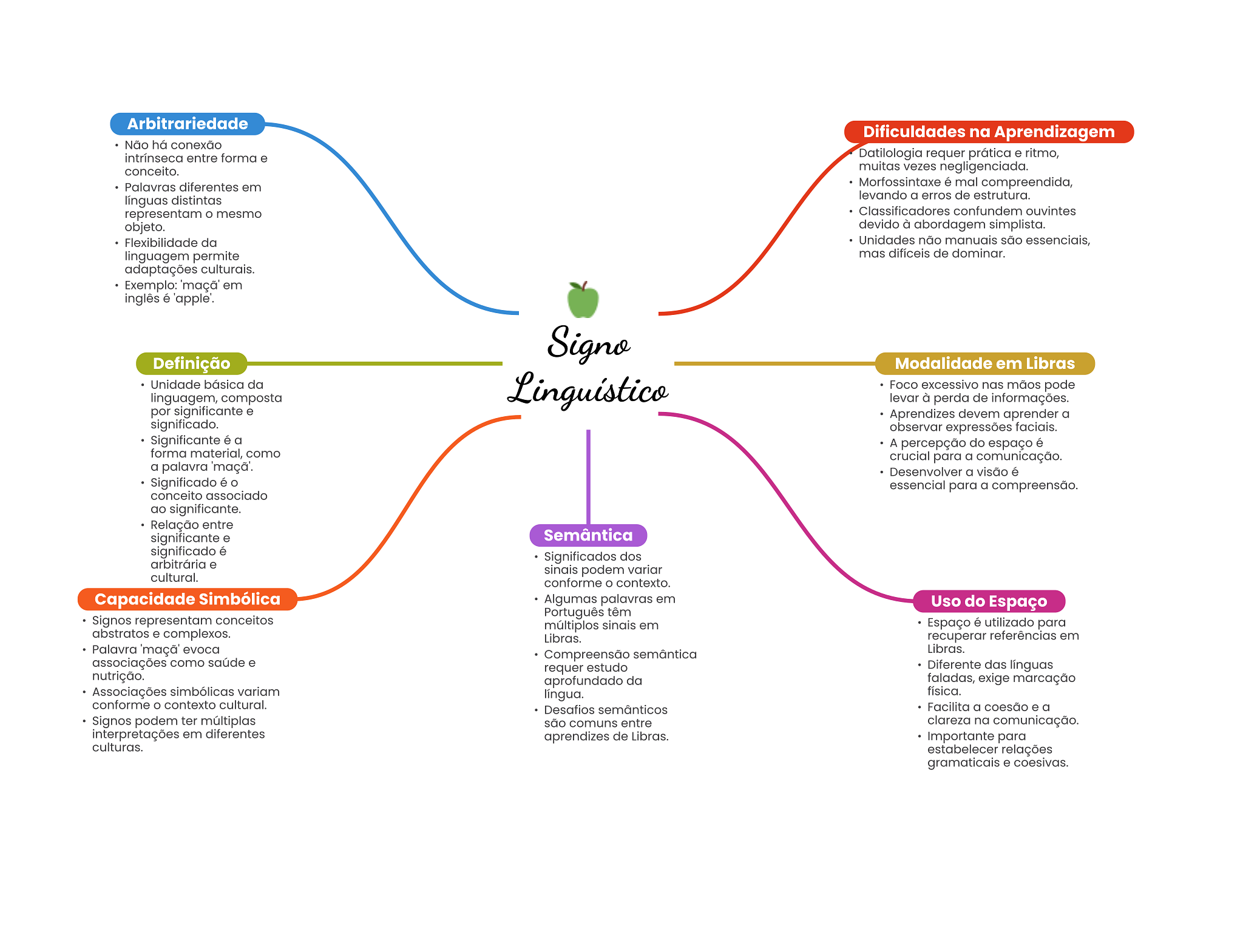 Arbitrariedade Dificuldades na Aprendizagem Não há conexão intrínseca entre forma e Datilologia requer prática e ritmo, conceito. muitas vezes negligenciada. Palavras diferentes em Morfossintaxe é mal compreendida, levando a erros de estrutura. distintas representam mesmo Classificadores confundem ouvintes objeto. devido à abordagem simplista. Flexibilidade da Unidades não manuais são essenciais, linguagem permite mas difíceis de dominar. adaptações culturais. Exemplo: em inglês é 'apple'. Signo Definição Modalidade em Libras Unidade básica da linguagem, composta Linguístico Foco excessivo nas mãos pode levar à perda de informações. por significante e Aprendizes devem aprender a significado. observar expressões faciais. Significante é a A percepção do espaço é forma material, como crucial para a comunicação. a palavra Desenvolver a visão é Significado é O essencial para a compreensão. conceito associado ao significante. Relação entre significante e Semântica significado é Significados dos arbitrária e sinais podem variar cultural. conforme O contexto. Capacidade Simbólica Algumas palavras em Uso do Espaço Português têm Signos representam conceitos múltiplos sinais em Espaço é utilizado para abstratos e complexos. Libras. recuperar referências em Palavra evoca Libras. Compreensão semântica associações como saúde e requer estudo Diferente das línguas nutrição. aprofundado da faladas, exige marcação Associações simbólicas variam língua. física. conforme contexto cultural. Desafios semânticos Facilita a coesão e a Signos podem ter múltiplas são comuns entre clareza na comunicação. interpretações em diferentes aprendizes de Libras. Importante para culturas. estabelecer relações gramaticais e coesivas.