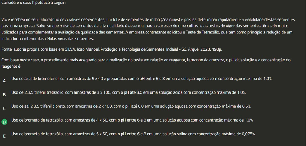 Considere 0 caso hipotético a seguir: Você recebeu no seu Laboratório de Análises de Sementes, um lote de sementes de milho (Zea mays) e precisa determinar rapidamente a viabilidade destas sementes para uma empresa. Sabe-se que uso de sementes de alta qualidade é essencial para sucesso de uma cultura e testes de vigor das sementes têm sido muito utilizados para complementar a avaliação da qualidade das sementes. A empresa contratante solicitou Teste de Tetrazólio, que tem como princípio a redução de um indicador no interior das células vivas das sementes. Fonte: autoria própria com base em SILVA, João Manoel. Produção e Tecnologia de Sementes. Indaial SC: Arqué, 2023. Com base neste caso, procedimento mais adequado para a realização do teste em relação ao reagente, tamanho da amostra, pH da solução e a concentração do reagente é: A Uso de azul de bromofenol, com amostras de 5 X 40 e preparadas com pH entre 6 e 8 em uma solução aquosa com concentração máxima de 1,0%. Uso de 2,3,5 trifenil tretazólio, com amostras de X 100, com pH até 8,0 em uma solução ácida com concentração máxima de 1,0%. Uso de sal 2,3,5 trifenil cloreto, com amostras de 2 X 100, com pH até 6,0 em uma solução aquosa com concentração máxima de 0,5%. D Uso de brometo de tetrazólio, com amostras de 4 X 50, com 0 pH entre 6 e 8 em uma solução aquosa com concentração máxima de 1,0%. E Uso de brometo de tetrazólio, com amostras de 5 X 50, com 0 pH entre 6 e 8 em uma solução salina com concentração máxima de 0,075%.