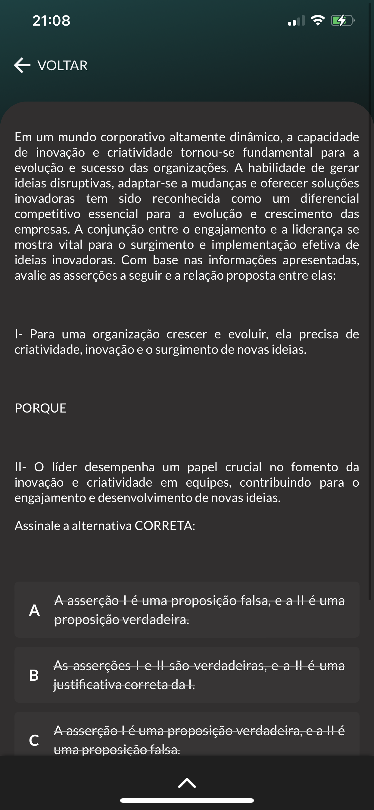 21:08 4 VOLTAR Em um mundo corporativo altamente dinâmico, a capacidade de inovação e criatividade tornou-se fundamental para a evolução e sucesso das organizações. A habilidade de gerar ideias disruptivas, adaptar-se a mudanças e oferecer soluções inovadoras tem sido reconhecida como um diferencial competitivo essencial para a evolução e crescimento das empresas. A conjunção entre engajamento e a liderança se mostra vital para surgimento e implementação efetiva de ideias inovadoras. Com base nas informações apresentadas, avalie as asserções a seguir e a relação proposta entre elas: I- Para uma organização crescer e evoluir, ela precisa de criatividade, inovação e surgimento de novas ideias. PORQUE II- líder desempenha um papel crucial no fomento da inovação e criatividade em equipes, contribuindo para o engajamento e desenvolvimento de novas ideias. Assinale a alternativa CORRETA: A asserção lé uma proposição falsa, e a H é uma A proposição verdadeira. As asserções le são verdadeiras, e a é uma justificativa correta da A asserção lé uma proposição verdadeira, e a H é c uma proposição falsa.