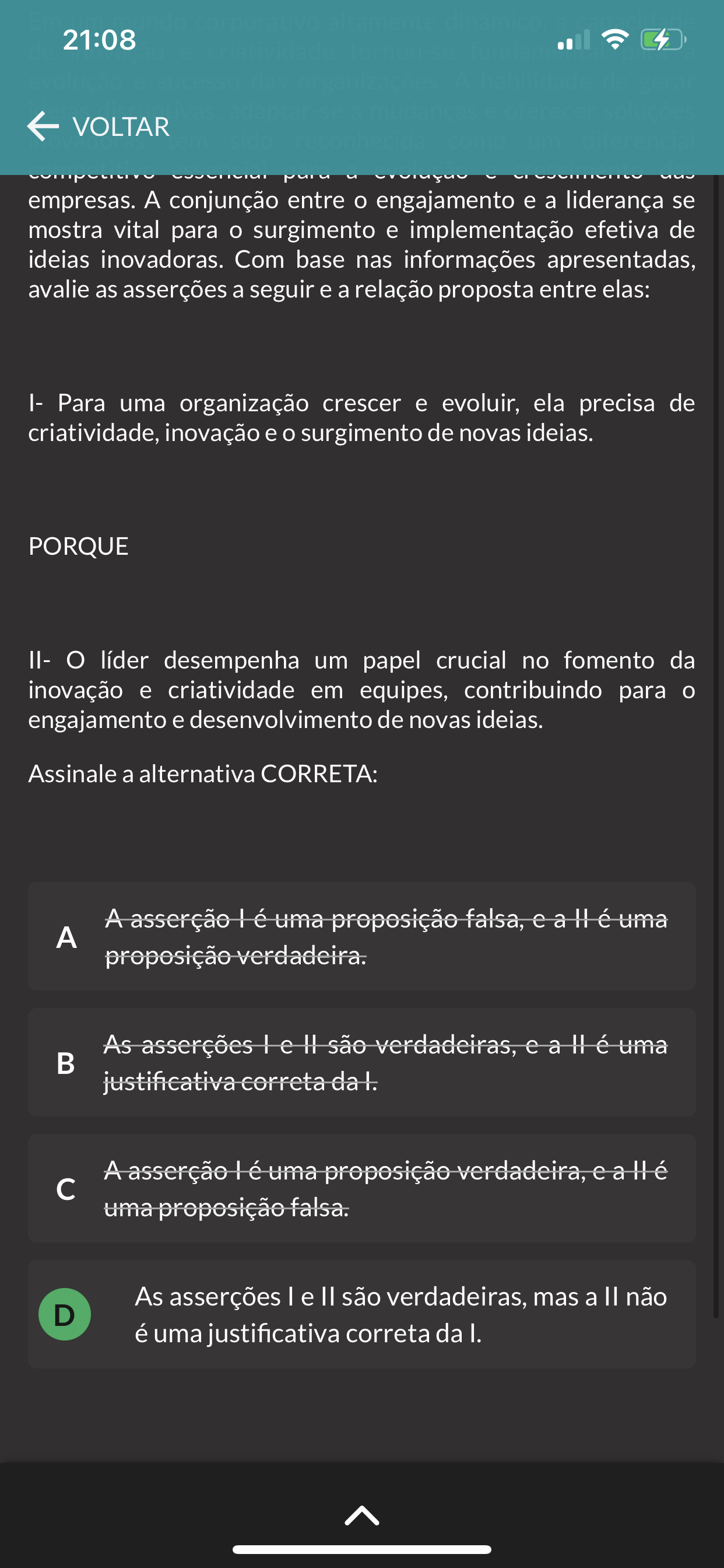 21:08 VOLTAR essencial para crescimento das empresas. A conjunção entre engajamento e a liderança se mostra vital para surgimento e implementação efetiva de ideias inovadoras. Com base nas informações apresentadas, avalie as asserções a seguir e a relação proposta entre elas: I- Para uma organização crescer e evoluir, ela precisa de criatividade, inovação e surgimento de novas ideias. PORQUE II- líder desempenha um papel crucial no fomento da inovação e criatividade em equipes, contribuindo para engajamento e desenvolvimento de novas ideias. Assinale a alternativa CORRETA: A asserção lé uma proposição falsa, e a é uma A proposição verdadeira. As asserções le são verdadeiras, e a é uma justificativa correta da +. A asserção lé uma proposição verdadeira, e a é c uma proposição falsa. As asserções e são verdadeiras, mas a II não D é uma justificativa correta da I.