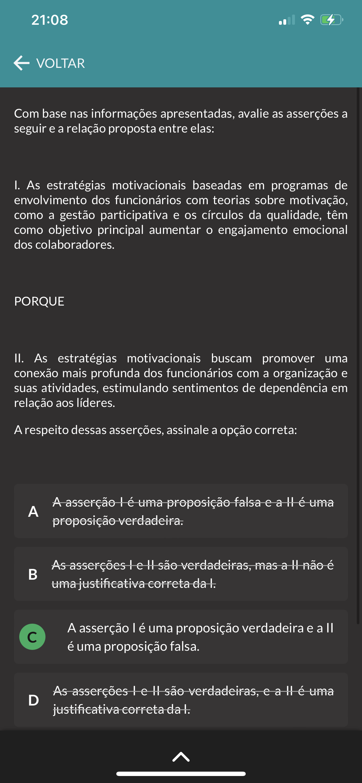 21:08 VOLTAR Com base nas informações apresentadas, avalie as asserções a seguir e a relação proposta entre elas: I. As estratégias motivacionais baseadas em programas de envolvimento dos funcionários com teorias sobre motivação, como a gestão participativa e os círculos da qualidade, têm como objetivo principal aumentar engajamento emocional dos colaboradores. PORQUE II. As estratégias motivacionais buscam promover uma conexão mais profunda dos funcionários com a organização e suas atividades, estimulando sentimentos de dependência em relação aos líderes. A respeito dessas asserções, assinale a opção correta: A asserção lé uma proposição falsa e a H é uma A proposição verdadeira. As asserções le são verdadeiras, mas a H não é uma justificativa correta da A asserção é uma proposição verdadeira e a II é uma proposição falsa. As asserções le são verdadeiras, e a II é uma D justificativa correta da I.