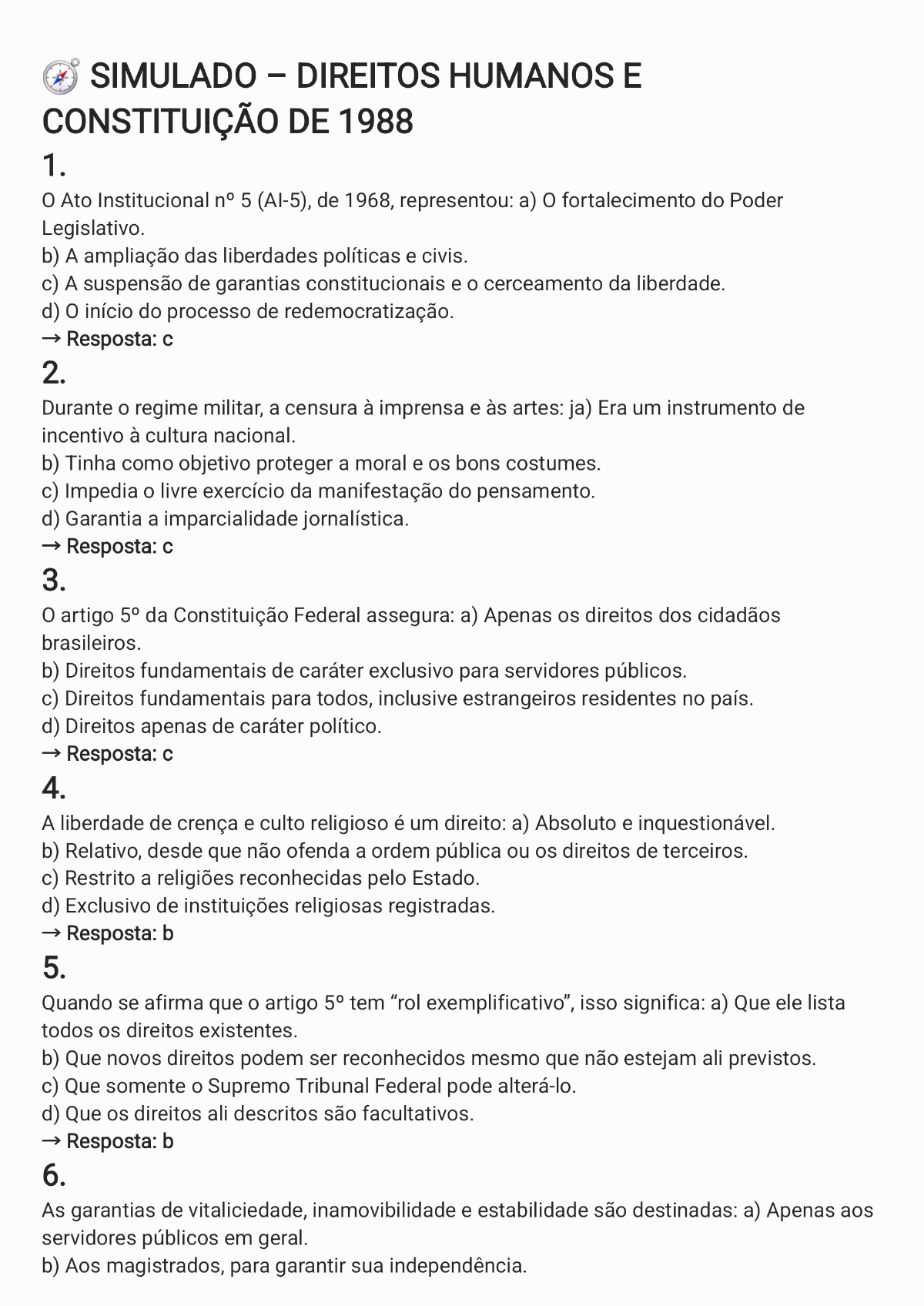 SIMULADO DIREITOS HUMANOS E CONSTITUIÇÃO DE 1988 1. O Ato Institucional n° 5 (AI-5), de 1968, representou: a) fortalecimento do Poder Legislativo. b) A ampliação das liberdades políticas e civis. c) A suspensão de garantias constitucionais e o cerceamento da liberdade. d) início do processo de redemocratização. Resposta: c 2. Durante regime militar, a censura à imprensa e às artes: ja) Era um instrumento de incentivo à cultura nacional. b) Tinha como objetivo proteger a moral e os bons costumes. c) Impedia livre exercício da manifestação do pensamento. d) Garantia a imparcialidade jornalística. Resposta: c 3. artigo 5° da Constituição Federal assegura: a) Apenas os direitos dos cidadãos brasileiros. b) Direitos fundamentais de caráter exclusivo para servidores públicos. c) Direitos fundamentais para todos, inclusive estrangeiros residentes no país. d) Direitos apenas de caráter político. Resposta: c 4. A liberdade de crença e culto religioso é um direito: a) Absoluto e inquestionável. b) Relativo, desde que não ofenda a ordem pública ou os direitos de terceiros. c) Restrito a religiões reconhecidas pelo Estado. d) Exclusivo de instituições religiosas registradas. Resposta: b 5. Quando se afirma que o artigo 5° tem "rol exemplificativo", isso significa: a) Que ele lista todos os direitos existentes. b) Que novos direitos podem ser reconhecidos mesmo que não estejam ali previstos. c) Que somente Supremo Tribunal Federal pode alterá-lo. d) Que os direitos ali descritos são facultativos. Resposta: b 6. As garantias de vitaliciedade, inamovibilidade e estabilidade são destinadas: a) Apenas aos servidores públicos em geral. b) Aos magistrados, para garantir sua independência.c) Aos parlamentares, para assegurar imunidade política. d) Aos militares, para evitar punições indevidas. Resposta: b 7. direito de resposta proporcional ao agravo está relacionado diretamente: a) À liberdade de imprensa. b) À liberdade de associação. c) Ao direito de propriedade. d) Ao direito político de votar e ser votado. Resposta: 8. princípio da inviolabilidade da casa, previsto no artigo 5°, significa que: a) Qualquer autoridade pode adentrar sem mandado judicial. b) A casa pode ser invadida apenas durante dia. c) Ninguém pode entrar sem consentimento, salvo em casos previstos em lei. d) morador precisa autorizar sempre a polícia. Resposta: c 9. AI-5 permitia ao presidente da República: a) Promover a liberdade de expressão. b) Fechar Congresso Nacional e cassar mandatos. c) Reduzir os poderes do Executivo. d) Nomear juízes de forma vitalícia. Resposta: b 10. direito de ir e vir está garantido: a) Somente em tempos de guerra. b) Somente aos cidadãos maiores de 18 anos. c) Em tempos de paz, conforme previsto na Constituição. d) Somente mediante autorização judicial. Resposta: c 11. direito à propriedade deve atender: a) Apenas aos interesses do proprietário. b) À sua função social. c) Ao lucro e à exploração econômica. d) Ao interesse do mercado imobiliário. Resposta: b 12. A liberdade de manifestação do pensamento é garantida, mas: a) Proíbe críticas ao governo. b) É vedada sob anonimato. c) Exige autorização prévia. d) É limitada à internet. Resposta: b13. direito à vida, à liberdade, à igualdade, à segurança e à propriedade são: a) Direitos civis e políticos. b) Direitos fundamentais individuais e coletivos. c) Direitos sociais. d) Direitos de nacionalidade. Resposta: b 14. De acordo com a Constituição, homens e mulheres: a) São iguais em direitos e obrigações. b) Possuem deveres distintos conforme papel social. c) Devem seguir padrões culturais determinados. d) São iguais apenas no exercício político. Resposta: 15. habeas corpus é um instrumento jurídico que visa: a) Garantir direito à propriedade. b) Obter liberdade diante de prisão ilegal. c) Regular direito de voto. d) Defender direito à privacidade. Resposta: b 16. Os direitos sociais visam: a) Aumentar a competitividade econômica. b) Melhorar as condições de vida e reduzir desigualdades. c) Regular apenas a previdência social. d) Privilegiar a iniciativa privada. Resposta: b 17. A criação de associações depende: a) De autorização judicial. b) Da aprovação do Congresso Nacional. c) Apenas da vontade dos interessados, para fins lícitos. d) De registro no Ministério Público. Resposta: c 18. Durante a ditadura militar, os direitos humanos: a) Foram fortalecidos. b) Foram suprimidos em nome da segurança nacional. c) Eram prioridade do governo. d) Garantiam liberdade plena. Resposta: b 19. A função social da propriedade tem relação direta com: a) A concentração de renda. b) A promoção do bem coletivo e da justiça social. c) direito de herança.d) A exploração capitalista. Resposta: b 20. direito à privacidade inclui: a) A violação de correspondências. b) sigilo de comunicações, dados e mensagens. c) controle do Estado sobre e-mails pessoais. d) A censura prévia de informações. Resposta: b 21. A Constituição de 1988 ficou conhecida como: a) Constituição Monárquica. b) Constituição Cidadã. c) Constituição Militar. d) Constituição do Império. Resposta: b 22. Os direitos políticos garantem: a) acesso à saúde pública. b) direito de votar e ser votado. c) direito à liberdade religiosa. d) acesso à justiça gratuita. Resposta: b 23. A censura durante AI-5 atingia: a) Apenas jornais estrangeiros. b) Toda forma de expressão artística, literária e jornalística. c) Somente produções de oposição política. d) Apenas programas televisivos. Resposta: b 24. direito de associação não permite: a) A criação de sindicatos. b) A formação de associações paramilitares. c) A existência de ONGs. d) A organização de cooperativas. Resposta: b 25. Quem violar a imagem ou a honra de outrem poderá: a) Ser punido apenas com advertência. b) Responder civilmente e pagar indenização. c) Ser protegido pela liberdad
