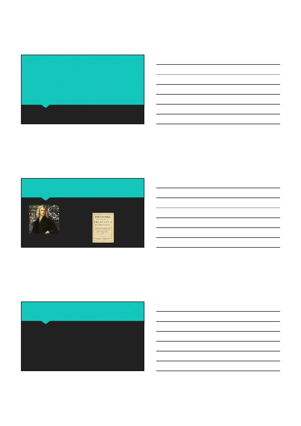 24/02/2025 1 Leis de Newton e Biomecânica do Equilibrio Leis de Newton e Biomecânica do Equilibrio Profa: Sandra AlibertiProfa: Sandra Aliberti LEIS DE NEWTON e suas relações com o movimento humano LEIS DE NEWTON e suas relações com o movimento humano Sir Isaac Newton (1642- 1727) descobriu muitas das relações que fundamentam o campo da mecânica moderna. Sir Isaac Newton (1642- 1727) descobriu muitas das relações que fundamentam o campo da mecânica moderna. LEIS DE NEWTON e suas relações com o movimento humano LEIS DE NEWTON e suas relações com o movimento humano Primeira Lei de Newton / Princípio da Inércia Segunda Lei de Newton / Princípio da Dinâmica(f=m.a) Terceira Lei de Newton / Princípio da ação e reação Primeira Lei de Newton / Princípio da Inércia Segunda Lei de Newton / Princípio da Dinâmica(f=m.a) Terceira Lei de Newton / Princípio da ação e reação 24/02/2025 2 Primeira lei de Newton Princípio da inércia Primeira lei de Newton Princípio da inércia Um corpo manterá um estado de repouso ou de velocidade constante enquanto a RESULTANTE DAS FORÇAS aplicadas sobre ele for igual a zero Um corpo manterá um estado de repouso ou de velocidade constante enquanto a RESULTANTE DAS FORÇAS aplicadas sobre ele for igual a zero Uma força sempre terá : • Intensidade • Direção (Ex. horizontal, vertical) • Sentido (Ex. direita/esquerda, cima/baixo) Uma força sempre terá : • Intensidade • Direção (Ex. horizontal, vertical) • Sentido (Ex. direita/esquerda, cima/baixo) 24/02/2025 3 Primeira lei de Newton Princípio da inércia Primeira lei de Newton Princípio da inércia Um corpo manterá um estado de repouso ou de velocidade constante enquanto a resultante das forças aplicadas sobre ele for igual a zero Um corpo manterá um estado de repouso ou de velocidade constante enquanto a resultante das forças aplicadas sobre ele for igual a zero Princípio da inérciaPrincípio da inércia Para um corpo parado é mais intuitivo a noção de que ele tende a permanecer em repousoPara um corpo parado é mais intuitivo a noção de que ele tende a permanecer em repouso Princípio da inérciaPrincípio da inércia Mas um se corpo em movimento tende a manter –se em movimento em velocidade constante por que um skate para mesmo quando em uma superfície plana? Porque existem forças atuando que nem sempre são fáceis de identificar Ex: atrito, resistência do ar 24/02/2025 4 Princípio da inérciaPrincípio da inércia Inércia do segmento perna na marcha Isquiotibiais controlam / freiam a extensão do joelho Segunda lei de Newton Princípio da Dinâmica Segunda lei de Newton Princípio da Dinâmica Quando o corpo sofre a ação de forças cuja resultante é diferente de zero, ele irá acelerar com a mesma magnitude e na direção da força resultante F = ma Quando o corpo sofre a ação de forças cuja resultante é diferente de zero, ele irá acelerar com a mesma magnitude e na direção da força resultante F = ma Segunda lei de Newton Princípio da Dinâmica Segunda lei de Newton Princípio da Dinâmica Quando uma bola é arremessada ou chutada, ela tende a se deslocar na direção da linha de ação da força aplicada. Similarmente, quanto maior a intensidade de força aplicada, maior será a rapidez que a bola terá. Quando uma bola é arremessada ou chutada, ela tende a se deslocar na direção da linha de ação da força aplicada. Similarmente, quanto maior a intensidade de força aplicada, maior será a rapidez que a bola terá. F = ma 24/02/2025 5 Quantidade de massaQuantidade de massa De acordo com a segunda lei de Newton (F=ma), quanto mais massa um corpo tiver, maior será a força necessária para uma determinada aceleração Biomecânica do EquilíbrioBiomecânica do Equilíbrio Quantidade de massaQuantidade de massa Um lutador de sumô que possui maior massa corporal faz com que seu oponente faça mais força para desloca-lo como para alterar seu deslocamento Biomecânica do EquilíbrioBiomecânica do Equilíbrio Quantidade de massaQuantidade de massa Um corredor de 100 metros com maior massa corporal terá maior dificuldade em iniciar a prova, assim como para desacelerar no final 24/02/2025 6 Quantidade de massaQuantidade de massa Na ginástica artística, maior massa corporal confere desvantagem, porque a maior parte das habilidades envolve perturbação da estabilidade (acelerar e desacelerar) Aceleração da gravidadeAceleração da gravidade A taxa de aceleração gravitacional na qual os corpos são atraídos na direção da superfície da Terra (9,81m/s2 ou seja aproximadamente 10 m/s2) A taxa de aceleração gravitacional na qual os corpos são atraídos na direção da superfície da Terra (9,81m/s2 ou seja aproximadamente 10 m/s2) Ex: Força= massa x aceleração Peso corporal= massa do corpo X aceleração da gravidade Unidade = Newtons PESO CORPORAL/ HALTER/ ANILHA PODE SER CONSIDERADO UM FORÇA AGINDO NO NOSSO CORPO?PESO CORPORAL/ HALTER/ ANILHA PODE SER CONSIDERADO UM FORÇA AGINDO NO NOSSO CORPO? SIM !!! 24/02/2025 7 Vetor da força peso/ força resistenteVetor da força peso/ força resistente Terceira lei de Newton Princípio da Ação e Reação Terceira lei de Newton Princípio da Ação e Reação Para cada ação(força) existe uma reação de mesma magnitude(intensidade), mesma direção e sentido oposto Para cada ação(força) existe uma reação de mesma magnitude(intensidade), mesma direção e sentido oposto Terceira lei de Newton Princípio da Ação e Reação Terceira lei de Newton Princípio da Ação e Reação Por que a mão dói quando socamos uma parede? Força aplicada pela Mão – ação A reação da parede tem mesma intensidade, direção e sentido oposto causando a dor Por que a mão dói quando socamos uma parede? Força aplicada pela Mão – ação A reação da parede tem mesma intensidade, direção e sentido oposto causando a dor 24/02/2025 8 Terceira lei de Newton Princípio da Açã