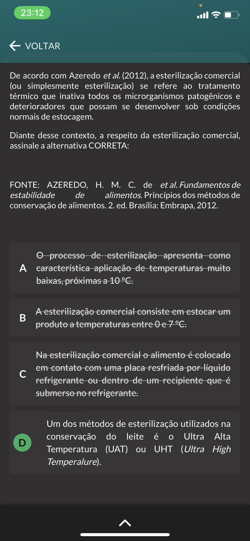23:12 VOLTAR De acordo com Azeredo et al. (2012), a esterilização comercial (ou simplesmente esterilização) se refere ao tratamento térmico que inativa todos os microrganismos patogênicos e deterioradores que possam se desenvolver sob condições normais de estocagem. Diante desse contexto, a respeito da esterilização comercial, assinale a alternativa CORRETA: FONTE: AZEREDO, H. M. de et al. Fundamentos de estabilidade de alimentos. Princípios dos métodos de conservação de alimentos. 2. ed. Brasília: Embrapa, 2012. processo de esterilização apresenta como A característica aplicação de temperaturas muito baixas, próximas a A esterilização comercial consiste em estocar um produto a temperaturas entre Na esterilização comercial alimento é colocado em contato com uma placa resfriada por líquido c refrigerante ou dentro de um recipiente que é submerso no refrigerante. Um dos métodos de esterilização utilizados na conservação do leite é Ultra Alta D Temperatura (UAT) ou UHT (Ultra High Temperalure).