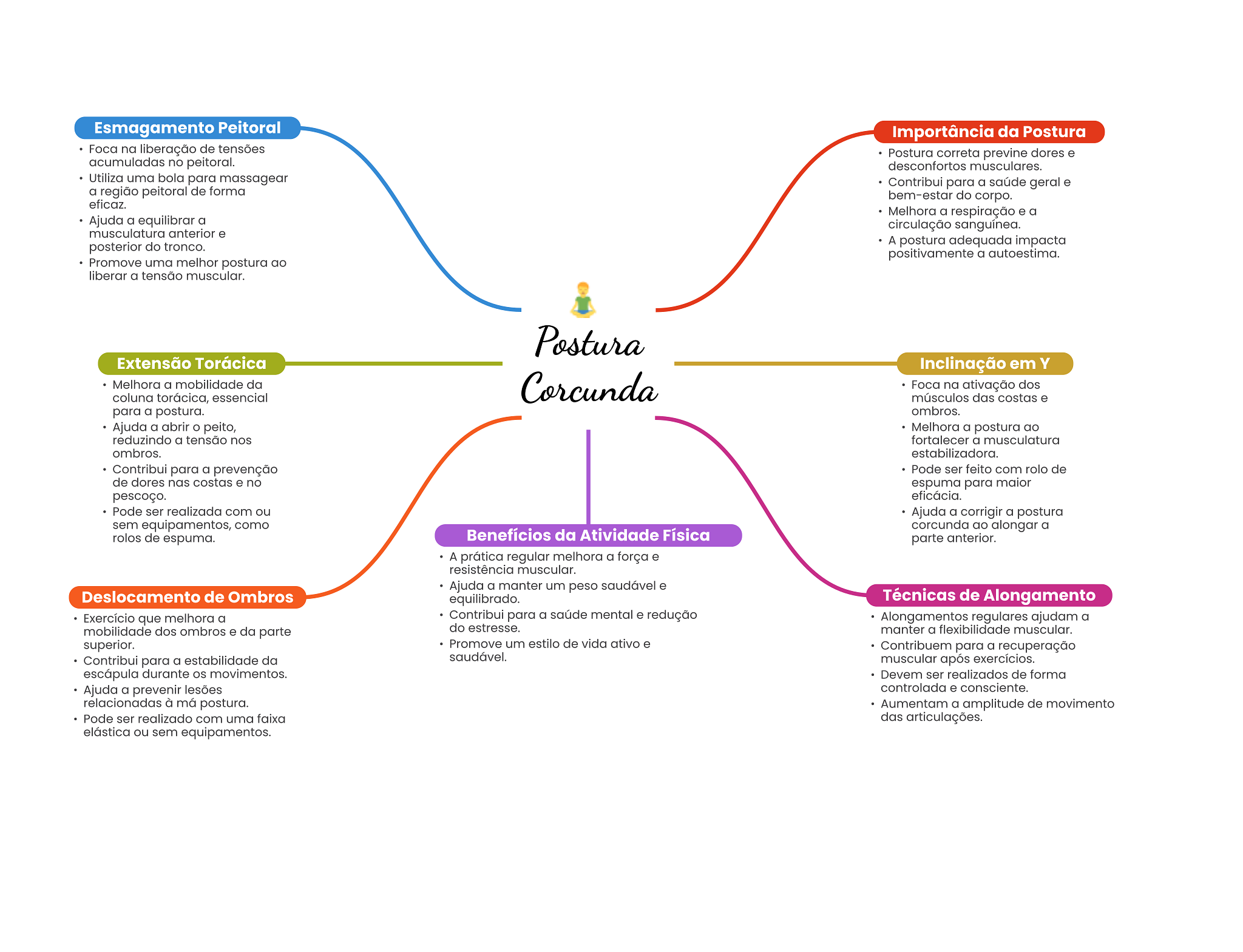 Esmagamento Peitoral Importância da Postura Foca na liberação de tensões Postura correta previne dores e acumuladas no peitoral. desconfortos musculares. Utiliza uma bola para massagear Contribui para a saúde geral e a região peitoral de forma bem-estar do corpo. eficaz. Melhora a respiração e a Ajuda a equilibrar a circulação sanguínea. musculatura anterior e posterior do tronco. A postura adequada impacta positivamente a autoestima. Promove uma melhor postura ao liberar a tensão muscular. Postura Extensão Torácica Inclinação em Y Melhora a mobilidade da Corcunda Foca na ativação dos coluna torácica, essencial músculos das costas e para a postura. ombros. Ajuda a abrir peito, Melhora a postura ao reduzindo a tensão nos fortalecer a musculatura ombros. estabilizadora. Contribui para a prevenção Pode ser feito com rolo de de dores nas costas e no espuma para maior pescoço. eficácia. Pode ser realizada com ou Ajuda a corrigir a postura sem equipamentos, como corcunda ao alongar a rolos de espuma. Benefícios da Atividade Física parte anterior. A prática regular melhora a força e resistência muscular. Ajuda a manter um peso saudável e Deslocamento de Ombros equilibrado. Técnicas de Alongamento Exercício que melhora a Contribui para a saúde mental e redução Alongamentos regulares ajudam a mobilidade dos ombros e da parte do estresse. manter a flexibilidade muscular. superior. Promove um estilo de vida ativo e Contribuem para a recuperação Contribui para a estabilidade da saudável. muscular após exercícios. escápula durante movimentos. Devem ser realizados de forma Ajuda a prevenir lesões controlada e consciente. relacionadas à má postura. Aumentam a amplitude de movimento Pode ser realizado com uma faixa das articulações. elástica ou sem equipamentos.