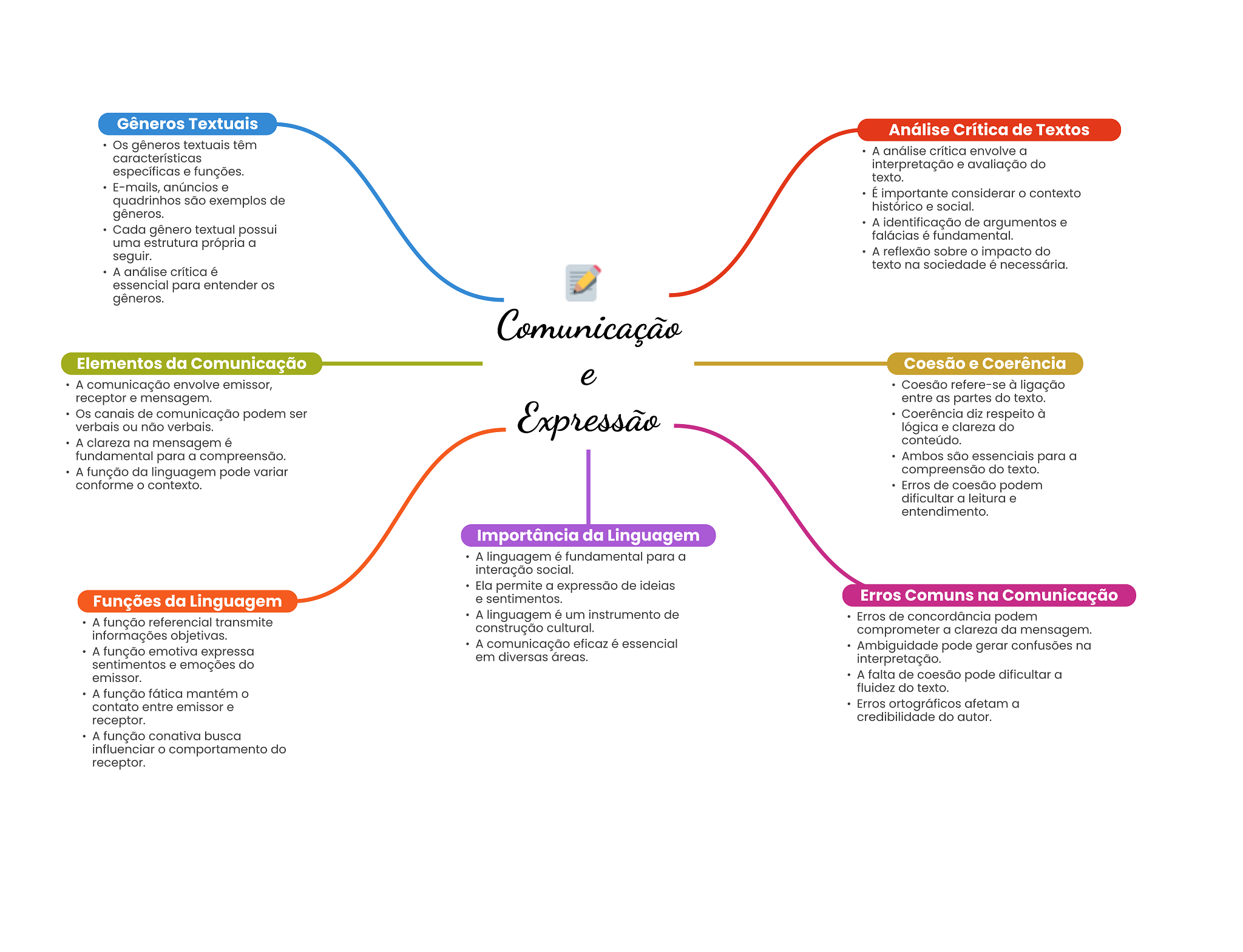 Gêneros Textuais Análise Crítica de Textos Os gêneros textuais têm A análise crítica envolve a características interpretação e avaliação do específicas e funções. texto. E-mails, anúncios e É importante considerar contexto quadrinhos são exemplos de histórico e social. gêneros. A identificação de argumentos e Cada gênero textual possui falácias é fundamental. uma estrutura própria a seguir. A reflexão sobre impacto do texto na sociedade é necessária. A análise crítica é essencial para entender gêneros. Comunicação Elementos da Comunicação Coesão e Coerência e A comunicação envolve emissor, Coesão refere-se à ligação receptor e mensagem. entre as partes do texto. Os canais de comunicação podem ser Expressão Coerência diz respeito à verbais ou não verbais. lógica e clareza do A clareza na mensagem é conteúdo. fundamental para a compreensão. Ambos são essenciais para a A função da linguagem pode variar compreensão do texto. conforme contexto. Erros de coesão podem dificultar a leitura e entendimento. Importância da Linguagem A linguagem é fundamental para a interação social. Ela permite a expressão de ideias Funções da Linguagem e sentimentos. Erros Comuns na Comunicação A linguagem é um instrumento de A função referencial transmite Erros de concordância podem construção cultural. informações objetivas. comprometer a clareza da mensagem. A comunicação eficaz é essencial A função emotiva expressa Ambiguidade pode gerar confusões na em diversas áreas. sentimentos e emoções do interpretação. emissor. A falta de coesão pode dificultar a fluidez do texto. A função fática mantém contato entre emissor e Erros ortográficos afetam a receptor. credibilidade do autor. A função conativa busca influenciar comportamento do receptor.