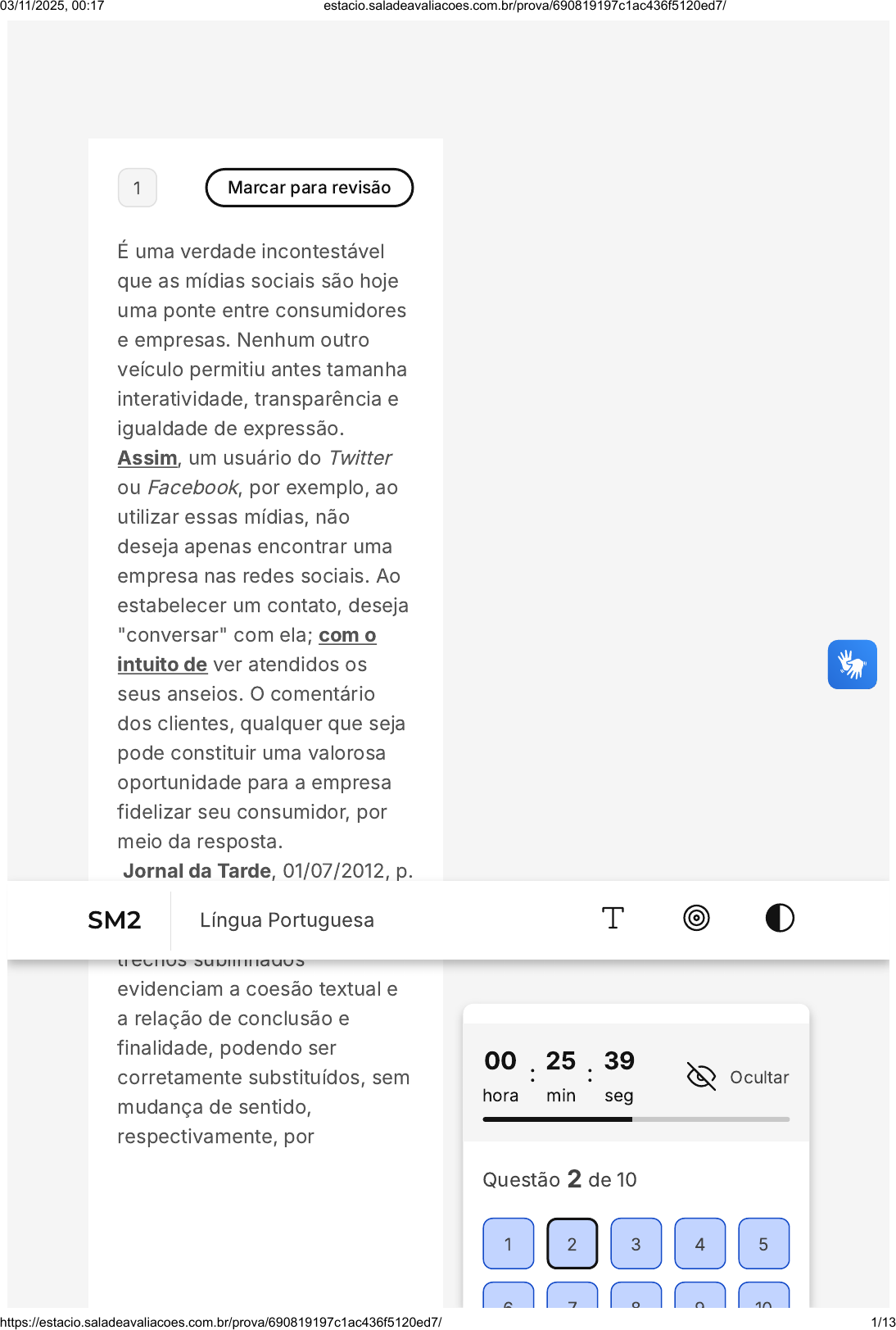 1 Marcar para revisão É uma verdade incontestável que as mídias sociais são hoje uma ponte entre consumidores e empresas. Nenhum outro veículo permitiu antes tamanha interatividade, transparência e igualdade de expressão. Assim, um usuário do Twitter ou Facebook, por exemplo, ao utilizar essas mídias, não deseja apenas encontrar uma empresa nas redes sociais. Ao estabelecer um contato, deseja "conversar" com ela; com o intuito de ver atendidos os seus anseios. O comentário dos clientes, qualquer que seja pode constituir uma valorosa oportunidade para a empresa fidelizar seu consumidor, por meio da resposta. Jornal da Tarde, 01/07/2012, p. 2A (adaptado). Nesse parágrafo, os dois trechos sublinhados evidenciam a coesão textual e a relação de conclusão e finalidade, podendo ser corretamente substituídos, sem mudança de sentido, respectivamente, por 00 hora : 25 min : 39 seg Ocultar Questão 2 de 10 1 2 3 4 5 6 7 8 9 10 SM2 Língua Portuguesa 03/11/2025, 00:17 estacio.saladeavaliacoes.com.br/prova/690819197c1ac436f5120ed7/ https://estacio.saladeavaliacoes.com.br/prova/690819197c1ac436f5120ed7/ 1/13 A B C D E A B caso; embora. caso; outrossim. desse modo; embora. conforme; enquanto. portanto; a fim de. 2 Marcar para revisão Identificar o gênero textual é importante porque devemos ter estratégias de leitura adequadas às estruturas, às intenções e aos estilos próprios de cada gênero. Assim, assinale a opção que apresenta um procedimento de leitura adequado, levando em conta o gênero textual. Buscar uma verdade ou fato histórico num texto ficcional, como um conto. Realizar uma leitura imaginativa e de entretenimento numa bula de remédio. Respondidas (10) Em branco (0) Finalizar prova 6 7 8 9 10 03/11/2025, 00:17 estacio.saladeavaliacoes.com.br/prova/690819197c1ac436f5120ed7/ https://estacio.saladeavaliacoes.com.br/prova/690819197c1ac436f5120ed7/ 2/13 C D E Esperar descrições subjetivas no manual de um aparelho de celular. Identificar descrições objetivas de procedimentos e processos num poema. Encontrar algum efeito de humor numa anedota. 3 Marcar para revisão Os gêneros textuais desempenham um papel crucial na comunicação escrita e oral. Qual é a principal diferença entre uma carta pessoal e uma carta comercial? 03/11/2025, 00:17 estacio.saladeavaliacoes.com.br/prova/690819197c1ac436f5120ed7/ https://estacio.saladeavaliacoes.com.br/prova/690819197c1ac436f5120ed7/ 3/13 A B C D E A carta pessoal é escrita em um estilo formal, enquanto a carta comercial usa uma linguagem mais afetiva. A carta pessoal é mais formal e segue um padrão rígido de linguagem, enquanto a carta comercial permite maior expressividade. A carta pessoal é mais afetiva e pode incluir aspectos confessionais, enquanto a carta comercial segue uma linguagem estritamente formal. A carta pessoal usa jargões profissionais, enquanto a carta comercial é mais flexível em relação à forma de tratamento. A carta pessoal usa uma linguagem mais formal, enquanto a carta comercial é mais flexível em relação à disposição da data e do local. 03/11/2025, 00:17 estacio.saladeavaliacoes.com.br/prova/690819197c1ac436f5120ed7/ https://estacio.saladeavaliacoes.com.br/prova/690819197c1ac436f5120ed7/ 4/13 A B 4 Marcar para revisão "O diretor da escola convocou os pais e os responsáveis dos alunos da escola para uma reunião ontem à tarde na escola, mas poucos pais e responsáveis compareceram, já que os principais acessos à escola ficaram inundados por uma forte chuva." Assinale a opção que reescreve o texto acima restabelecendo sua coesão textual. O diretor da escola convocou os pais e os responsáveis dos alunos para uma reunião ontem à tarde na escola, porque poucos pais e responsáveis compareceram, mas uma forte chuva inundou os principais acessos à escola. O diretor da escola convocou os pais e os responsáveis dos alunos para uma reunião ontem à tarde, porém poucos compareceram, pois os principais acessos ao colégio uma forte chuva inundou. 03/11/2025, 00:17 estacio.saladeavaliacoes.com.br/prova/690819197c1ac436f5120ed7/ https://estacio.saladeavaliacoes.com.br/prova/690819197c1ac436f5120ed7/ 5/13 C D E O diretor da escola convocou os pais e os responsáveis para uma reunião ontem à tarde, assim poucos pais e responsáveis compareceram, porém uma forte chuva inundou os principais acessos da escola. O diretor da escola convocou os pais e os responsáveis dos alunos da escola para uma reunião ontem à tarde, já que poucos pais e responsáveis compareceram, portanto uma forte chuva inundou os principais acessos. O diretor da escola convocou os alunos para uma reunião ontem à tarde no colégio, no entanto poucos compareceram, por isso uma forte chuva inundou os principais acessos. 5 Marcar para revisão 03/11/2025, 00:17 estacio.saladeavaliacoes.com.br/prova/690819197c1ac436f5120ed7/ https://estacio.saladeavaliacoes.com.br/prova/690819197c1ac436f5120ed7/ 6/13 A B Em uma aula de português, o professor João percebeu que seus alunos estavam escrevendo "conserto" ao se referir a "concerto" musical e "cinto" no lugar de "sinto". Decidiu então criar exemplos práticos para explicar a diferença entre essas palavras que têm pronúncias semelhantes, mas significados distintos. Considerando o texto, analise as afirmativas abaixo. I. As palavras "conserto" e "concerto", apesar de foneticamente semelhantes, possuem diferentes significados e contextos de uso. II. "Cinto" é uma forma verbal relacionada ao verbo sentir, enquanto "sinto" refere-se a uma peça de vestuário. III. A confusão entre palavras homófonas pode ser esclarecida através do contexto em que são aplicadas. Assinale a opção que apresenta somente as alternativas corretas. Somente a afirmativa I está correta. Somente a afirmativa II está correta. 03/11/2025, 00:17 estacio.saladeavaliacoes.com.br/prova/690819197c1ac436f5120ed7/ https://estacio.saladeavaliacoes.com.br/prova/690819197c1ac436f5120ed7/ 7/13 C 