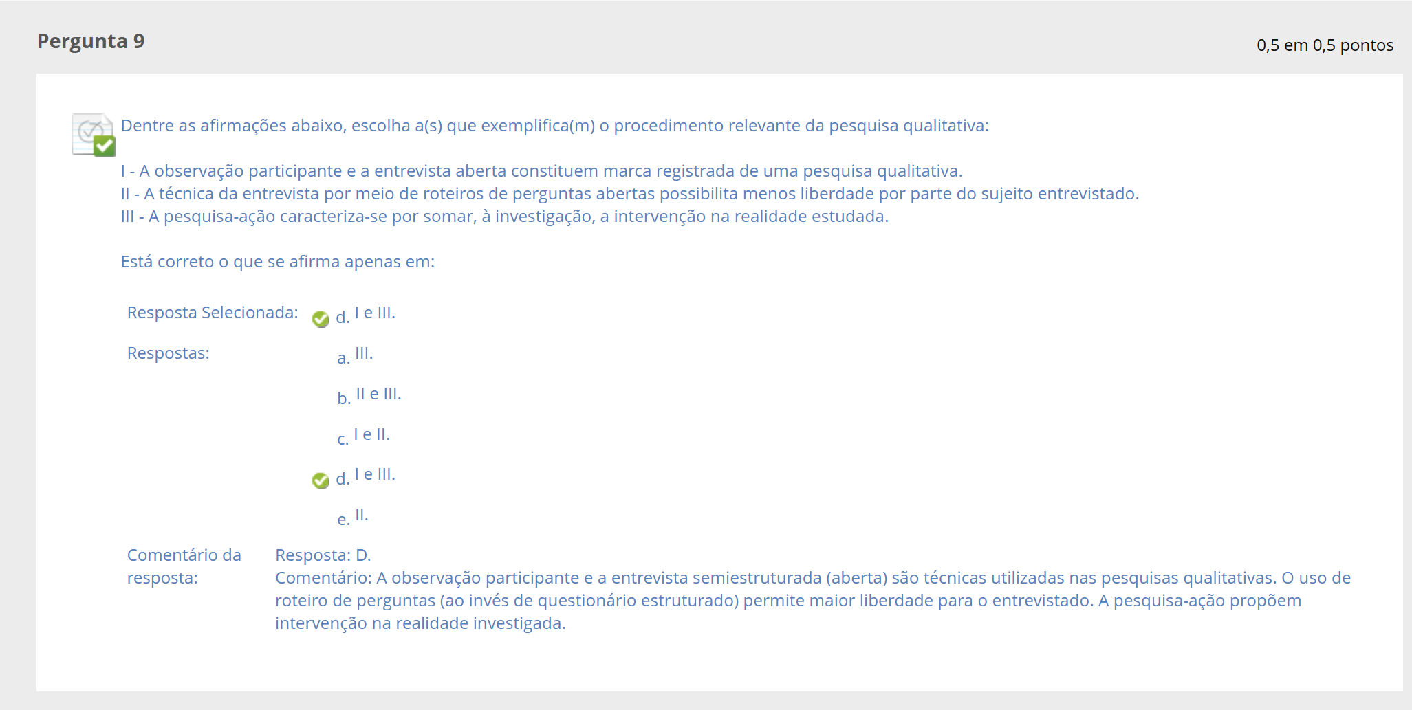 Pergunta 9 0,5 em 0,5 pontos Dentre as afirmações abaixo, escolha a(s) que exemplifica(m) procedimento relevante da pesquisa qualitativa: A observação participante e a entrevista aberta constituem marca registrada de uma pesquisa qualitativa. A técnica da entrevista por meio de roteiros de perguntas abertas possibilita menos liberdade por parte do sujeito entrevistado. III A pesquisa-ação caracteriza-se por somar, à investigação, a intervenção na realidade estudada. Está correto que se afirma apenas em: Resposta Selecionada: d. le III. Respostas: a. III. b. e III. C. e II. d. le III. e. II. Comentário da Resposta: D. resposta: Comentário: A observação participante e a entrevista semiestruturada (aberta) são técnicas utilizadas nas pesquisas qualitativas. uso de roteiro de perguntas (ao invés de questionário estruturado) permite maior liberdade para entrevistado. A pesquisa-ação propõem intervenção na realidade investigada.