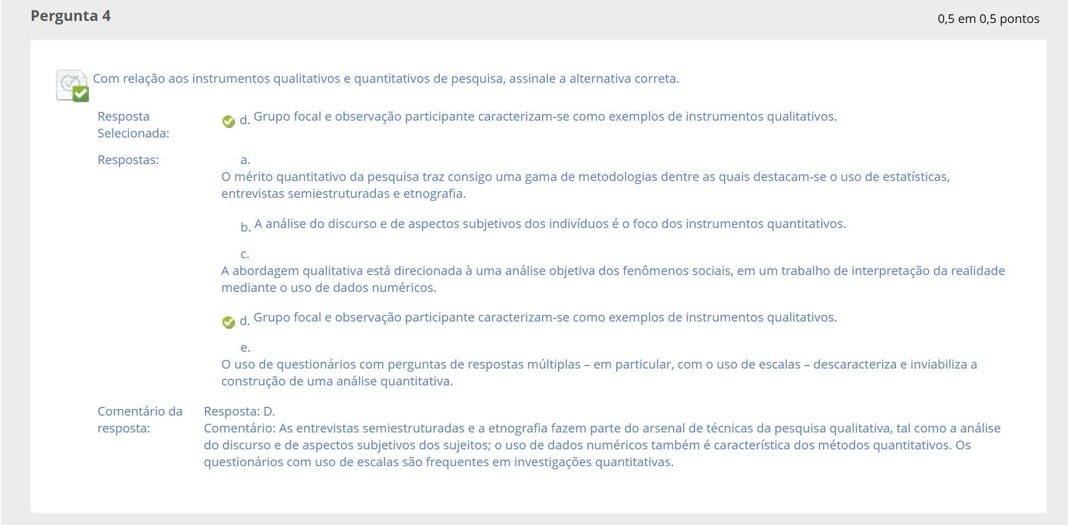 Pergunta 4 0,5 em 0,5 pontos Com relação aos instrumentos qualitativos e quantitativos de pesquisa, assinale a alternativa correta. Resposta d. Grupo focal e observação participante caracterizam-se como exemplos de instrumentos qualitativos. Selecionada: Respostas: a. mérito quantitativo da pesquisa traz consigo uma gama de metodologias dentre as quais destacam-se uso de estatísticas, entrevistas semiestruturadas e etnografia. b. A análise do discurso e de aspectos subjetivos dos indivíduos é foco dos instrumentos quantitativos. A abordagem qualitativa está direcionada à uma análise objetiva dos fenômenos sociais, em um trabalho de interpretação da realidade mediante uso de dados numéricos. d. Grupo focal e observação participante caracterizam-se como exemplos de instrumentos qualitativos. e. O uso de questionários com perguntas de respostas múltiplas em particular, com uso de escalas descaracteriza e inviabiliza a construção de uma análise quantitativa. Comentário da Resposta: D. resposta: Comentário: As entrevistas semiestruturadas e a etnografia fazem parte do arsenal de técnicas da pesquisa qualitativa, tal como a análise do discurso e de aspectos subjetivos dos sujeitos; uso de dados numéricos também é característica dos métodos quantitativos. Os questionários com uso de escalas são frequentes em investigações quantitativas.