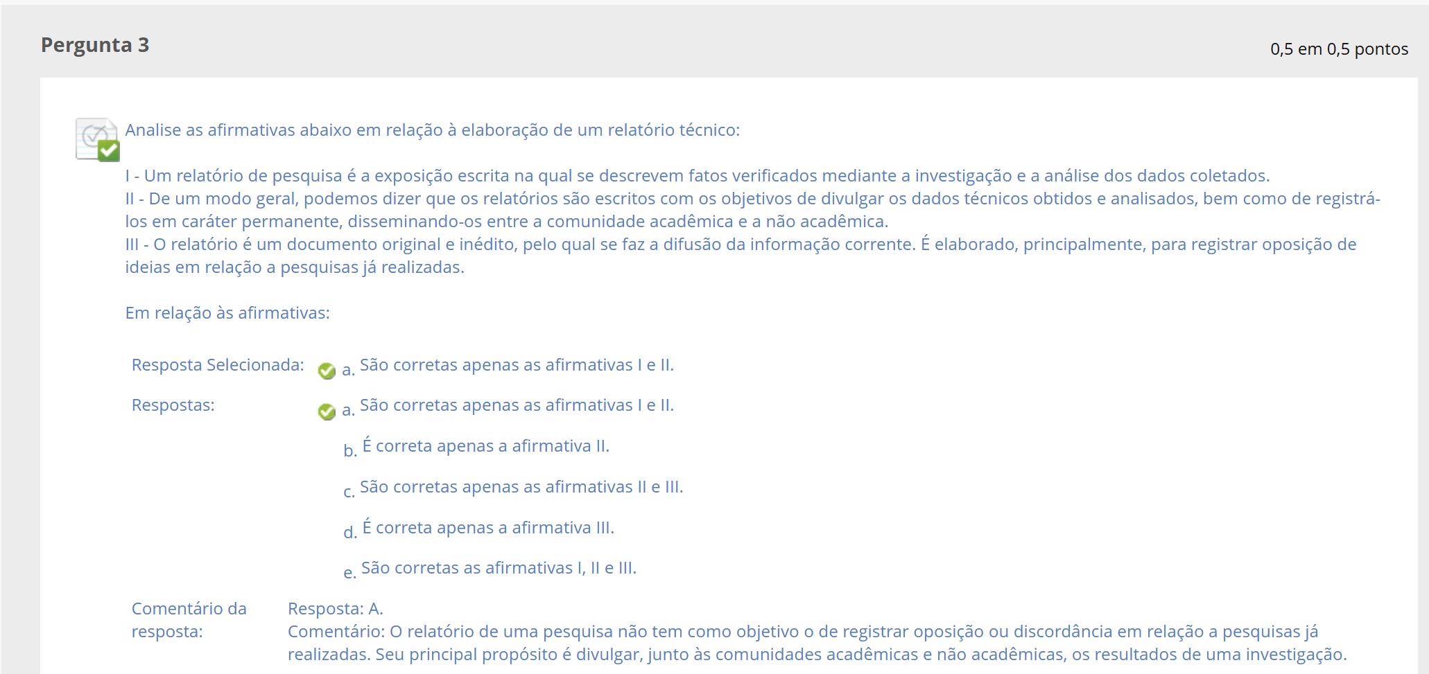 Pergunta 3 0,5 em 0,5 pontos Analise as afirmativas abaixo em relação à elaboração de um relatório técnico: Um relatório de pesquisa é a exposição escrita na qual se descrevem fatos verificados mediante a investigação e a análise dos dados coletados. De um modo geral, podemos dizer que os relatórios são escritos com os objetivos de divulgar os dados técnicos obtidos e analisados, bem como de registrá- los em caráter permanente, disseminando-os entre a comunidade acadêmica e a não acadêmica. III relatório é um documento original e inédito, pelo qual se faz a difusão da informação corrente. É elaborado, principalmente, para registrar oposição de ideias em relação a pesquisas já realizadas. Em relação às afirmativas: Resposta Selecionada: a. São corretas apenas as afirmativas e II. Respostas: a. São corretas apenas as afirmativas e II. b. É correta apenas a afirmativa II. São corretas apenas as afirmativas e III. d. É correta apenas a afirmativa III. e. São corretas as afirmativas I, e III. Comentário da Resposta: resposta: Comentário: relatório de uma pesquisa não tem como objetivo de registrar oposição ou discordância em relação a pesquisas já realizadas. Seu principal propósito é divulgar, junto às comunidades acadêmicas e não acadêmicas, os resultados de uma investigação.
