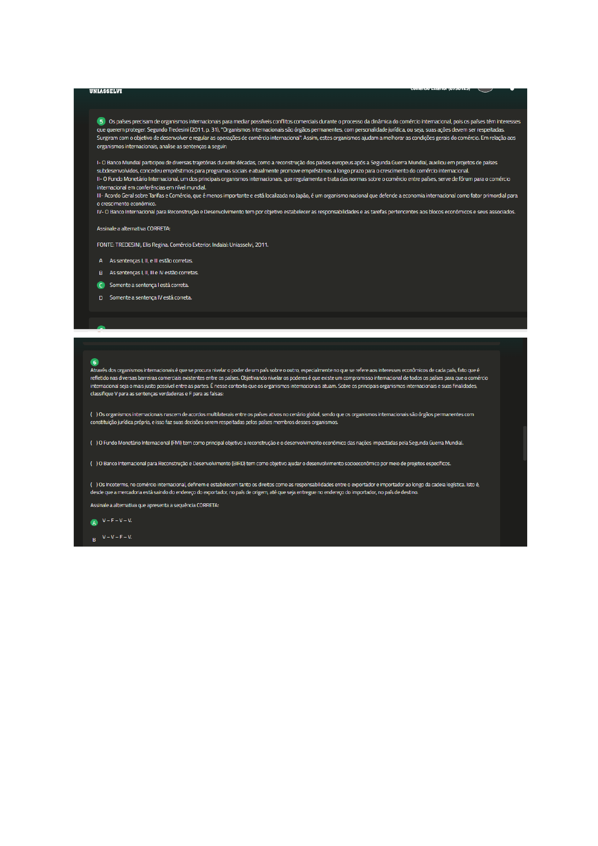 UNIASSELVI Os países precisam de organismos internacionais para mediar possíveis conflitos comerciais durante 0 processo da dinâmica do comércio internacional, pois países têm interesses que querem proteger. Segundo Tredesini (2011, 31), "Organismos Internacionais são órgãos permanentes, com personalidade jurídica, ou seja, suas ações devem ser respeitadas. Surgiram com objetivo de desenvolver e regular as operações de comércio internacional". Assim, estes organismos ajudam a melhorar as condições gerais do comércio. Em relação aos organismos internacionais, analise as sentenças a seguir: I- Banco Mundial participou de diversas trajetórias durante décadas, como a reconstrução dos países europeus após a Segunda Guerra Mundial, auxiliou em projetos de países subdesenvolvidos, concedeu empréstimos para programas sociais e atualmente promove empréstimos a longo prazo para crescimento do comércio internacional. II- 0 Fundo Monetário Internacional, um dos principais organismos internacionais, que regulamenta e trata das normas sobre comércio entre países, serve de fórum para 0 comércio internacional em conferências em nível mundial. III- Acordo Geral sobre Tarifas e Comércio, que é menos importante e está localizada no Japão, é um organismo nacional que defende a economia internacional como fator primordial para crescimento econômico. IV- Banco Internacional para Reconstrução e Desenvolvimento tem por objetivo estabelecer as responsabilidades e as tarefas pertencentes aos blocos econômicos e seus associados. Assinale a alternativa CORRETA: FONTE: TREDESINI, Elis Regina. Comércio Exterior. Indaial: Uniasselvi, 2011. A As sentenças I, II, e III estão corretas. As sentenças I, II, III e IV estão corretas. Somente a sentença está correta. D Somente a sentença IV está correta. Através dos organismos internacionais é que se procura nivelar poder de um país sobre 0 outro, especialmente no que se refere aos interesses econômicos de cada país, fato que é refletido nas diversas barreiras comerciais existentes entre países. Objetivando nivelar poderes é que existe um compromisso internacional de todos países para que comércio internacional seja 0 mais justo possível entre as partes. É nesse contexto que organismos internacionais atuam. Sobre principais organismos internacionais e suas finalidades, classifique V para as sentenças verdadeiras eF para as falsas: ( Os organismos internacionais nascem de acordos multilaterais entre países ativos no cenário global, sendo que organismos internacionais são órgãos permanentes com constituição jurídica própria, e isso faz suas decisões serem respeitadas pelos países membros desses organismos. Fundo Monetário Internacional (FMI) tem como principal objetivo a reconstrução e desenvolvimento econômico das nações impactadas pela Segunda Guerra Mundial. Banco Internacional para Reconstrução e Desenvolvimento (BIRD) tem como objetivo ajudar 0 desenvolvimento socioeconômico por meio de projetos específicos. Os Incoterms, no comércio internacional, definem e estabelecem tanto direitos como as responsabilidades entre exportador e importador ao longo da cadeia logística. Isto é, desde que a mercadoria está saindo do endereço do exportador, no país de origem, até que seja entregue no endereço do importador, no país de destino. Assinale a alternativa que apresenta a sequência CORRETA: V-F-V-V. V-V-F-V.
