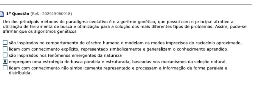 Questão (Ref.: 202015060918) Um dos principais métodos do paradigma evolutivo é O algoritmo genético, que possui com principal atrativo a utilização de ferramenta de busca e otimização para a solução dos mais diferentes tipos de problemas. Assim, pode-se afirmar que algoritmos genéticos são inspirados no comportamento do cérebro humano e modelam modos imprecisos do raciocínio aproximado. lidam com conhecimento representado simbolicamente e generalizam 0 conhecimento aprendido. são inspirados nos fenômenos emergentes da natureza empregam uma estratégia de busca paralela e estruturada, baseadas nos mecanismos da seleção natural. lidam com conhecimento não simbolicamente representado e processam a informação de forma paralela e
