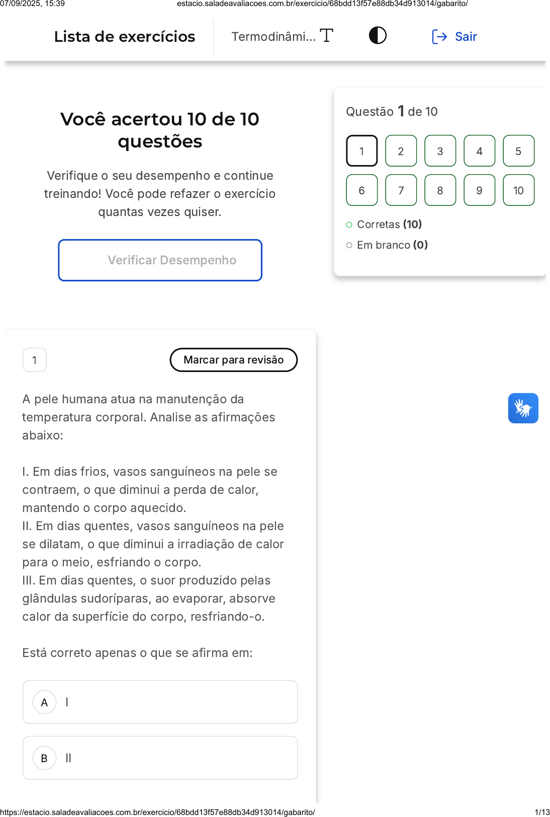 Você acertou 10 de 10 questões Verifique o seu desempenho e continue treinando! Você pode refazer o exercício quantas vezes quiser. Verificar Desempenho A B 1 Marcar para revisão A pele humana atua na manutenção da temperatura corporal. Analise as afirmações abaixo: I. Em dias frios, vasos sanguíneos na pele se contraem, o que diminui a perda de calor, mantendo o corpo aquecido. II. Em dias quentes, vasos sanguíneos na pele se dilatam, o que diminui a irradiação de calor para o meio, esfriando o corpo. III. Em dias quentes, o suor produzido pelas glândulas sudoríparas, ao evaporar, absorve calor da superfície do corpo, resfriando-o. Está correto apenas o que se afirma em: I II Questão 1 de 10 Corretas (10) Em branco (0) 1 2 3 4 5 6 7 8 9 10 Lista de exercícios Termodinâmi… Sair 07/09/2025, 15:39 estacio.saladeavaliacoes.com.br/exercicio/68bdd13f57e88db34d913014/gabarito/ https://estacio.saladeavaliacoes.com.br/exercicio/68bdd13f57e88db34d913014/gabarito/ 1/13 C D E I e II I e III II e III Resposta correta Parabéns, você selecionou a alternativa correta. Confira o gabarito comentado! Gabarito Comentado A resposta correta é: I e III. Em dias frios, os vasos sanguíneos na pele se contraem, o que diminui a perda de calor, mantendo o corpo aquecido. Em dias quentes, o suor produzido pelas glândulas sudoríparas, ao evaporar, absorve calor da superfície do corpo, resfriando-o. 2 Marcar para revisão Analise as seguintes afirmativas: I. Em ambientes frios, ocorre uma vasoconstrição periférica cutânea, o que diminui o fluxo sanguíneo na pele e reduz a perda de calor para o meio externo. Porque II. Centros termorreguladores no hipotálamo estimulam o sistema nervoso simpático, responsável pela vasoconstrição. 07/09/2025, 15:39 estacio.saladeavaliacoes.com.br/exercicio/68bdd13f57e88db34d913014/gabarito/ https://estacio.saladeavaliacoes.com.br/exercicio/68bdd13f57e88db34d913014/gabarito/ 2/13 A B C D E Assinale a alternativa correta: As duas afirmativas estão corretas, porém a segunda não é uma justificativa correta da primeira As duas afirmativas estão corretas, e a segunda é uma justificativa correta da primeira As duas afirmativas estão erradas Apenas a primeira afirmativa está errada Apenas a segunda afirmativa está errada Resposta correta Parabéns, você selecionou a alternativa correta. Confira o gabarito comentado! Gabarito Comentado A resposta correta é: As duas afirmativas estão corretas, e a segunda é uma justificativa correta da primeira. A vasoconstrição periférica cutânea é uma resposta fisiológica que ocorre em ambientes frios, e é responsável por reduzir a perda de calor para o meio externo. O hipotálamo é uma região do cérebro que controla a temperatura corporal, e é responsável por estimular o sistema 07/09/2025, 15:39 estacio.saladeavaliacoes.com.br/exercicio/68bdd13f57e88db34d913014/gabarito/ https://estacio.saladeavaliacoes.com.br/exercicio/68bdd13f57e88db34d913014/gabarito/ 3/13 A B C D E nervoso simpático, que é responsável pela vasoconstrição. Portanto, as duas afirmativas estão corretas, e a segunda é uma justificativa correta da primeira. 3 Marcar para revisão Os conceitos fundamentais da termodinâmica conhecidos como sistema aberto, fechado e isolado se diferem na capacidade de troca de energia e matéria com o ambiente externo. De acordo com esse contexto qual é a definição de um sistema aberto? Um sistema que não troca energia ou matéria com o ambiente externo Um sistema que troca apenas energia com o ambiente externo Um sistema que troca apenas matéria com o ambiente externo Um sistema que pode trocar energia ou matéria com o ambiente externo Um sistema que pode trocar energia ou matéria com o ambiente externo, desde que haja uma barreira que limite essas trocas Resposta correta Parabéns, você selecionou a alternativa correta. Confira o 07/09/2025, 15:39 estacio.saladeavaliacoes.com.br/exercicio/68bdd13f57e88db34d913014/gabarito/ https://estacio.saladeavaliacoes.com.br/exercicio/68bdd13f57e88db34d913014/gabarito/ 4/13 A B C gabarito comentado! Gabarito Comentado Um sistema que pode trocar energia ou matéria com o ambiente externo, desde que haja uma barreira que limite essas trocas. Um sistema aberto é aquele que pode trocar tanto energia quanto matéria com o ambiente externo, mas há uma barreira que limita essas trocas. Exemplos de sistemas abertos incluem um organismo vivo ou uma usina nuclear. 4 Marcar para revisão A energia térmica é a energia associada ao movimento aleatório das partículas que compõem um material ou sistema. A transferência de energia térmica pode ocorrer de diferentes formas. Qual é o processo de transferência de energia térmica que ocorre através do contato direto entre dois corpos com temperaturas diferentes? Convecção Radiação Condução 07/09/2025, 15:39 estacio.saladeavaliacoes.com.br/exercicio/68bdd13f57e88db34d913014/gabarito/ https://estacio.saladeavaliacoes.com.br/exercicio/68bdd13f57e88db34d913014/gabarito/ 5/13 D E A B Evaporação Condensação Resposta correta Parabéns, você selecionou a alternativa correta. Confira o gabarito comentado! Gabarito Comentado Na condução, a energia térmica passa de partícula a partícula do corpo, por contato. A agitação das partículas acaba afetando as partículas vizinhas, o que provoca uma transmissão de calor pelo corpo. A condutibilidade térmica é a capacidade de um material em conduzir a energia térmica e depende de cada material 5 Marcar para revisão O universo é repleto de diversos tipos de energia que se manifestam de diferentes formas e em diferentes escalas. Qual é o tipo de energia associado ao movimento dos átomos e moléculas em um gás? Energia cinética Energia térmica 07/09/2025, 15:39 estacio.saladeavaliacoes.com.br/exercicio/68bdd13f57e88db34d913014/gabarito/ https://estacio.saladeavaliacoes.com.br/exercicio/68bdd13f57e88db34d913014/gabarito/ 6/13 C D E A B Energia e