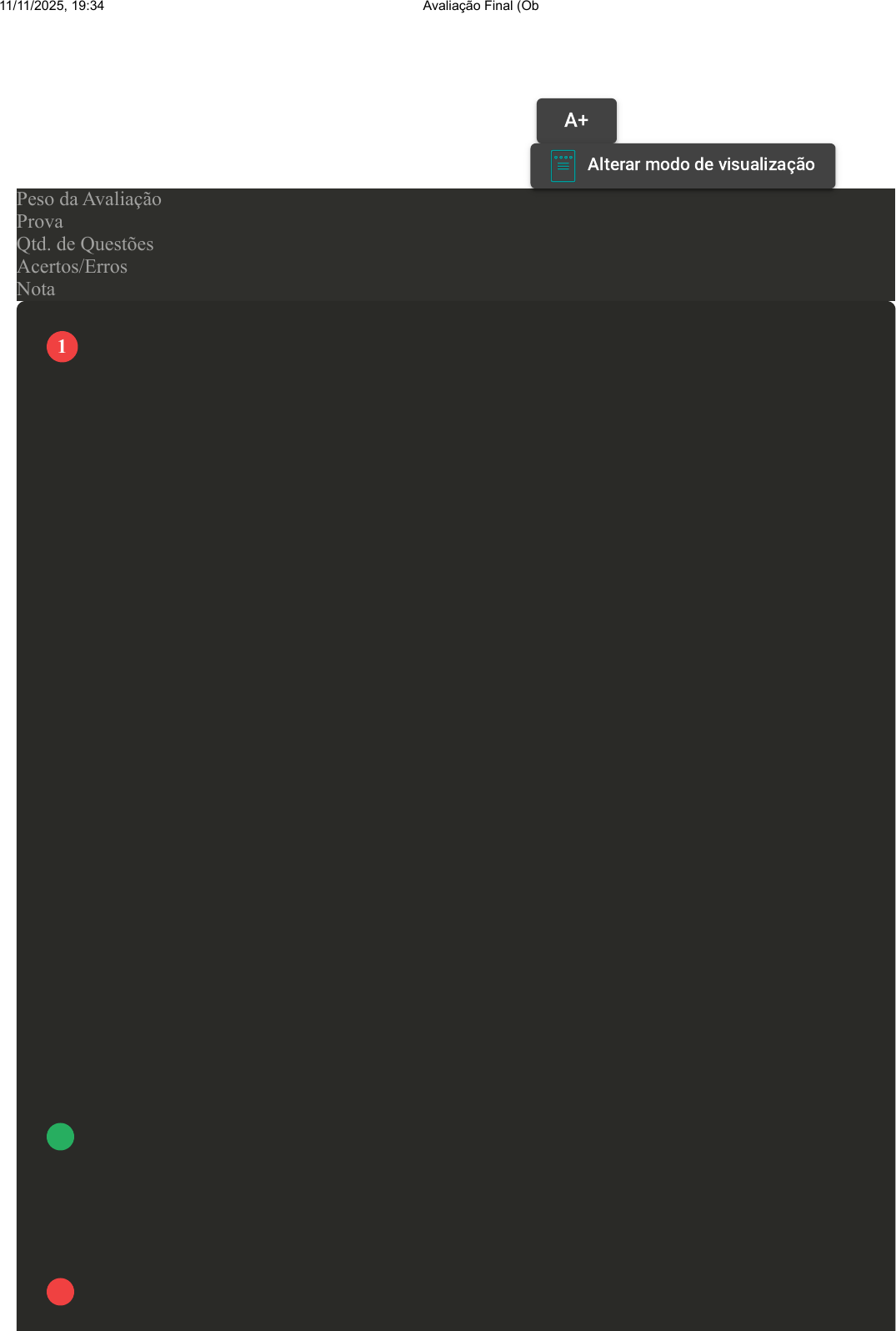 Prova Impressa GABARITO | Avaliação Final (Objetiva) - Individual (Cod.:1522937) Peso da Avaliação 4,00 Prova 106107817 Qtd. de Questões 10 Acertos/Erros 9/1 Nota 9,00 Para viver, entre outras coisas, precisamos de energia. Essa energia usada pelo nosso organismo vem das reações químicas que acontecem nas nossas células. Podemos nos comparar a uma fábrica que funciona 24 horas por dia. Vivemos fazendo e refazendo os materiais de nossas células. Quando andamos, cantamos, pensamos, trabalhamos ou brincamos, estamos consumindo energia química gerada pelo nosso próprio organismo. E o nosso combustível vem dos alimentos que comemos. No motor do carro, por exemplo, a gasolina ou o álcool misturam-se com o ar, produzindo a combustão, que é uma reação química entre o combustível e o oxigênio do ar. Do mesmo modo, nas células do nosso organismo, os alimentos reagem com o oxigênio para produzir energia. Fonte: adaptado de: CHC. A Química da digestão. Ciência Hoje das Crianças, 2000. Disponível em: https://chc.org.br/a-quimica-da-digestao/. Acesso em: 15 ago. 2023. Existem muitos tipos diferentes de reações bioquímicas que ocorrem nas células, cada uma desempenhando um papel específico no metabolismo e nas funções celulares. Sobre isso, analise as afirmativas a seguir: I. O NADH atua diretamente na síntese de ATP. II. A remoção do grupo fosforila terminal do ATP, é uma reação que libera energia. III. A fosforilação da glicose é o processo de quebra do fosfato das moléculas desse carboidrato. IV. A oxidação é o processo de ganho de elétrons. A redução, por outro lado, é o processo de perda de elétrons. É correto o que se afirma em: A II, apenas. B I e IV, apenas. C II e III, apenas VOLTAR A+ Alterar modo de visualização 1 11/11/2025, 19:34 Avaliação Final (Objetiva) - Individual about:blank 1/8 D III e IV, apenas. E I, II, III e IV, apenas. [...] Para desenvolver um estudo nacional com ampla abrangência em diversidade genética, o Ministério da Saúde propôs a criação do projeto Genomas Brasil, uma grande iniciativa que pretende sequenciar o DNA de 100 mil brasileiros, de todas as regiões, entre grupos de pacientes com doenças raras e coortes populacionais. Para aumentar a capacidade diagnóstica, foi desenvolvido o projeto Genomas Raros, que pretende fazer o sequenciamento genômico completo de indivíduos com doenças raras, incluindo as síndromes de risco hereditário de câncer. Fonte: adaptado de: ROCHA, L. Projeto de sequenciamento genômico busca otimizar diagnóstico de doenças raras. CNN Brasil, 2023. Disponível em: https://www.cnnbrasil.com.br/saude/projeto-de- sequenciamento-genomico-busca-otimizar-diagnostico-de-doencas-raras/. Acesso em: 12 jul. 2023. Considerando o sequenciamento genômico, assinale a alternativa correta: A O sequenciamento genético pode apontar alterações nos genes, predizendo o risco de algumas doenças, principalmente em casos de histórico familiar. B São obtidas poucas informações acerca de características biológicas do indivíduo, excluindo características físicas. C O sequenciamento genômico é a técnica que identifica, de forma aleatória, as informações genéticas contidas no DNA de um organismo. D Todas as doenças raras são identificadas nos dias de hoje pelo sequenciamento genético. O processo de metabolização de lipídios começa na digestão, onde as gorduras da dieta são quebradas em ácidos graxos e glicerol. Isso ocorre principalmente no intestino delgado, onde as enzimas pancreáticas e biliares auxiliam na emulsificação dos lipídios, aumentando a área de superfície disponível para ação das enzimas digestivas. Os ácidos graxos e o glicerol resultantes são então absorvidos pelas células do intestino e transportados para o sangue. Uma vez na corrente sanguínea, os ácidos graxos podem ser usados de várias maneiras. Eles podem ser oxidados no interior das mitocôndrias das células para gerar energia, processo conhecido como beta-oxidação. Essa energia é essencial para atividades celulares, como contração muscular, produção de ATP (adenosina trifosfato) Revisar Conteúdo do Livro 2 3 11/11/2025, 19:34 Avaliação Final (Objetiva) - Individual about:blank 2/8 https://www.cnnbrasil.com.br/saude/projeto-de-sequenciamento-genomico-busca-otimizar-diagnostico-de-doencas-raras/ https://www.cnnbrasil.com.br/saude/projeto-de-sequenciamento-genomico-busca-otimizar-diagnostico-de-doencas-raras/ e manutenção da temperatura corporal. Além disso, os ácidos graxos também podem ser usados para sintetizar moléculas como fosfolipídios, que são componentes essenciais das membranas celulares, e triglicerídeos, que são armazenados no tecido adiposo para serem utilizados como reserva energética. Fonte: adaptado de: NELSON, D. L.; COX, M. M. Princípios de bioquímica de Lehninger. 6. ed. Porto Alegre: Artmed, 2014. O processo de metabolização de lipídios também está intimamente relacionado à regulação do colesterol e das lipoproteínas. Considerando isso, analise as afirmativas a seguir: I. A ingestão de carboidratos ativa a oxidação dos ácidos graxos. II. A insulina ativa as enzimas que atuam na síntese do colesterol. III. O glucagon ativa a mobilização de ácidos graxos no tecido adiposo. IV. A diminuição dos níveis de ATP aumenta os níveis de AMP, ativando a síntese de colesterol. É correto o que se afirma em: A III e IV, apenas. B I e IV, apenas. C I, II e III, apenas. D II e III, apenas. O ciclo da ureia é um processo fundamental que ocorre no fígado dos mamíferos, visando à eliminação de amônia, um produto tóxico resultante do metabolismo das proteínas. O ciclo envolve cinco etapas sequenciais: a conversão de amônia em carbamoil fosfato para formar citrulina; esta, por sua vez, é transportada para o citosol para gerar arginina-succinato, que é então clivado, formando arginina e fumarato, sendo a arginina precursora da