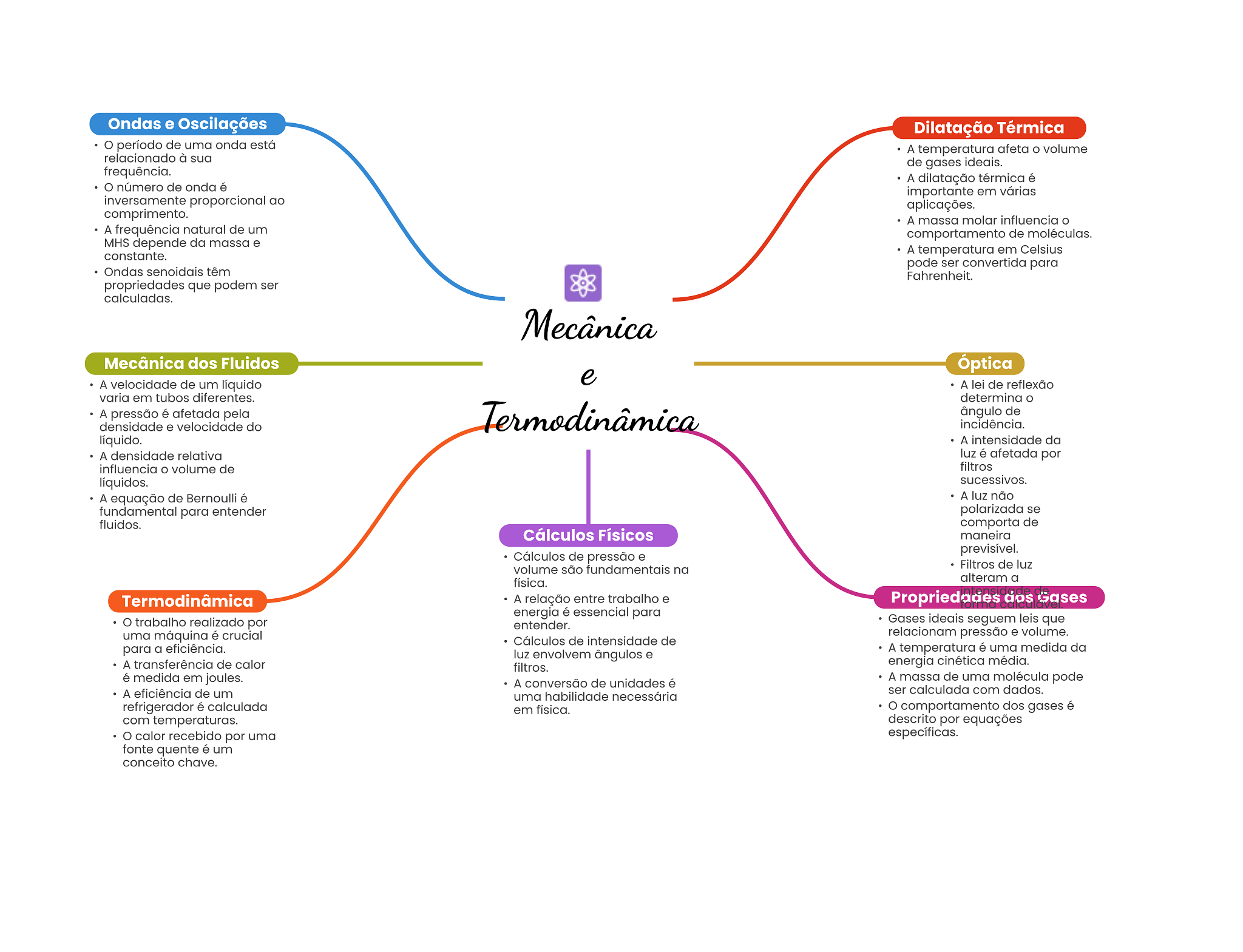 Ondas e Oscilações Dilatação Térmica período de uma onda está A temperatura afeta volume relacionado à sua de gases ideais. frequência. A dilatação térmica é número de onda é importante em várias inversamente proporcional ao aplicações. comprimento. A massa molar influencia A frequência natural de um comportamento de moléculas. MHS depende da massa e constante. A temperatura em Celsius pode ser convertida para Ondas senoidais têm Fahrenheit. propriedades que podem ser calculadas. Mecânica Mecânica dos Fluidos Óptica e A velocidade de um líquido A lei de reflexão varia em tubos diferentes. determina A pressão é afetada pela Termodinâmica ângulo de densidade e velocidade do incidência. líquido. A intensidade da A densidade relativa luz é afetada por influencia volume de filtros líquidos. sucessivos. A equação de Bernoulli é A luz não fundamental para entender polarizada se fluidos. comporta de Cálculos Físicos maneira previsível. Cálculos de pressão e volume são fundamentais na Filtros de luz física. alteram a Termodinâmica A relação entre trabalho e Propriedades dos Gases energia é essencial para trabalho realizado por entender. Gases ideais seguem leis que uma máquina é crucial relacionam pressão e volume. Cálculos de intensidade de para a eficiência. luz envolvem ângulos e A temperatura é uma medida da A transferência de calor filtros. energia cinética média. é medida em joules. A conversão de unidades é A massa de uma molécula pode A eficiência de um ser calculada com dados. uma habilidade necessária refrigerador é calculada em física. comportamento dos gases é com temperaturas. descrito por equações calor recebido por uma específicas. fonte quente é um conceito chave.