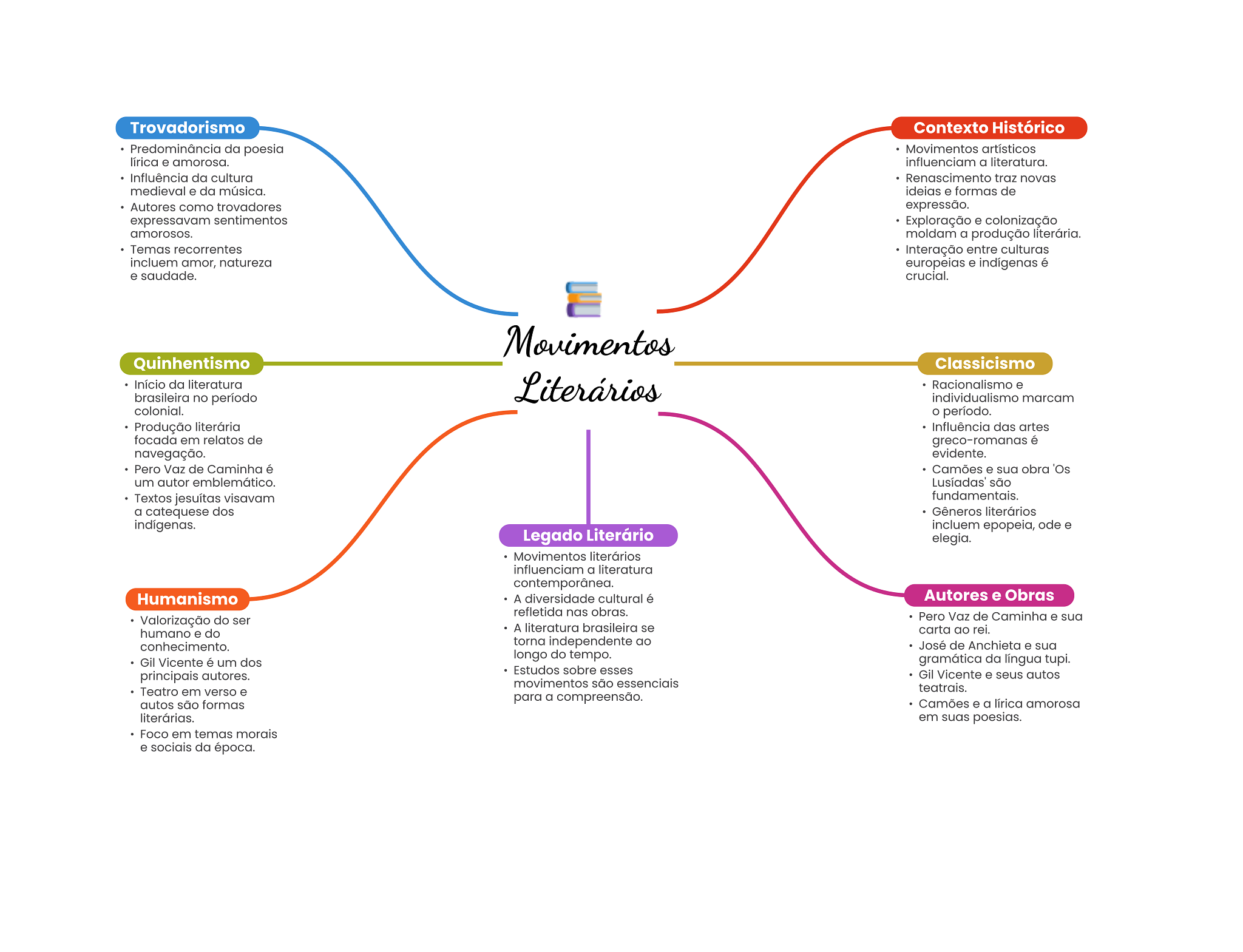 Trovadorismo Contexto Histórico Predominância da poesia Movimentos artísticos lírica e amorosa. influenciam a literatura. Influência da cultura Renascimento traz novas medieval e da música. ideias e formas de Autores como trovadores expressão. expressavam sentimentos Exploração e colonização amorosos. moldam a produção literária. Temas recorrentes Interação entre culturas incluem amor, natureza europeias e indígenas é e saudade. crucial. Movimentos Quinhentismo Classicismo Início da literatura Literários Racionalismo e brasileira no período individualismo marcam colonial. período. Produção literária Influência das artes focada em relatos de greco-romanas é navegação. evidente. Pero Vaz de Caminha é Camões e sua obra 'Os um autor emblemático. são Textos jesuítas visavam fundamentais. a catequese dos Gêneros literários indígenas. incluem epopeia, ode e Legado Literário elegia. Movimentos literários influenciam a literatura contemporânea. Humanismo A diversidade cultural é Autores e Obras refletida nas obras. Valorização do ser Pero Vaz de Caminha e sua humano e do A literatura brasileira se carta ao rei. conhecimento. torna independente ao José de Anchieta e sua longo do tempo. Gil Vicente é um dos gramática da língua tupi. Estudos sobre esses principais autores. Gil Vicente e seus autos movimentos são essenciais Teatro em verso e teatrais. para a compreensão. autos são formas Camões e a lírica amorosa literárias. em suas poesias. Foco em temas morais e sociais da época.