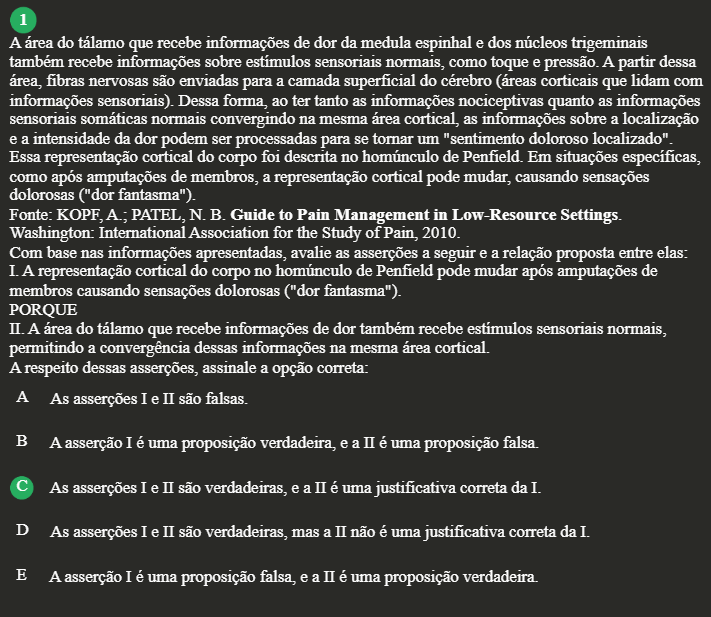 1 A área do tálamo que recebe informações de dor da medula espinhal e dos núcleos trigeminais também recebe informações sobre estímulos sensoriais normais, como toque e pressão. A partir dessa área, fibras nervosas são enviadas para a camada superficial do cérebro (áreas corticais que lidam com informações sensoriais). Dessa forma, ao ter tanto as informações nociceptivas quanto as informações sensoriais somáticas normais convergindo na mesma área cortical, as informações sobre a localização e a intensidade da dor podem ser processadas para se tornar um "sentimento doloroso localizado". Essa representação cortical do corpo foi descrita no homúnculo de Em situações específicas, como após amputações de membros, a representação cortical pode mudar, causando sensações dolorosas ("dor fantasma"). Fonte: KOPF, A.; PATEL, N.B. Guide to Pain Management in Low-Resource Settings. Washington: International Association for the Study of Pain, 2010. Com base nas informações apresentadas, avalie as asserções a seguir e a relação proposta entre elas: I. A representação cortical do corpo no homúnculo de Penfield pode mudar após amputações de membros causando sensações dolorosas ("dor fantasma"). PORQUE II. A do tálamo que recebe informações de dor também recebe estímulos sensoriais normais, permitindo a convergência dessas informações na mesma área cortical. A respeito dessas asserções, assinale a opção correta: A As asserções I e II são falsas. B A asserção I é uma proposição verdadeira, e a II é uma proposição falsa. C As asserções I e II são verdadeiras, e a II é uma justificativa correta da I. D As asserções I e II são verdadeiras, mas a II não é uma justificativa correta da I. E A asserção I é uma proposição falsa, e a II é uma proposição