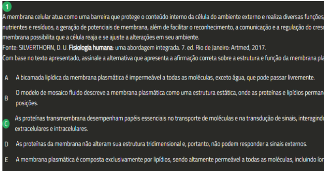 1 A membrana celular atua como uma barreira que protege 0 conteúdo interno da célula do ambiente externo e realiza diversas nutrientes e a geração de potenciais de membrana, além de facilitar 0 reconhecimento, a comunicação e a regulação do cres membrana possibilita que a célula reaja e se ajuste a alterações em seu ambiente. Fonte: SILVERTHORN, D.U. Fisiologia uma abordagem integrada. 7. ed. Rio de Janeiro: Artmed, 2017. Com base no texto apresentado, assinale a alternativa que apresenta a afirmação correta sobre a estrutura e função da membrana pla A A bicamada lipídica da membrana plasmática é impermeável a todas as moléculas, exceto água, que pode passar livremente. 0 modelo de mosaico fluido descreve a membrana como uma estrutura estática, onde as proteínas e lipídios perman B posições. As proteínas transmembrana desempenham papéis essenciais no transporte de moléculas e na transdução de sinais, extracelulares e intracelulares. D As da membrana não alteram sua estrutura tridimensional e, portanto, não podem responder a sinais externos. E A membrana plasmática é composta exclusivamente por lipídios, sendo altamente a todas as moléculas, incluindo