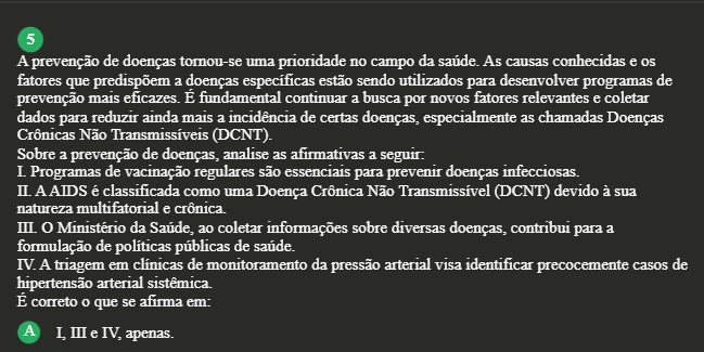 5 A prevenção de doenças tornou-se uma prioridade no campo da saúde. As causas conhecidas e os fatores que a doenças específicas estão sendo utilizados para desenvolver programas de prevenção mais eficazes. É fundamental continuar a busca por novos fatores relevantes e coletar dados para reduzir ainda mais a incidência de certas doenças, especialmente as chamadas Doenças Crônicas Não Transmissiveis (DCNT). Sobre a prevenção de doenças, analise as afirmativas a seguir: I. Programas de vacinação regulares são essenciais para prevenir doenças infecciosas. II. A AIDS é classificada como uma Doença Crônica Não (DCNT) devido à sua natureza multifatorial e III. O da Saúde, ao coletar informações sobre diversas doenças, contribui para a formulação de políticas públicas de saúde. IV. A triagem em de monitoramento da pressão arterial visa identificar precocemente casos de hipertensão arterial É correto que se afirma em: A I, III e IV, apenas.