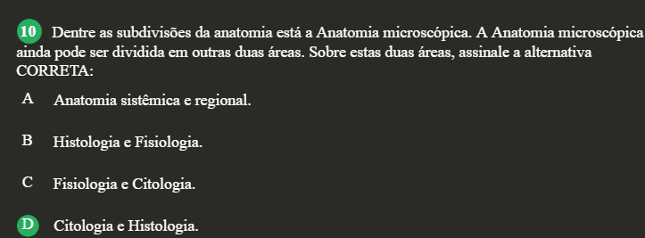 10 Dentre as subdivisões da anatomia está a Anatomia microscópica. A Anatomia microscópica ainda pode ser dividida em outras duas áreas. Sobre estas duas áreas, assinale a alternativa CORRETA: A Anatomia sistêmica e regional. B Histologia e Fisiologia. C Fisiologia e Citologia. D Citologia e Histologia.
