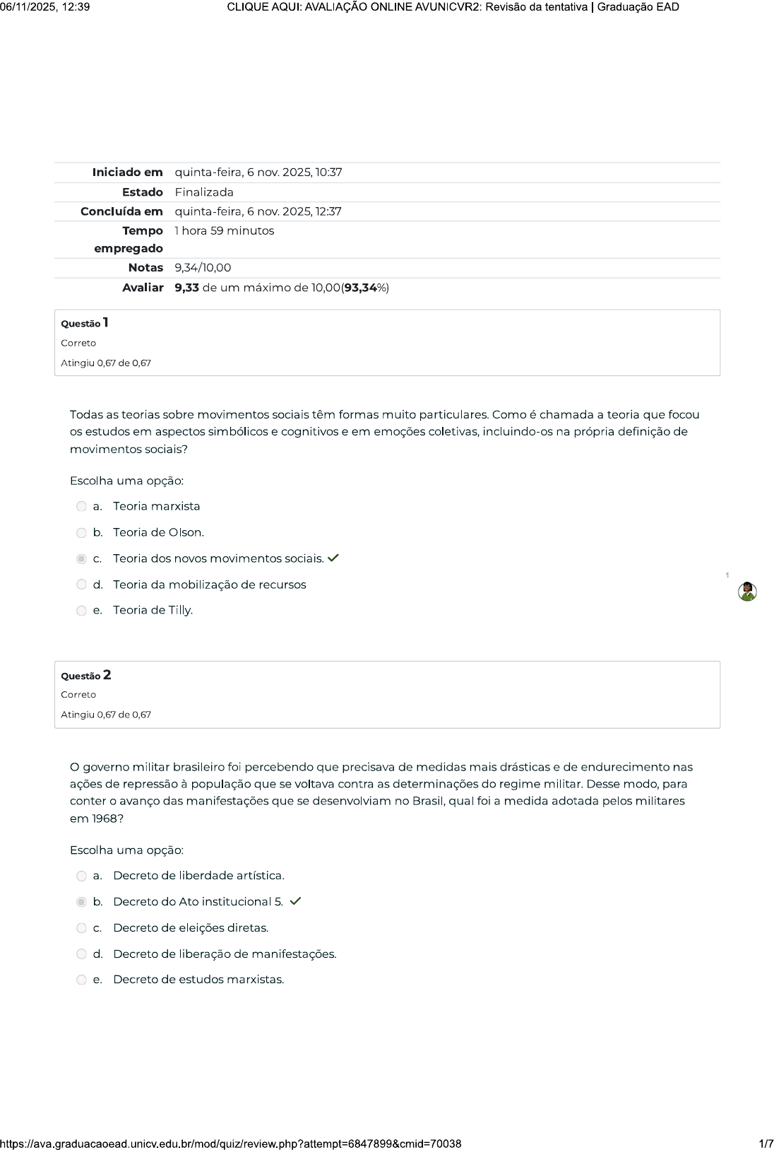 06/11/2025, 12:39 CLIQUE AQUI: AVALIAÇÃO ONLINE AVUNICVR2: Revisão da tentativa Graduação EAD Iniciado em quinta-feira, 6 nov. 2025, 10:37 Estado Finalizada Concluída em quinta-feira, 6 nov. 2025, 12:37 Tempo 1 hora 59 minutos empregado Notas 9,34/10,00 Avaliar 9,33 de um máximo de 10,00(93,34%) Questão 1 Correto Atingiu 0,67 de 0,67 Todas as teorias sobre movimentos sociais têm formas muito particulares. Como é chamada a teoria que focou os estudos em aspectos simbólicos e cognitivos e em emoções coletivas, incluindo-os na própria definição de movimentos sociais? Escolha uma opção: a. Teoria marxista b. Teoria de Olson. C. Teoria dos novos movimentos sociais. d. Teoria da mobilização de recursos e. Teoria de Tilly. Questão 2 Correto Atingiu 0,67 de 0,67 governo militar brasileiro foi percebendo que precisava de medidas mais drásticas e de endurecimento nas ações de repressão à população que se voltava contra as determinações do regime militar. Desse modo, para conter avanço das manifestações que se desenvolviam no Brasil, qual foi a medida adotada pelos militares em 1968? Escolha uma opção: a. Decreto de liberdade artística. b. Decreto do Ato institucional 5. C. Decreto de eleições diretas. d. Decreto de liberação de manifestações. e. Decreto de estudos marxistas. 1/706/11/2025, 12:39 CLIQUE AQUI: AVALIAÇÃO ONLINE AVUNICVR2: Revisão da tentativa Graduação EAD Questão 3 Correto Atingiu 0,67 de 0,67 Os conceitos de "espaço urbano" e de diálogo entre "as escolas e as cidades" indicam que: Escolha uma opção: a. há homogeneidade cultural, social e econômica nesses contextos, cenário que oferece situações, dificuldades e possibilidades lineares, e é essa configuração que deve ser levada em conta na elaboração das práticas educativas nas cidades. b. há multiplicidade cultural, social e econômica nesses contextos, cenário que oferece situações, dificuldades e possibilidades diversas, e é essa diversidade que deve ser levada em conta na elaboração das práticas educativas nas cidades. C. há multiplicidade cultural, social e econômica nesses contextos, cenário que oferece a possibilidade de criar um modelo de prática educacional e uma matriz curricular especial para cada escola, fazendo com que cada unidade escolar defina quais serão suas abordagens e práticas pedagógicas. d. não existem conflitos e tensões sociais e econômicas nesses contextos, cenário que oferece tranquilidade para a elaboração de políticas públicas educacionais nas cidades. e. há multiplicidade cultural, social e econômica nesses contextos, cenário que impede que as instituições ofereçam educação de qualidade nas cidades. Questão 4 Correto Atingiu 0,67 de 0,67 Como se diferenciam as ações coletivas dos movimentos sociais? Escolha uma opção: a. Por motivos individuais de cada membro do grupo. b. De acordo com a gestão pública C. Conforme a liderança d. Diante do desejo dos membros. e. As ações coletivas propõem uma união do grupo em benefício a um mesmo objetivo, e movimentos sociais visam a promover mudanças a partir da força grupal. 2/706/11/2025, 12:39 CLIQUE AQUI: AVALIAÇÃO ONLINE AVUNICVR2: Revisão da tentativa Graduação EAD Questão 5 Correto Atingiu 0,67 de 0,67 Movimento dos Trabalhadores Rurais Sem Terra exerceu e exerce papel fundamental na luta dos trabalhadores sem terra, que reivindicam a posse e direito à terra, foi responsável também por milhares de famílias assentadas e tem uma história de atuação política e de resistência. Sobre MST, é correto afirmar que: Escolha uma opção: a. Foi formado graças à CCONTAG, que, devido à expressão política, conseguiu grandes conquistas e formou movimento. b. Foi formado com investimento do Partido dos Trabalhadores, no intuito de fortalecer partido. C. Foi formado a partir de lideranças da CUT, que resolveram criar um movimento camponês. d. Foi formado a partir de diversas demandas envolvendo diferentes movimentos sociais e conflitos na década de 1980. e. Foi financiado pelo que financiou a organização e passou a atuar na construção de escolas do campo. Questão 6 Correto Atingiu 0,67 de 0,67 Os movimentos sociais, na sua maioria, têm como objetivo as mudanças sociais. Entende-se por mudança social uma alteração significativa nos padrões de comportamento e cultura, incluindo normas e valores. Os cientistas sociais se baseiam em duas explicações de como e por que as pessoas se mobilizam para causar mudanças: Escolha uma opção: a. Privação relativa e pobreza relativa. b. Mobilização de recursos e organização. C. Mobilização de esforços e injustiça social. d. Indignação em relação aos governantes e corrupção na política e. Privação relativa e mobilização de recursos. 3/706/11/2025, 12:39 CLIQUE AQUI: AVALIAÇÃO ONLINE AVUNICVR2: Revisão da tentativa Graduação EAD Questão 7 Correto Atingiu 0,67 de 0,67 que são os movimentos sociais? Escolha uma opção: a. São novas formas de ser sujeito. b. Destacam as maneiras de desenvolver autocrítica. C. Representam a busca por mudanças, chamando a atenção para discussões sobre as formas de viver nos setores menos visíveis da sociedade. d. São encontros de estudo sobre social. e. Impedem os diálogos que podem gerar discussões. Questão 8 Correto Atingiu 0,67 de 0,67 A relação entre Estado e sociedade civil pode garantir as condições necessárias para enfrentar, romper e construir uma nova ordem social, que possibilite ao Estado acolher as demandas da sociedade organizada. Neste contexto, a é fundamental, uma vez que contribui para a construção do consenso em relação ao interesse público, orientando Estado no atendimento às demandas da sociedade, sejam elas públicas ou privadas. Escolha uma opção: a. conflitos sociais b. luta social C. interesses sociais d. participação social e. fiscalização social Questão 9 Correto Atingiu 0,67 de 0,67 probl