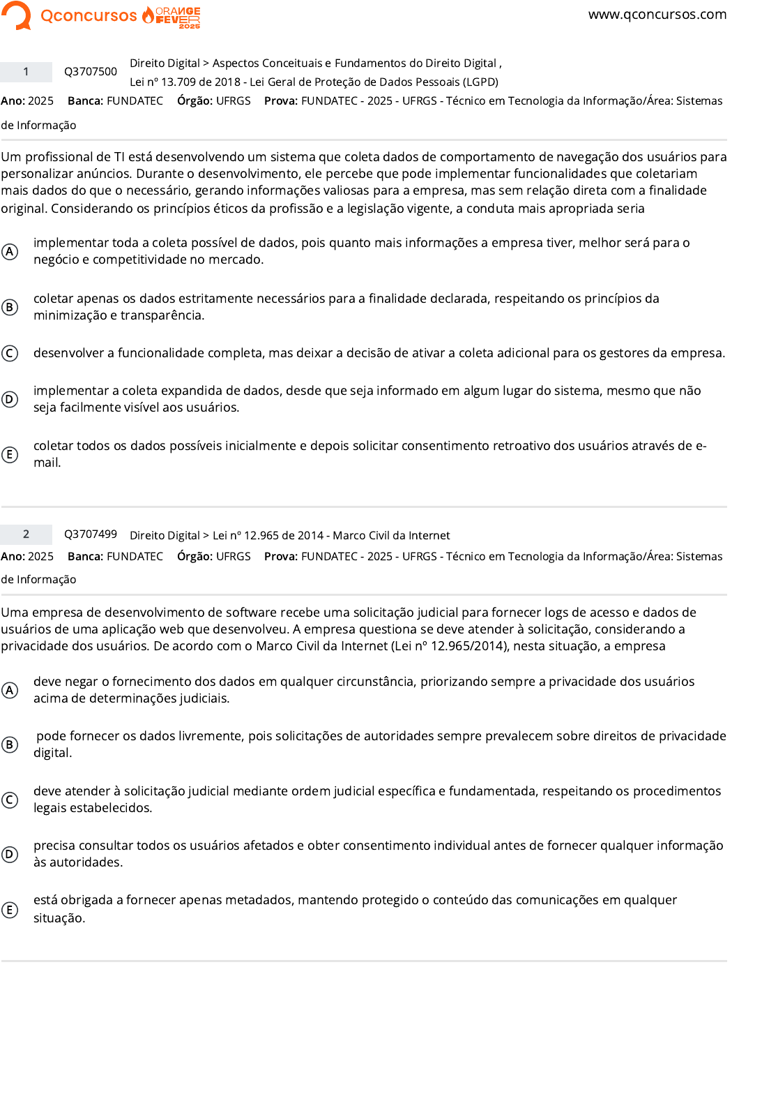 www.qconcursos.com Ano: 2025 Banca: FUNDATEC Órgão: UFRGS Um profissional de TI está desenvolvendo um sistema que coleta dados de comportamento de navegação dos usuários para personalizar anúncios. Durante o desenvolvimento, ele percebe que pode implementar funcionalidades que coletariam mais dados do que o necessário, gerando informações valiosas para a empresa, mas sem relação direta com a finalidade original. Considerando os princípios éticos da profissão e a legislação vigente, a conduta mais apropriada seria A implementar toda a coleta possível de dados, pois quanto mais informações a empresa tiver, melhor será para o negócio e competitividade no mercado. B coletar apenas os dados estritamente necessários para a finalidade declarada, respeitando os princípios da minimização e transparência. C desenvolver a funcionalidade completa, mas deixar a decisão de ativar a coleta adicional para os gestores da empresa. D implementar a coleta expandida de dados, desde que seja informado em algum lugar do sistema, mesmo que não seja facilmente visível aos usuários. E coletar todos os dados possíveis inicialmente e depois solicitar consentimento retroativo dos usuários através de e- mail. Ano: 2025 Banca: FUNDATEC Órgão: UFRGS Uma empresa de desenvolvimento de software recebe uma solicitação judicial para fornecer logs de acesso e dados de usuários de uma aplicação web que desenvolveu. A empresa questiona se deve atender à solicitação, considerando a privacidade dos usuários. De acordo com o Marco Civil da Internet (Lei nº 12.965/2014), nesta situação, a empresa A deve negar o fornecimento dos dados em qualquer circunstância, priorizando sempre a privacidade dos usuários acima de determinações judiciais. B pode fornecer os dados livremente, pois solicitações de autoridades sempre prevalecem sobre direitos de privacidade digital. C deve atender à solicitação judicial mediante ordem judicial específica e fundamentada, respeitando os procedimentos legais estabelecidos. D precisa consultar todos os usuários afetados e obter consentimento individual antes de fornecer qualquer informação às autoridades. E está obrigada a fornecer apenas metadados, mantendo protegido o conteúdo das comunicações em qualquer situação. 1 Q3707500 >Direito Digital Aspectos Conceituais e Fundamentos do Direito Digital , Lei nº 13.709 de 2018 - Lei Geral de Proteção de Dados Pessoais (LGPD) Prova: FUNDATEC - 2025 - UFRGS - Técnico em Tecnologia da Informação/Área: Sistemas de Informação 2 Q3707499 >Direito Digital Lei nº 12.965 de 2014 - Marco Civil da Internet Prova: FUNDATEC - 2025 - UFRGS - Técnico em Tecnologia da Informação/Área: Sistemas de Informação https://www.qconcursos.com/ https://www.qconcursos.com/questoes-de-concursos/bancas/fundatec https://www.qconcursos.com/questoes-de-concursos/institutos/ufrgs https://www.qconcursos.com/questoes-de-concursos/bancas/fundatec https://www.qconcursos.com/questoes-de-concursos/institutos/ufrgs https://www.qconcursos.com/questoes-de-concursos/questoes/6924c206-ba https://www.qconcursos.com/questoes-de-concursos/disciplinas/direito-direito-digital https://www.qconcursos.com/questoes-de-concursos/disciplinas/direito-direito-digital/aspectos-conceituais-e-fundamentos-do-direito-digital https://www.qconcursos.com/questoes-de-concursos/disciplinas/direito-direito-digital/lei-n-13-709-de-2018-lei-geral-de-protecao-de-dados-pessoais-lgpd https://www.qconcursos.com/questoes-de-concursos/provas/fundatec-2025-ufrgs-tecnico-em-tecnologia-da-informacao-area-sistemas-de-informacao https://www.qconcursos.com/questoes-de-concursos/provas/fundatec-2025-ufrgs-tecnico-em-tecnologia-da-informacao-area-sistemas-de-informacao https://www.qconcursos.com/questoes-de-concursos/questoes/69108e91-ba https://www.qconcursos.com/questoes-de-concursos/disciplinas/direito-direito-digital https://www.qconcursos.com/questoes-de-concursos/disciplinas/direito-direito-digital/lei-n-12-965-de-2014-marco-civil-da-internet https://www.qconcursos.com/questoes-de-concursos/provas/fundatec-2025-ufrgs-tecnico-em-tecnologia-da-informacao-area-sistemas-de-informacao https://www.qconcursos.com/questoes-de-concursos/provas/fundatec-2025-ufrgs-tecnico-em-tecnologia-da-informacao-area-sistemas-de-informacao Ano: 2025 Banca: FUNDATEC Órgão: UFRGS Um técnico em TI de uma empresa pública tem acesso aos dados pessoais de cidadãos armazenados em um sistema interno. Durante seu trabalho, ele identifica informações pessoais de um conhecido e, sem autorização, utiliza esses dados para fins particulares, compartilhando-os com terceiros. Considerando a Lei Geral de Proteção de Dados Pessoais (LGPD, Lei nº 13.709/2018), essa conduta do servidor público configura: A Uso legítimo de dados, pois o servidor tem acesso autorizado ao sistema e pode utilizar as informações conforme sua necessidade profissional. B Ação justificável por interesse público, visto que servidores públicos podem acessar dados cidadãos quando necessário para suas funções. C Prática permitida, desde que os dados não sejam comercializados, pois a LGPD apenas proíbe o uso comercial de dados pessoais. D Conduta adequada se houver consentimento verbal do titular dos dados, independentemente de registro formal ou documentação. E Violação aos princípios da LGPD, especificamente aos princípios da finalidade e necessidade, podendo resultar em sanções administrativas e penais. Ano: 2025 Banca: FUNDATEC Órgão: UFRGS Considerando as disposições da LGPD e da Lei de Improbidade Administrativa, assinale a alternativa correta. A Compete ao controlador receber comunicações da autoridade nacional e adotar providências. B É permitida a decretação de indisponibilidade de bens sobre os valores a serem eventualmente aplicados a título de multa civil. C O controlador poderá determinar ao operador que elabore relatório de impacto à proteção de dados pessoais,