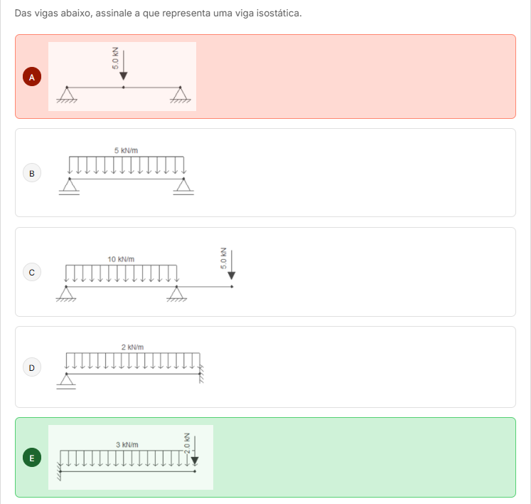 Das vigas abaixo, assinale a que representa uma viga isostática. 5.0 KN A 5 kN/m B 10 kN/m 5.0 KN C 2 kN/m D 3 kN/m 2 0 KN E