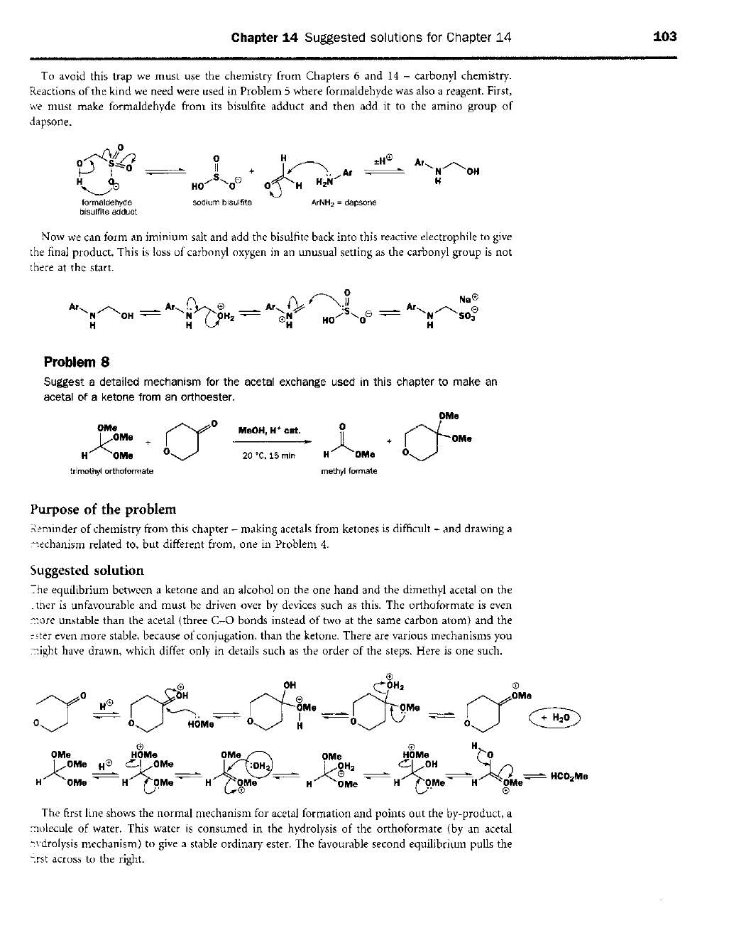 Chapter 14 Suggested solutions for Chapter 14 103 To avoid this trap we must use the chemistry from Chapters 6 and 14 - carbonyl chemistry. Reactions of the kind we need were used in Problem 5 where formaldehyde was also a reagent. First, we must make formaldehyde from its bisulfite adduct and then add it to the amino group of dapsone. 0 0 H 0 S Ar 0 + Ar N OH S H HO 0 0 H H formaldehyde sodium bisulfite ArNH₂ = dapsone bisulfite adduct Now we can form an iminium salt and add the bisulfite back into this reactive electrophile to give the final product. This is loss of carbonyl oxygen in an unusual setting as the carbonyl group is not there at the start. 0 Na Ar Ar Ar Ar S N OH N N N so HO 0 H H H H Problem 8 Suggest a detailed mechanism for the acetal exchange used in this chapter to make an acetal of a ketone from an orthoester. OMe OMe 0 MeOH, cat. 0 OMe + + OMe 0 H OMe 20 15 min H OMe 0 trimethyl orthoformate methyl formate Purpose of the problem Reminder of chemistry from this chapter - making acetals from ketones is difficult - and drawing a mechanism related to, but different from, one in Problem 4. Suggested solution The equilibrium between a ketone and an alcohol on the one hand and the dimethyl acetal on the ther is unfavourable and must be driven over by devices such as this. The orthoformate is even more unstable than the acetal (three C-O bonds instead of two at the same carbon atom) and the ester even more stable, because of conjugation, than the ketone. There are various mechanisms you might have drawn, which differ only in details such as the order of the steps. Here is one such. OH + 0 OH OMe OMe 0 0 HOMe 0 0 + H 0 + + H OMe HOMe OMe OMe HOMe 0 OMe H OMe OH₂ OH + HCO₂Me H OMe H H OMe H DMe H OMe H OMe The first line shows the normal mechanism for acetal formation and points out the by-product, a molecule of water. This water is consumed in the hydrolysis of the orthoformate (by an acetal hydrolysis mechanism) to give a stable ordinary ester. The favourable second equilibrium pulls the first across to the right.