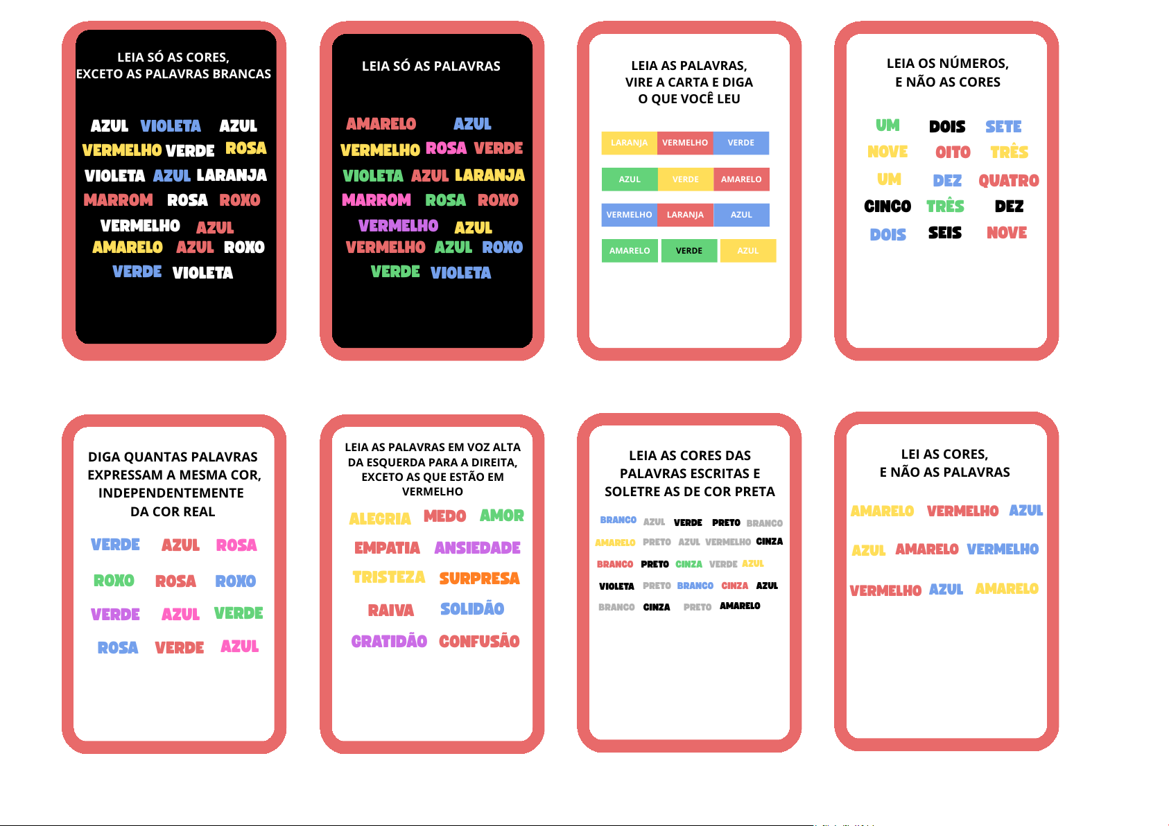 OITO UM DOIS LEIA OS NÚMEROS, E NÃO AS CORES SETE NOVE TRÊS UM DEZ QUATRO CINCO TRÊS DEZ DOIS SEIS NOVE LARANJA LEIA AS PALAVRAS, VIRE A CARTA E DIGA O QUE VOCÊ LEU VERMELHO VERDE AZUL VERDE AMARELO VERMELHO LARANJA AZUL AMARELO VERDE AZUL ROSA AMARELO LEIA SÓ AS PALAVRAS AZUL VERMELHO LARANJAVIOLETA VERDE AZUL MARROM ROSA ROXO VERMELHO AZUL VERMELHO AZUL ROXO VIOLETAVERDE ROSA VIOLETA LEIA SÓ AS CORES, EXCETO AS PALAVRAS BRANCAS AZUL VERMELHO LARANJAVIOLETA VERDE AZUL MARROM ROSA ROXO VERMELHO AZUL AMARELO AZUL ROXO VIOLETAVERDE AZUL AZUL DIGA QUANTAS PALAVRAS EXPRESSAM A MESMA COR, INDEPENDENTEMENTE DA COR REAL VERDE ROSA ANSIEDADE ALEGRIA MEDO LEIA AS PALAVRAS EM VOZ ALTA DA ESQUERDA PARA A DIREITA, EXCETO AS QUE ESTÃO EM VERMELHO SOLIDÃO EMPATIA CONFUSÃO TRISTEZA SURPRESA GRATIDÃO RAIVA AMOR BRANCO BRANCO AZUL LEIA AS CORES DAS PALAVRAS ESCRITAS E SOLETRE AS DE COR PRETA VERDE AMARELO LEI AS CORES, E NÃO AS PALAVRAS ROXO ROSA ROXO VERDE AZUL VERDE ROSA AZULVERDE PRETO BRANCO PRETO AZUL VERMELHO CINZA PRETO CINZA VERDE AZUL VIOLETA PRETO BRANCO CINZA AZUL BRANCO CINZA PRETO AMARELO AMARELO AZULVERMELHO AZUL AMARELO VERMELHO VERMELHO AZUL AMARELO DESAFIOS EFEITO STROOP DE DESAFIOS EFEITO STROOP DE DESAFIOS EFEITO STROOP DE DESAFIOS EFEITO STROOP DE DESAFIOS EFEITO STROOP DE DESAFIOS EFEITO STROOP DE DESAFIOS EFEITO STROOP DE DESAFIOS EFEITO STROOP DE DIGA AS CORES DOS NÚMEROS E O NOME DAS LETRAS. LEIA AS CORES, EXCETO AS AMARELAS. LEIA AS PALAVRAS, E NÃO AS CORES. LEIA ALTERNADAMENTE UM NÚMERO E UMA COR. DIGA A COR DA PALAVRA EM SILÊNCIO E CANTE A PALAVRA ESCRITA. DIGA EM VOLZ ALTA A COR EM QUE A PALAVRA ESTÁ ESCRITA. LEIA AS CORES, VIRE A CARTA E DIGA O QUE VOCÊ LEU DIGA SÓ AS CORES DOS X RED YELLOW BLUE BLACK PURPLE ORANGE GREEN YELLOW RED ORANGE GREEN BLACK BLUE RED PURPLE GREEN BLUE ORANGE 2 0 1 4 9 3 5 7 6 8 2 0 1 4 9 2 5 8 ROSAROXO AZUL VERDE AZUL VERDE ROXO ROSA ROSA AZUL VERDE ROXO BRANCO PRETO VERDE PRETO AZUL PRETO AZUL CINZA BRANCOBRANCO CINZA AZUL BRANCO CINZA PRETO 1 T 8A R3 C9 7L2S 4D F5 6P G2 6B E7 VERDE AZUL AMARELO VERMELHO VERMELHO VERDE AZUL VERDE AMARELO AX YZXKHLXP TD A UN MDXQ IXVX OX XB XXM EXRAA BO DESAFIOS EFEITO STROOP DE DESAFIOS EFEITO STROOP DE DESAFIOS EFEITO STROOP DE DESAFIOS EFEITO STROOP DE DESAFIOS EFEITO STROOP DE DESAFIOS EFEITO STROOP DE DESAFIOS EFEITO STROOP DE DESAFIOS EFEITO STROOP DE LEIA A COR E APONTE PARA O QUADRADO CORRESPONDENTE À PALAVRA ESCRITA LEIA A COR E APONTE PARA O CÍRCULO CORRESPONDENTE À PALAVRA ESCRITA LEIA A COR E APONTE PARA O CÍRCULO CORRESPONDENTE À PALAVRA ESCRITA LEIA AS LESTRAS, E NÃO AS CORES LEIA O NOME DAS CORES LEIA A PALAVRA E APONTE PARA O QUADRADO CORRESPONDE À COR LEIA A COR, E NÃO A PALAVRA, E APONTE PARA O QUADRADO CORRESPONDENTE LEIA A PALAVRA, E NÃO A COR, E APONTE PARA O QUADRADO CORRESPONDENTE RED BLUE YELLOW GREEN OI HELLO BONJOUR ALOHA SHALOM I T MR H IA AONR M O M Ú S I CA prata marrom dourado branco branco dourado prata marrom branco branco dourado prata VERMELHO AMARELO AZUL PRETO VERDE VERMELHO AMARELO AZUL PRETO VERDE AMARELO Amarelo AZUL Azul Vermelho VERMELHO Amarelo Azul Vermelho AMARELO AZUL VERMELHO DESAFIOS EFEITO STROOP DE DESAFIOS EFEITO STROOP DE DESAFIOS EFEITO STROOP DE DESAFIOS EFEITO STROOP DE DESAFIOS EFEITO STROOP DE DESAFIOS EFEITO STROOP DE DESAFIOS EFEITO STROOP DE DESAFIOS EFEITO STROOP DE LEIA AS CORES. LEIA A COR DO QUADRADO E DIGA QUAL É A COR DA PALAVRA ESCRITA CORRESPONDENTE. LEIA AS CORES DOS CÍRCULOS E, QUANDO VOCÊ LER A PLAVRA ESCRITA, SOLETRE-A DE TRÀS PARA FRENTE. LEIA A PALAVRA E APONTE O CÍRCULO CORRESPONDENTE À COR. LEIA A COR DAS FIGURAS E APONTE PARA A PALAVRA CORRESPONDENTE. LEIA OS NÚMEROS E AS CORES. CRONOMETRE O TEMPO EM CADA TENTATIVA. LEIA OS NÚMEROS, E NÃO AS CORES, DA DIREITA PARA A ESQUERDA LEIA AS CORES DAS PALAVRAS VERMELHO AMARELO AZUL ROSA VERDE AZUL BEGE ROSA PRATA VERDE ROXO AMARELO AZUL LARANJA VERMELHO AMARELO AZUL VERMELHOVERDE 3 5 6 3 5 6 5 3 0 9 8 2 7 6 9 0 1 7 5 8 2 colorido violeta cromático prisma espectro matiz luz DESAFIOS EFEITO STROOP DE DESAFIOS EFEITO STROOP DE DESAFIOS EFEITO STROOP DE DESAFIOS EFEITO STROOP DE DESAFIOS EFEITO STROOP DE DESAFIOS EFEITO STROOP DE DESAFIOS EFEITO STROOP DE DESAFIOS EFEITO STROOP DE LEIA AS PALAVRAS EM ORDEM, E DEPOIS LEIA AS CORES EM ORDEM LEIA AS CORES, E NÃO OS NÚMEROS, FALANDO UMA COR E PULANDO A OUTRA. LEIA A COR, E NÃO OS NÚMEROS, NO SENTIDO VERTICAL. LEIA OS NÚMEROS DA ESQUERDA PARA A DIREITA, EXCETO OS QUE ESTÃO EM AMARELO LEIA AS PALAVRAS, E NÃO AS CORES. LEIA AS CORES, E NÃO AS PALAVRAS LEIA A COR DA PALAVRA À ESQUERDA E APONTE PARA O NOME DA COR ESCRITA À DIREITA QUANDO ESTIVER ESCRITO VERMELHO, DIGA AZUL; QUANDO ESTIVER ESCRITO AZUL, DIGA VERMELHO. QUANTO ÀS OUTRAS PALAVRAS, LEIA O NOME DA COR 8 3 4 7 0 5 2 9 1 4 3 6 6 2 8 5 8 9 3 5 2 1 8 6 0 4 9 3 4 1 7 8 0 5 3 2 9 8 9 2 7 6 9 2 3 1 7 5 8 2 6 AZULAMARELO AMARELO VERMELHO AZUL AMARELO VERMELHO AZUL AMARELO AZULAMARELO LARANJA PRETO ROXO VERMELHO VERDE AMARELO VERMELHO LARANJA VERDE PRETO AZUL VERMELHO ROXO VERDE AZUL LARANJA VERDE AZUL AMARELO VERMELHO AMARELO AZUL AZUL AZUL VERMELHO VERDE AMARELO VERMELHOAMARELO AMARELO VERDE LARANJA VIOLETA ROSA VERDE AZUL Laranja Azul Verde Violeta Rosa VERMELHO AZUL VERMELHO AZULAMARELO AMARELO VERMELHO AZUL AZUL VERMELHO AMARELO VERMELHO DESAFIOS EFEITO STROOP DE DESAFIOS EFEITO STROOP DE DESAFIOS EFEITO STROOP DE DESAFIOS EFEITO STROOP DE DESAFIOS EFEITO STROOP DE DESAFIOS EFEITO STROOP DE DESAFIOS EFEITO STROOP DE DESAFIOS EFEITO STROOP DE LEIA A PALAVRA, EM SEGUIDA DIGA A COR EM QUE ELA ESTÁ ESCRITA. LEIA A CITAÇÃO E DIGA A COR DA PALAVRA ESCRITA. DIGA A COR DO CÍRCULO EM DIFERENTES TONS DE VOZ: ALTO, MÉDIO E BAIXO, DE ACORDO COM O TAMANHO. DIGA A COR DA PALAVBRA RAPIDAMENTE, COMO SE ESTIVESSE EM UMA CORRIDA. FAÇA O EXERCÍCIO COM UM CRONÔMETRO, LENDO AS PALAVRAS, E NÃO AS CORES, O MAIS RÁPIDO QUE PUDER. DIGA A COR DAS PALAVRAS, SOLETRANDO-AS. LE