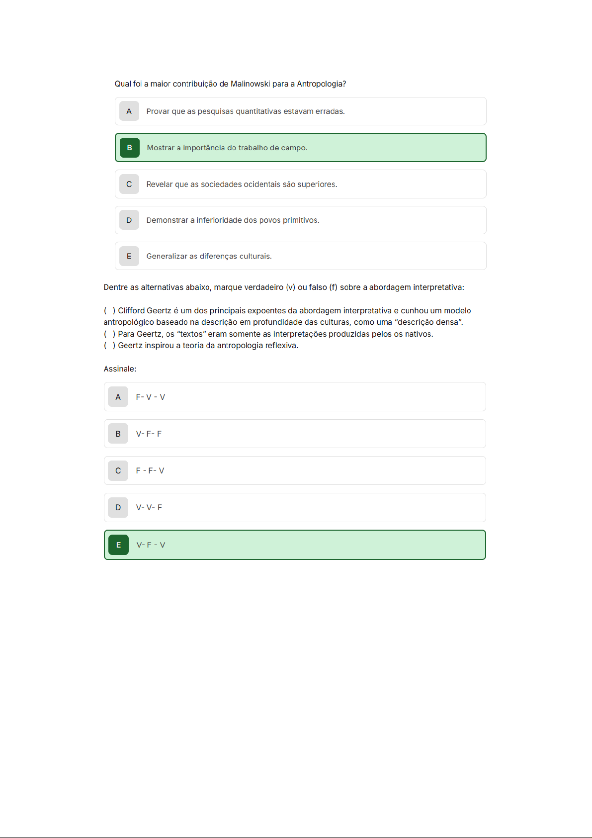 Qual foi a maior contribuição de Malinowski para a Antropologia? A Provar que as pesquisas quantitativas estavam erradas. Mostrar a importância do trabalho de campo. Revelar que as sociedades ocidentais são superiores. D Demonstrar a inferioridade dos povos primitivos. E Generalizar as diferenças culturais. Dentre as alternativas abaixo, marque verdadeiro (v) ou falso (f) sobre a abordagem interpretativa: Clifford Geertz é um dos principais expoentes da abordagem interpretativa e cunhou um modelo antropológico baseado na descrição em profundidade das culturas, como uma "descrição densa". Para Geertz, os "textos" eram somente as interpretações produzidas pelos os nativos. Geertz inspirou a teoria da antropologia reflexiva. Assinale: A F-V-V V-F-F D V-V-F E V-F-VAcerca do interacionismo simbólico, analise as alternativas: 1. Analisa somente os problemas sociais pela perspectiva da antropologia urbana. 2. Destaca a importância do indivíduo como intérprete do mundo. 3. Seus métodos visam a compreender as significações que os próprios indivíduos empregam para construir seu mundo social. Assinale a alternativa correta: A Somente a sentença é correta. As sentenças I e são corretas. Somente a sentença III é correta. D As sentenças e III são corretas E Somente a sentença é correta. Sobre a Escola de Chicago, seu principal objeto ou abordagem, assinale a alternativa correta. A Escola de Chicago concentrou seus estudos na abordagem de campo em sociedades A "primitivas". Essa corrente teórica é resultado do êxodo rural europeu. Os objetos principais da Escola de Chicago durante o século XX foram os problemas sociais criados pelos processos migratórios, as relações raciais e demandas de classe. Os antropólogos vinculados à Escola de Chicago tenderam a uma análise coletivista das D comunidades. As críticas direcionas a essa corrente teórica foram baseadas em sua abordagem orientada E pelo materialismo histórico.Com base no caso apresentado em Nu & Vestido (2002), de Goldenberg, analise as alternativas: 1. É correto afirmar que a categoria de corpo utilizado para a análise da cultura brasileira contemporâ- nea é empregada no olhar antropológico da autora sobre as relações conjugais. 2. Homens e mulheres refletem, em suas respostas, elementos da "dominação masculina" de maneira igual. 3. Homens e mulheres são atingidos e buscam uma noção de "corpo perfeito" de maneiras diferentes, mas direcionados pela "dominação masculina", o que resulta em diferentes maneiras de serem afetados. Assinale a alternativa correta. A Somente I e II. Somente e III. Apenas III. D Apenas e III E Somente I. RespondaMarque verdadeiro (V) ou falso (F) em relação às considerações de Gilles Lipovetsky sobre a febre da "beleza-magreza-juventude" e sua relação com o caso brasileiro. Gilles Lipovetsky aponta que a tendência de valorização do binômio magreza-juventude incide de maneira implacável a mulheres. A obsessão pela a magreza é resultado do poder normalizador dos modelos e vinculado a um de- sejo de conformidade estética que vai de encontro com ideal individualista e sua exigência de perso- nalização dos sujeitos. ideal de autonomia individual não incide sobre a exigência de conformidade aos modelos sociais de corpo. Assinale a opção correta: A F-V-V V-F-F D V-V-F E V-F-V Um grupo de antropólogos busca entender as práticas culturais de uma comunidade indígena brasileira, enfocando especialmente em suas cerimônias e rituais. Com base no estudo de caso apresentado, qual abordagem teórica em antropologia cultural poderia ser mais apropriada para entender profundamente as práticas culturais, especialmente cerimônias e rituais, da comunidade indígena mencionada? A Teoria Evolucionista, que busca entender a evolução das sociedades a partir de estágios definidos Estruturalismo, que procura entender as estruturas mentais universais que moldam as crenças culturais Funcionalismo, que interpreta cada parte da sociedade em termos de como contribui para a estabilidade da totalidade D Difusionismo Cultural, que foca em como os itens culturais se espalham entre grupos E Materialismo Cultural, que foca nas condições materiais e ambientais como formadoras da culturaQual a importância da observação participante? A Compreender de dentro o significado das lógicas de cada cultura. Participar das atividades e festas dos povos primitivos. Conhecer as gírias locais. D Saber como se comportar de acordo com cada cultura. E Aprender coisas novas e diferentes. Em um seminário acadêmico sobre metodologias de pesquisa, estudantes debatem sobre abordagens que tentam compreender o mundo através das perspectivas dos atores sociais e os significados que eles atribuem a objetos e ações. Quais das seguintes escolas se inserem na tradição metodológica qualitativa, tentando ver o mundo através dos olhos dos atores sociais? A Positivismo e Funcionalismo Estruturalismo e Materialismo Dialético c Fenomenologia e Etnometodologia D Behaviorismo e Empirismo E Marxismo e Determinismo A antropologia de gabinete, marcada pela relação descritiva, marca uma tradição anterior à antropologia que está fundamentada no: A Interesse pela cultura do outro como algo estranho ou curioso olhar de admiração da cultura do outro. estudo das formas de dominação da cultura do outro. D A tradição etnocêntrica de perceber no outro alguém ruim, a ser destruído. E Os estudos sobre o estranhamento e as forças das outras culturas.Maria, estudante de Antropologia, está intrigada com a influência de fatores materiais e ambientais na formação da cultura de uma tribo ribeirinha no Amazonas. Qual teoria antropológica Maria deve considerar para focar na influência de condições materiais e ambientais na formação cultural da tribo ribeirinha? A Estruturalismo Funcionalismo c Materialismo Cultural D Difusionismo Cultural E Teoria Evolucionista A Antropologia Cultural inve