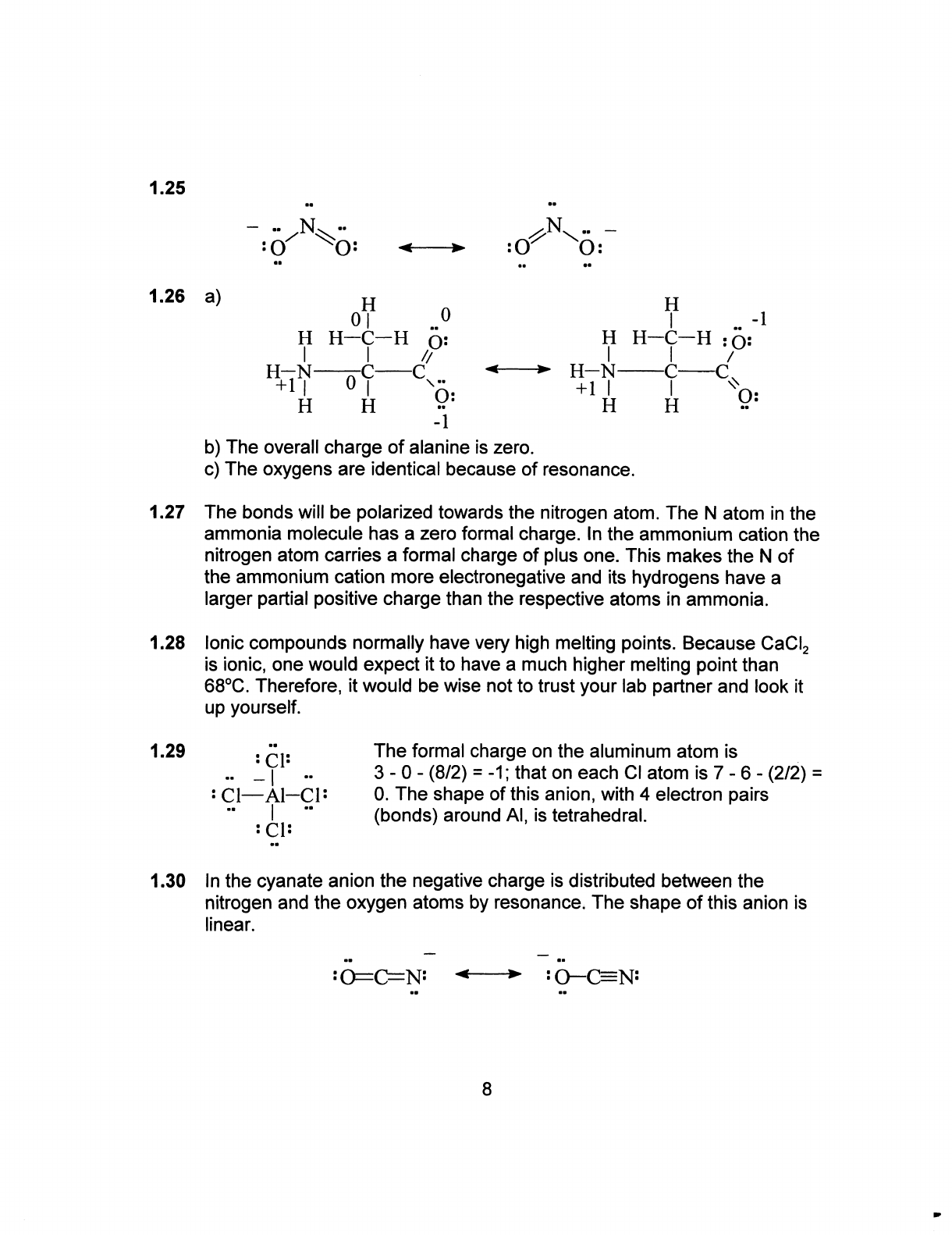 1.25 N N : O: : .. 1.26 a) H H 01 -1 H H-C-H H-N C C H-N C C +1 O: +1 H H H O: H -1 b) The overall charge of alanine is zero. c) The oxygens are identical because of resonance. 1.27 The bonds will be polarized towards the nitrogen atom. The N atom in the ammonia molecule has a zero formal charge. In the ammonium cation the nitrogen atom carries a formal charge of plus one. This makes the N of the ammonium cation more electronegative and its hydrogens have a larger partial positive charge than the respective atoms in ammonia. 1.28 compounds normally have very high melting points. Because CaCl₂ is ionic, one would expect it to have a much higher melting point than 68°C. Therefore, it would be wise not to trust your lab partner and look it up yourself. 1.29 : Cl: The formal charge on the aluminum atom is 3 - 0 - (8/2) = -1; that on each CI atom is 7 - 6 - (2/2) = : Cl Al Cl: The shape of this anion, with 4 electron pairs (bonds) around is tetrahedral. : Cl: 1.30 In the cyanate anion the negative charge is distributed between the nitrogen and the oxygen atoms by resonance. The shape of this anion is linear. :0=C=N: : 8