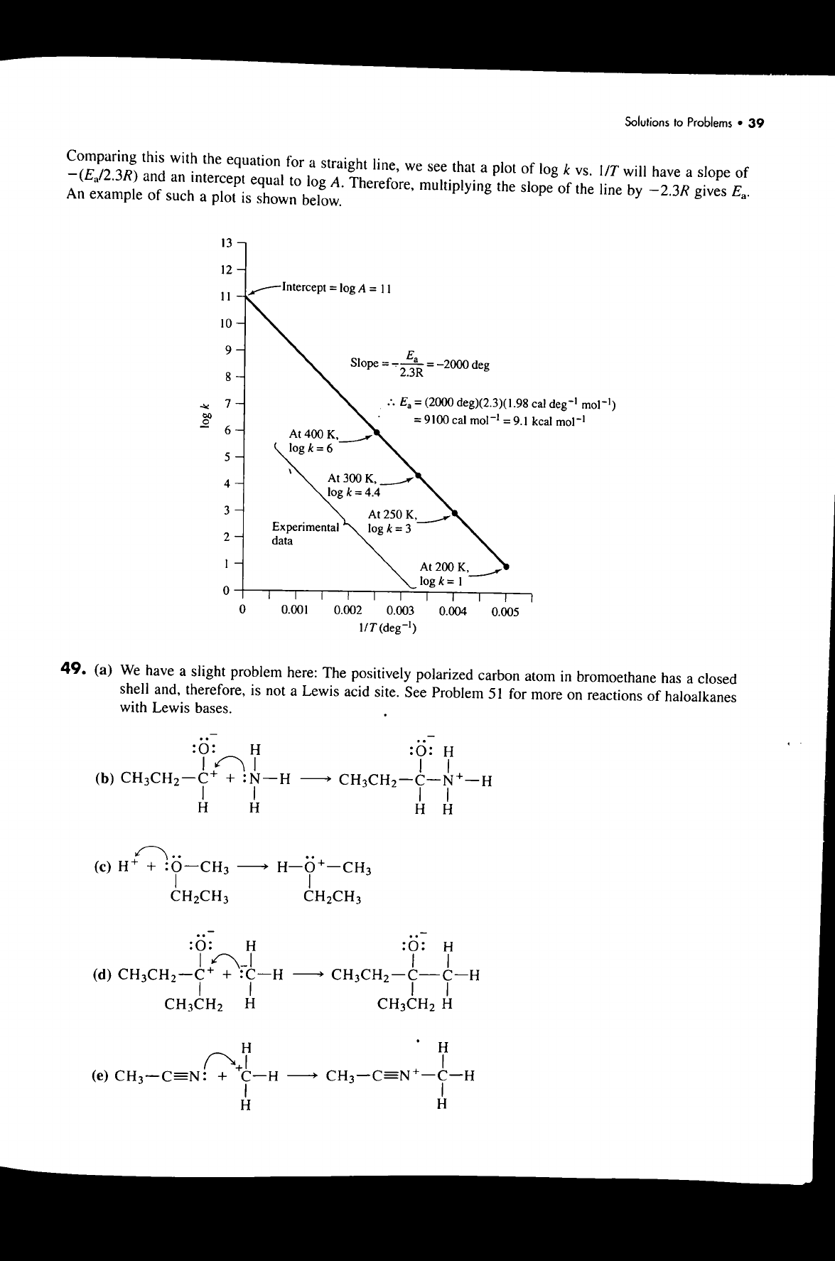 Solutions to Problems 39 Comparing this with the equation for a straight line, we see that a plot of log k 1/T will have a slope of and an intercept equal to log A. Therefore, multiplying the slope of the line by -2.3R gives An example of such a plot is shown below. 13 12 Intercept = log A = 11 11 10 9 Slope = -2000 deg 8 7 :. = (2000 deg)(2.3)(1.98 cal deg⁻¹ log k = 9100 cal mol -1 = 9.1 kcal 6 At 400 K, log k = 6 5 At 300 K, 4 log k = 4.4 3 At 250 K, Experimental log k = 3 2 data At 200 K, log k = 1 0 0 0.001 0.002 0.003 0.004 0.005 1/T (deg⁻¹) 49. (a) We have a slight problem here: The positively polarized carbon atom in bromoethane has a closed shell and, therefore, is not a Lewis acid site. See Problem 51 for more on reactions of haloalkanes with Lewis bases. :0: H (b) CH₃CH₂ C + N H H H H H H (c) H + + CH₃ CH₂CH₃ :0: H :0: H (d) CH₃CH₂ C + H CH₃CH₂ H CH₃CH₂ H H H + (e) CH₃ + C H CH₃ H H H
