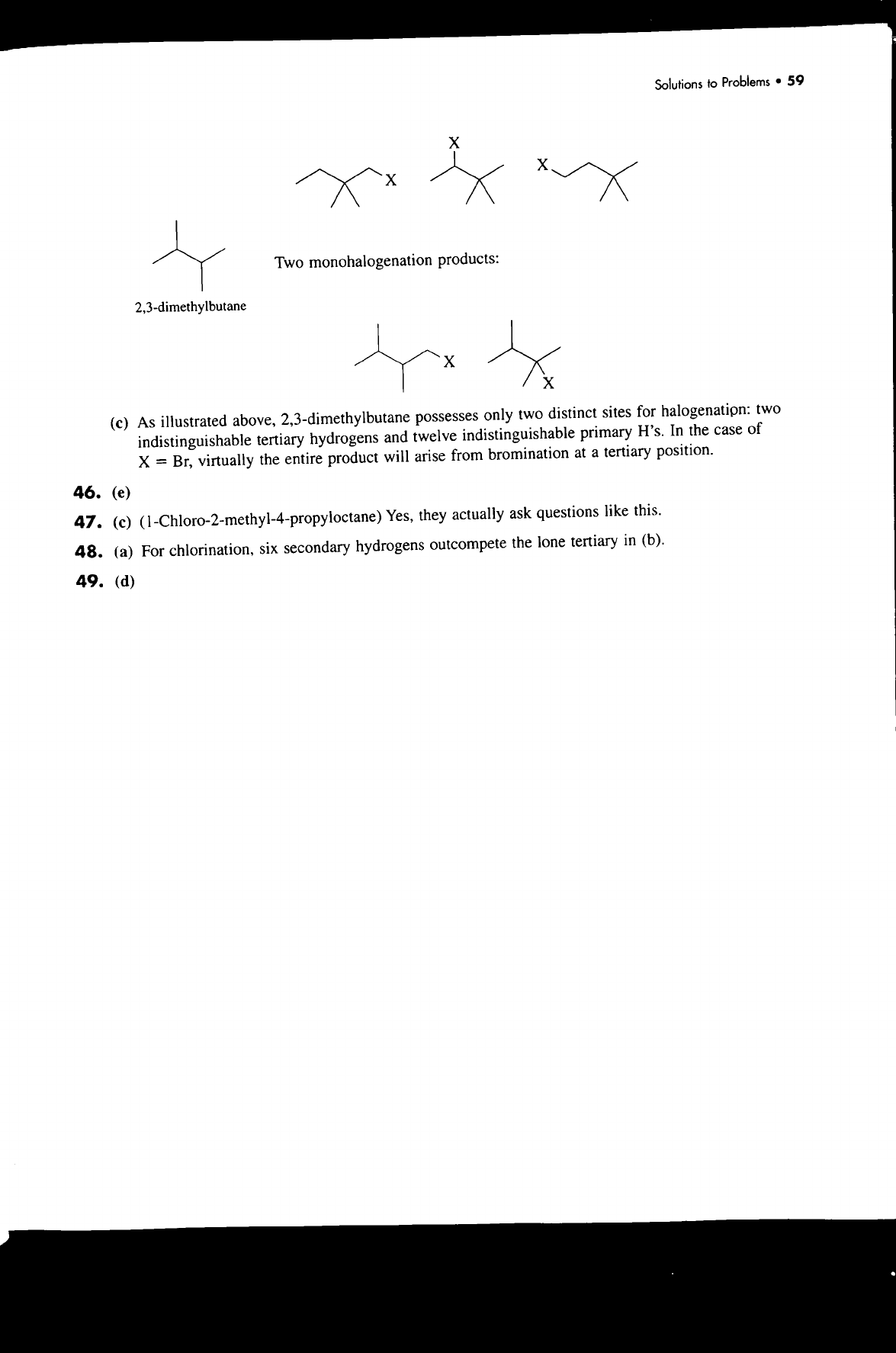 Solutions to Problems 59 X X X Two monohalogenation products: 2,3-dimethylbutane X X (c) As illustrated above, 2,3-dimethylbutane possesses only two distinct sites for halogenation: two indistinguishable tertiary hydrogens and twelve indistinguishable primary H's. In the case of X = Br, virtually the entire product will arise from bromination at a tertiary position. 46. (e) 47. (c) (1-Chloro-2-methyl-4-propyloctane) Yes, they actually ask questions like this. 48. (a) For chlorination, six secondary hydrogens outcompete the lone tertiary in (b). 49. (d)