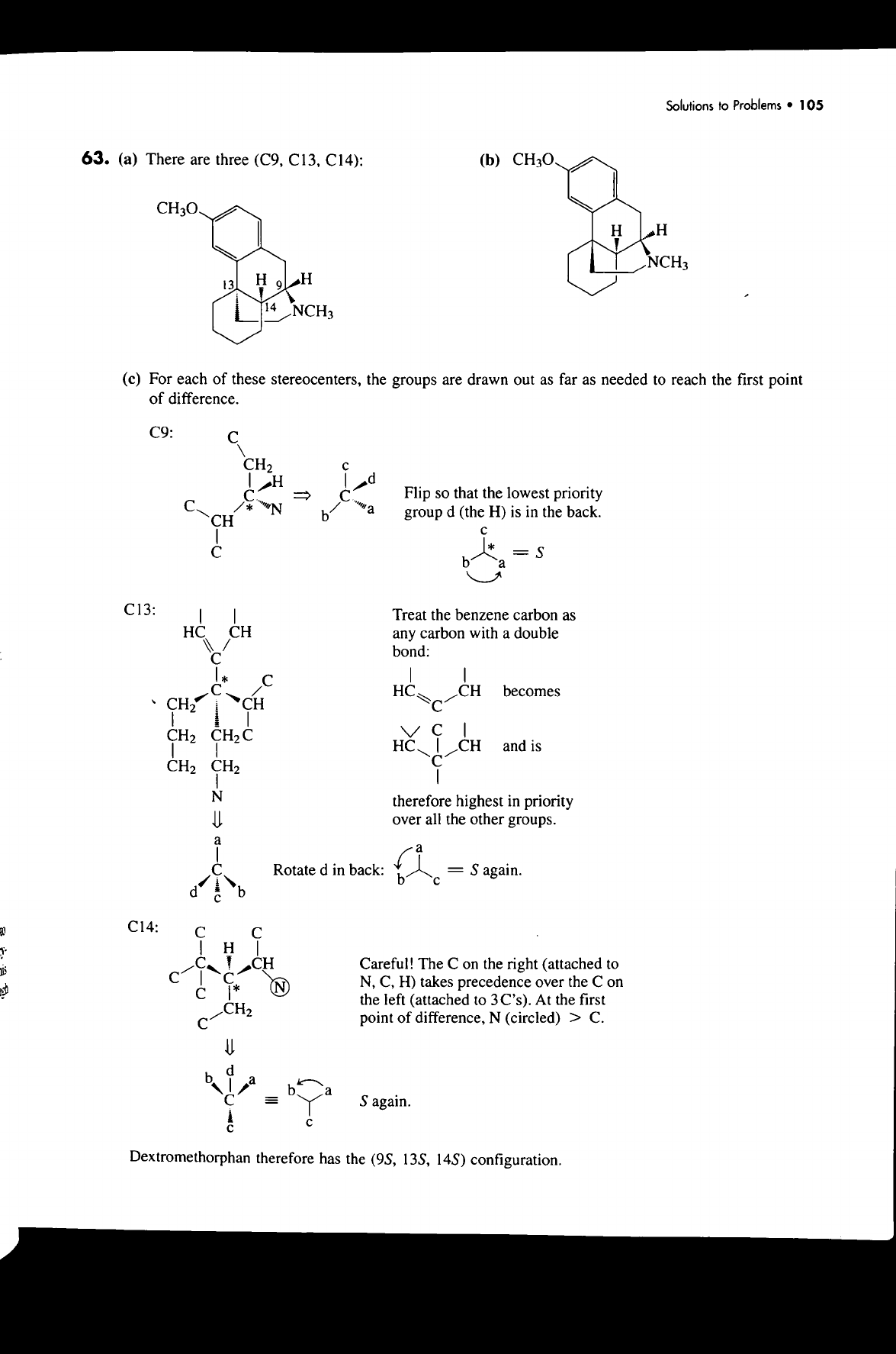 Solutions to Problems 105 63. (a) There are three (C9, C13, C14): (b) H H NCH₃ 13 H H 9 14 NCH₃ (c) For each of these stereocenters, the groups are drawn out as far as needed to reach the first point of difference. C9: C CH₂ H d C C Flip so that the lowest priority C * N a CH b group d (the H) is in the back. c C * S b a C13: Treat the benzene carbon as HC CH any carbon with a double bond: C * C C HC CH becomes CH₂ CH C CH₂ CH₂ C C HC CH and is CH₂ CH₂ C N therefore highest in priority over all the other groups. a a C Rotate d in back: = b S again. c d b c C14: C C H C CH Careful! The C on the right (attached to C C * N N, C, H) takes precedence over the C on C the left (attached to 3C's). At the first CH₂ C point of difference, N (circled) > C. d b a b a C III S again. c Dextromethorphan therefore has the (9S, 13S, 14S) configuration.
