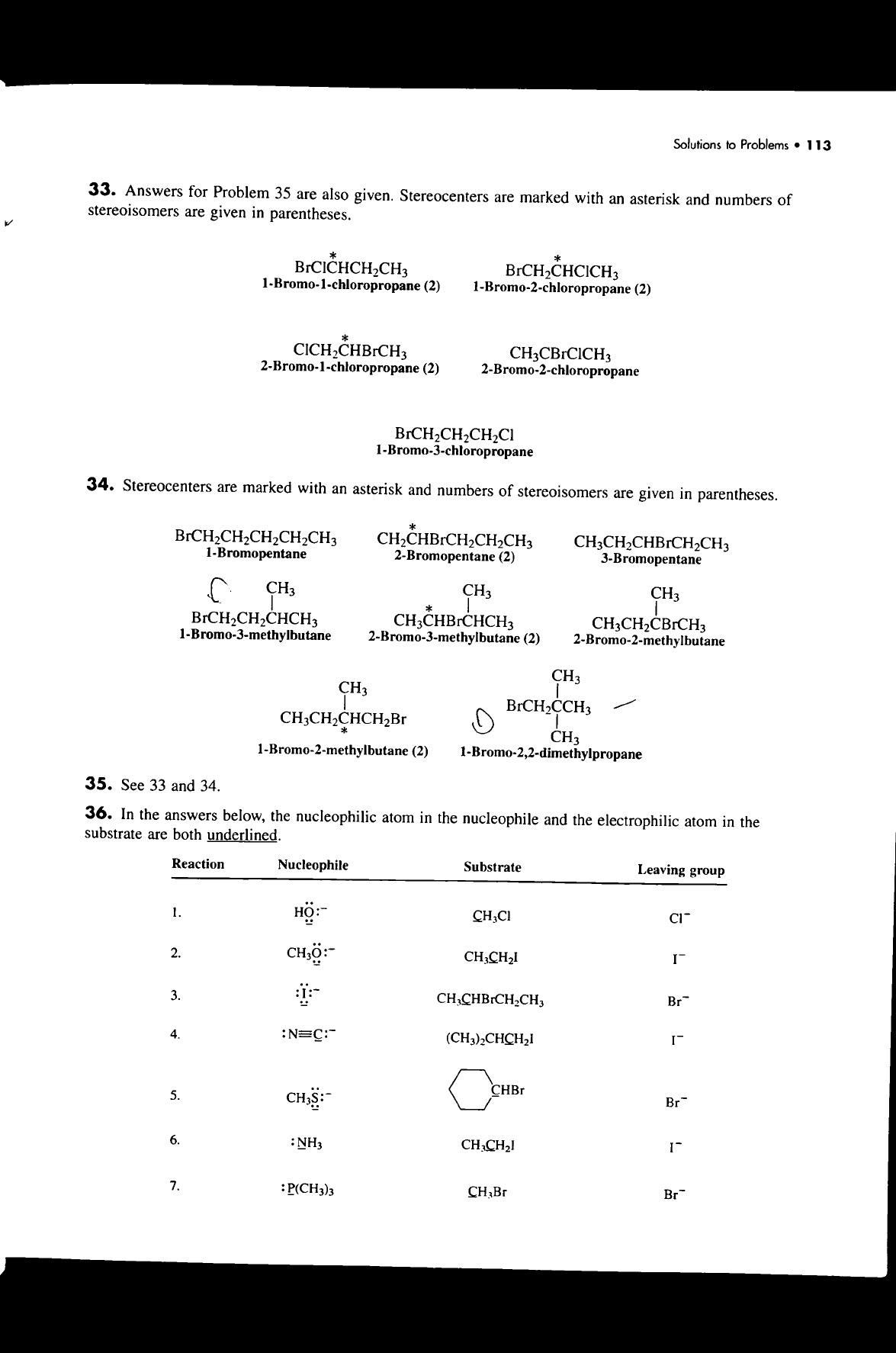 Solutions to Problems 113 33. Answers for Problem 35 are also given. Stereocenters are marked with an asterisk and numbers of stereoisomers are given in parentheses. * * BrCH₂CHCICH₃ 1-Bromo-1-chloropropane (2) 1-Bromo-2-chloropropane (2) * CICH₂CHBrCH₃ 2-Bromo-1-chloropropane (2) 2-Bromo-2-chloropropane BrCH₂CH₂CH₂Cl 1-Bromo-3-chloropropane 34. Stereocenters are marked with an asterisk and numbers of stereoisomers are given in parentheses. * BrCH₂CH₂CH₂CH₂CH₃ CH₃CH₂CHBrCH₂CH₃ 1-Bromopentane 2-Bromopentane (2) 3-Bromopentane CH₃ CH₃ CH₃ * BrCH₂CH₂CHCH₃ CH₃CH₂CBrCH₃ 1-Bromo-3-methylbutane 2-Bromo-3-methylbutane (2) 2-Bromo-2-methylbutane CH₃ CH₃ BrCH₂CCH₃ CH₃CH₂CHCH₂Br * CH₃ 1-Bromo-2-methylbutane (2) 1-Bromo-2,2-dimethylpropane 35. See 33 and 34. 36. In the answers below, the nucleophilic atom in the nucleophile and the electrophilic atom in the substrate are both underlined. Reaction Nucleophile Substrate Leaving group 1. HO:- CH₃Cl 2. CH₃CH₂I :i:- 3. Br⁻ 4. CHBr 5. 6. :NH₃ 7. :P(CH₃)₃ Br⁻