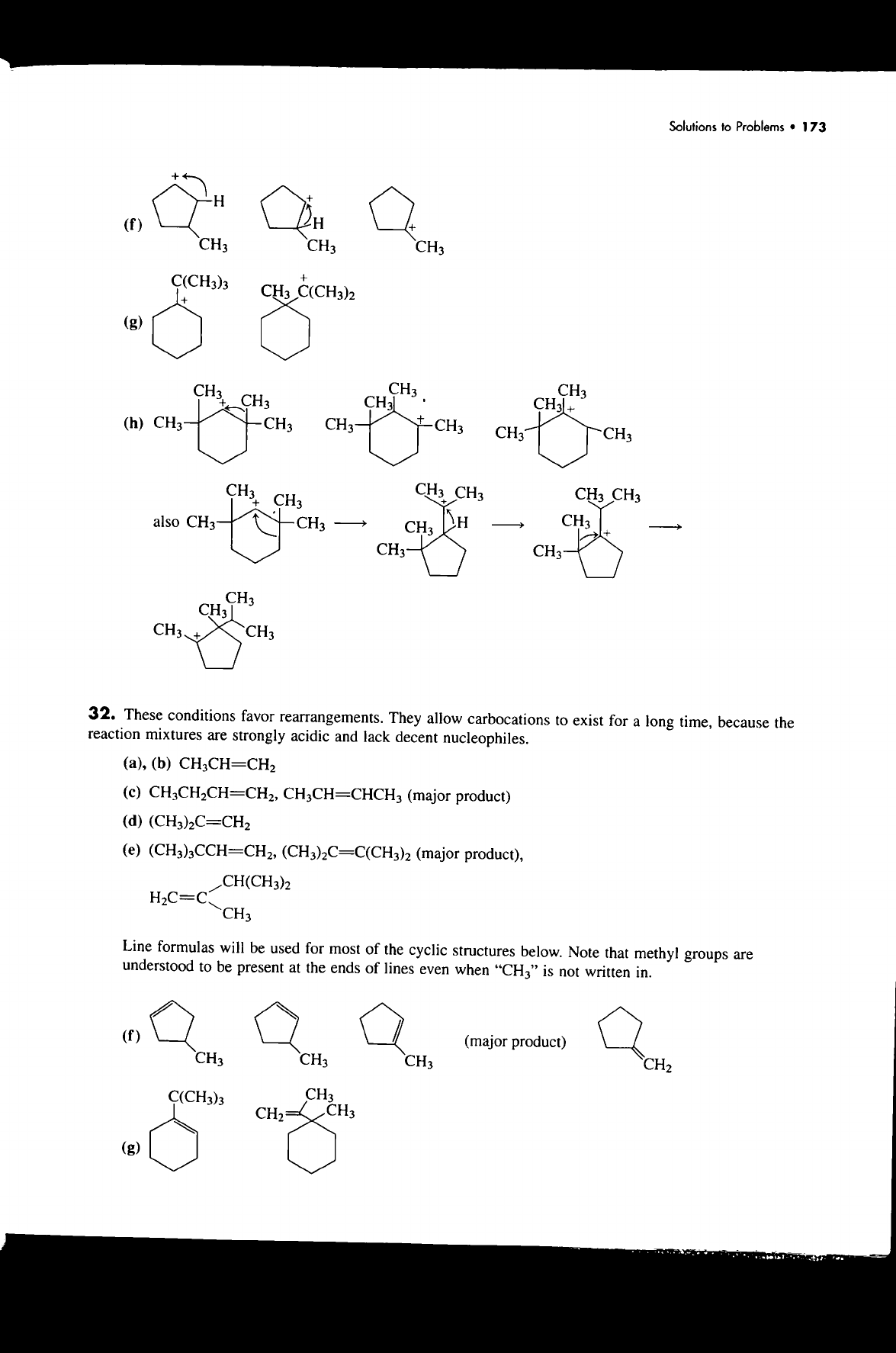 Solutions to Problems 173 + H + (f) H + CH₃ CH₃ CH₃ C(CH₃)₃ + CH₃ C(CH₃)₂ + (g) CH₃ CH₃ CH₃ + CH₃ CH₃ + (h) CH₃ CH₃ CH₃ + CH₃ CH₃ CH₃ CH₃ CH₃ CH₃ CH₃ CH₃ CH₃ + also CH₃ CH₃ CH₃ H CH₃ + CH₃ CH₃ CH₃ CH₃ CH₃ + CH₃ 32. These conditions favor rearrangements. They allow carbocations to exist for a long time, because the reaction mixtures are strongly acidic and lack decent nucleophiles. (a), (b) CH₃CH=CH₂ (c) (major product) (d) (CH₃)₂C=CH₂ (e) (CH₃)₃CCH=CH₂, (CH₃)₂C=C(CH₃)₂ (major product), CH(CH₃)₂ H₂C=C CH₃ Line formulas will be used for most of the cyclic structures below. Note that methyl groups are understood to be present at the ends of lines even when "CH₃" is not written in. (f) (major product) CH₃ CH₃ CH₃ CH₂ C(CH₃)₃ CH₃ CH₂ CH₃ (g)