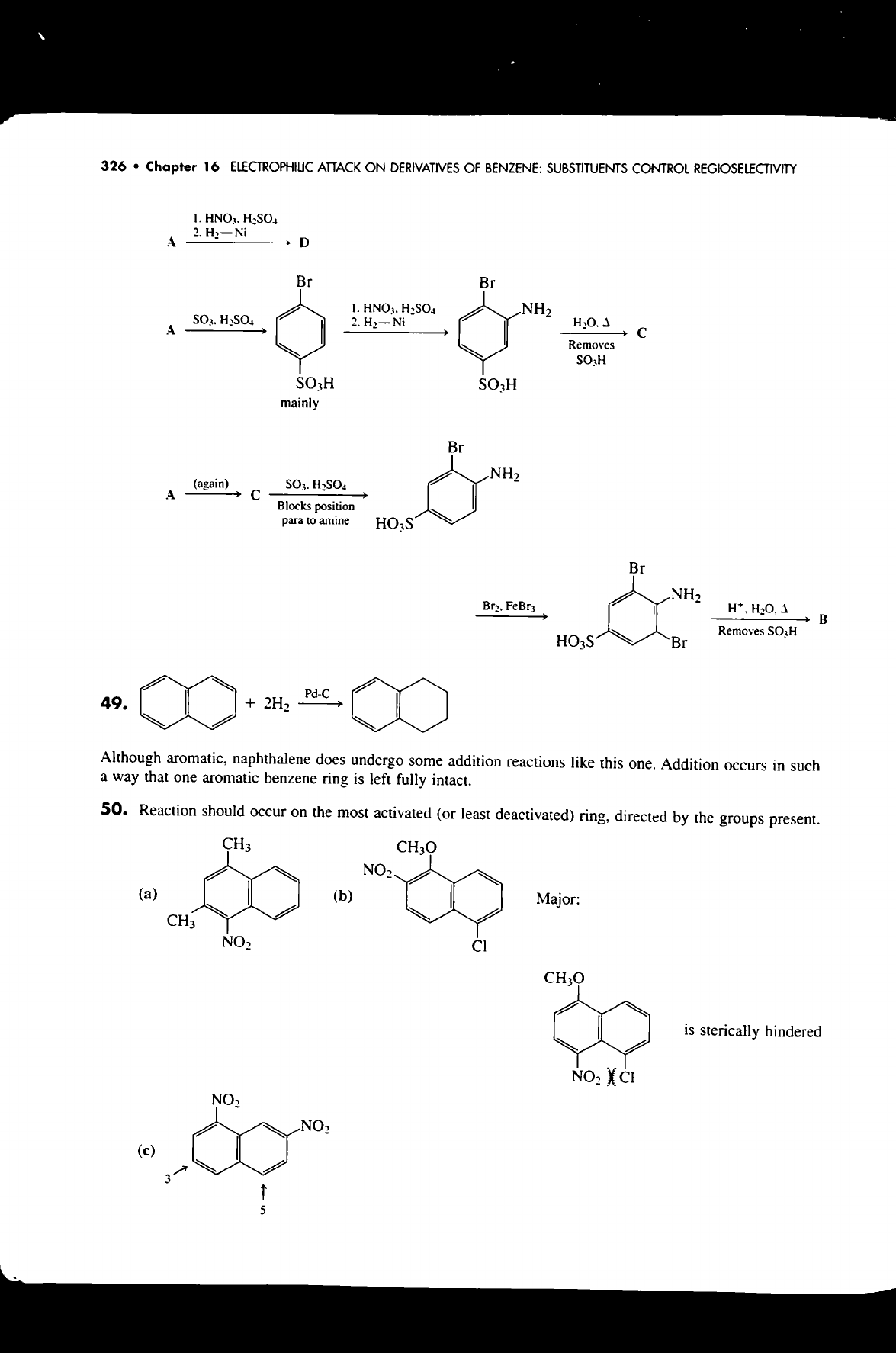 326 Chapter 16 ELECTROPHILIC ATTACK ON DERIVATIVES OF BENZENE: SUBSTITUENTS CONTROL REGIOSELECTIVITY 1. HNO3. H₂SO₄ 2. Ni A D Br Br HNO3. H₂SO₄ NH₂ H₂SO₄ 2. H₂-Ni H₂O. A C Removes SO₃H SO₃H mainly Br NH₂ (again) H₂SO₄ A C Blocks position para to amine Br NH₂ FeBr₃ 1 B Removes HO₃S Br Pd-C 49. + 2H₂ Although aromatic, naphthalene does undergo some addition reactions like this one. Addition occurs in such a way that one aromatic benzene ring is left fully intact. 50. Reaction should occur on the most activated (or least deactivated) ring, directed by the groups present. CH₃ NO₂ (a) (b) Major: CH₃ NO₂ CH₃O is sterically hindered NO₂ X CI NO₂ NO₂ (c) 3 5