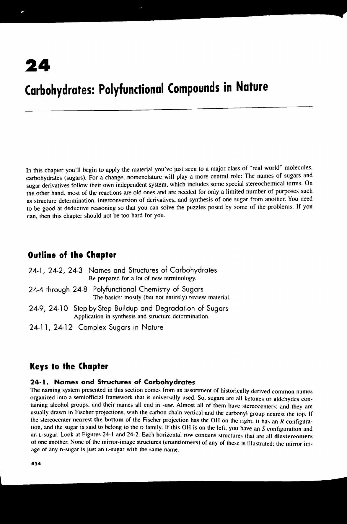 24 Carbohydrates: Polyfunctional Compounds in Nature In this chapter you'll begin to apply the material you've just seen to a major class of "real world" molecules, carbohydrates (sugars). For a change. nomenclature will play a more central role: The names of sugars and sugar derivatives follow their own independent system. which includes some special stereochemical terms. On the other hand. most of the reactions are old ones and are needed for only a limited number of purposes such as structure determination, interconversion of derivatives, and synthesis of one sugar from another. You need to be good at deductive reasoning so that you can solve the puzzles posed by some of the problems. If you can, then this chapter should not be too hard for you. Outline of the Chapter 24-1, 24-2, 24-3 Names and Structures of Carbohydrates Be prepared for a lot of new terminology. 24-4 through 24-8 Polyfunctional Chemistry of Sugars The basics: mostly (but not entirely) review material. 24-9, 24-10 Step-by-Step Buildup and Degradation of Sugars Application in synthesis and structure determination. 24-11, 24-12 Complex Sugars in Nature Keys to the Chapter 24-1. Names and Structures of Carbohydrates The naming system presented in this section comes from an assortment of historically derived common names organized into a semiofficial framework that is universally used. So, sugars are all ketones or aldehydes con- taining alcohol groups. and their names all end in -ose. Almost all of them have stereocenters; and they are usually drawn in Fischer projections, with the carbon chain vertical and the carbonyl group nearest the top. If the stereocenter nearest the bottom of the Fischer projection has the OH on the right, it has an R configura- tion, and the sugar is said to belong to the D family. If this OH is on the you have an S configuration and an L-sugar. Look at Figures 24-1 and 24-2. Each horizontal row contains structures that are all diastereomers of one another. None of the mirror-image structures (enantiomers) of any of these is illustrated; the mirror im- age of any D-sugar is just an L-sugar with the same name. 454