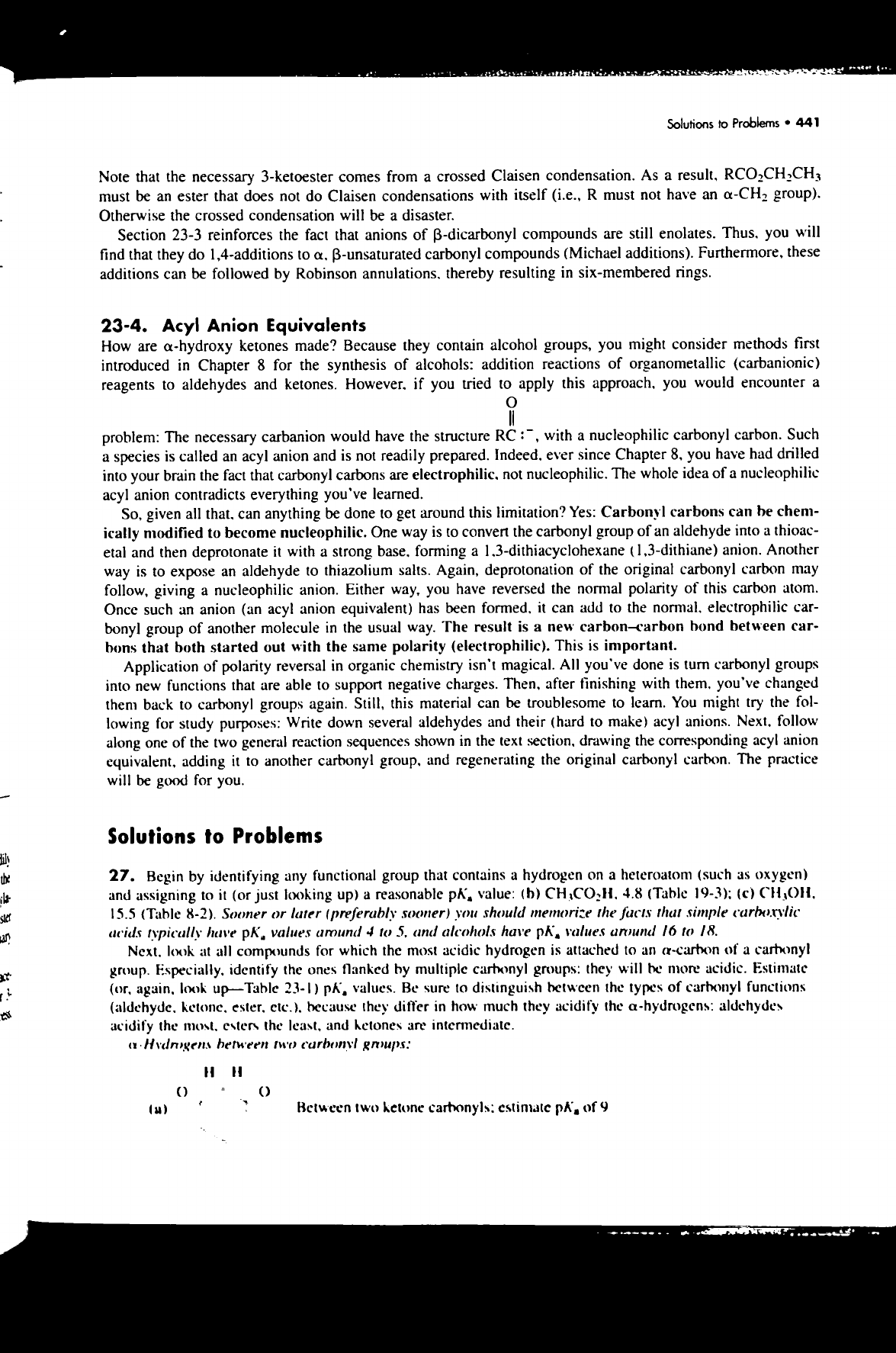 Solutions to Problems 441 Note that the necessary 3-ketoester comes from a crossed Claisen condensation. As a result, RCO₂CH₂CH₃ must be an ester that does not do Claisen condensations with itself (i.e., R must not have an α-CH₂ group). Otherwise the crossed condensation will be a disaster. Section 23-3 reinforces the fact that anions of compounds are still enolates. Thus, you will find that they do 1,4-additions to carbonyl compounds (Michael additions). Furthermore, these additions can be followed by Robinson thereby resulting in six-membered rings. 23-4. Acyl Anion Equivalents How are α-hydroxy ketones made? Because they contain alcohol groups, you might consider methods first introduced in Chapter 8 for the synthesis of alcohols: addition reactions of organometallic (carbanionic) reagents to aldehydes and ketones. However, if you tried to apply this you would encounter a problem: The necessary carbanion would have the structure with a nucleophilic carbonyl carbon. Such a species is called an acyl anion and is not readily prepared. Indeed. ever since Chapter 8, you have had drilled into your brain the fact that carbonyl carbons are electrophilic. not nucleophilic. The whole idea of a nucleophilic acyl anion contradicts everything you've learned. So, given all that, can anything be done to get around this limitation? Yes: Carbonyl carbons can be chem- ically modified to become nucleophilic. One way is to convert the carbonyl group of an aldehyde into a thioac- etal and then deprotonate it with a strong base, forming a 1.3-dithiacyclohexane (1,3-dithiane) anion. Another way is to expose an aldehyde to thiazolium salts. Again, deprotonation of the original carbonyl carbon may follow, giving a nucleophilic anion. Either way, you have reversed the normal polarity of this carbon atom. Once such an anion (an acyl anion equivalent) has been formed, it can add to the electrophilic car- bonyl group of another molecule in the usual way. The result is a new carbon-carbon bond between car- bons that both started out with the same polarity (electrophilic). This is important. Application of polarity reversal in organic chemistry isn't magical. All you've done is turn carbonyl groups into new functions that are able to support negative charges. Then, after finishing with them. you've changed them back to carbonyl groups again. Still, this material can be troublesome to learn. You might try the fol- lowing for study purposes: Write down several aldehydes and their (hard to make) acyl anions. Next. follow along one of the two general reaction sequences shown in the text section, drawing the corresponding acyl anion equivalent, adding it to another carbonyl group, and regenerating the original carbonyl carbon. The practice will be good for you. Solutions to Problems 27. Begin by identifying any functional group that contains a hydrogen on a heteroatom (such as oxygen) and assigning to it (or just looking up) a reasonable value: (b) 4.8 (Table 19-3); (c) 15.5 (Table 8-2). Sooner or later (preferably sooner) you should memorize the facts that simple carboxylic acids typically have values around 4 to 5. and alcohols have values around 16 to 18. Next. look at all compounds for which the most acidic hydrogen is attached to an α-carbon of a carbonyl group. identify the ones flanked by multiple carbonyl groups: they will be more acidic. Estimate (or, again, look up-Table 23-1) values. Be sure to distinguish between the types of carbonyl functions ester. because they differ in how much they acidify the α-hydrogens: aldehydes acidify the esters the least, and ketones are intermediate. Hydrogens between two carbonyl groups: H () () (a) Between two ketone carbonyls: estimate of 9