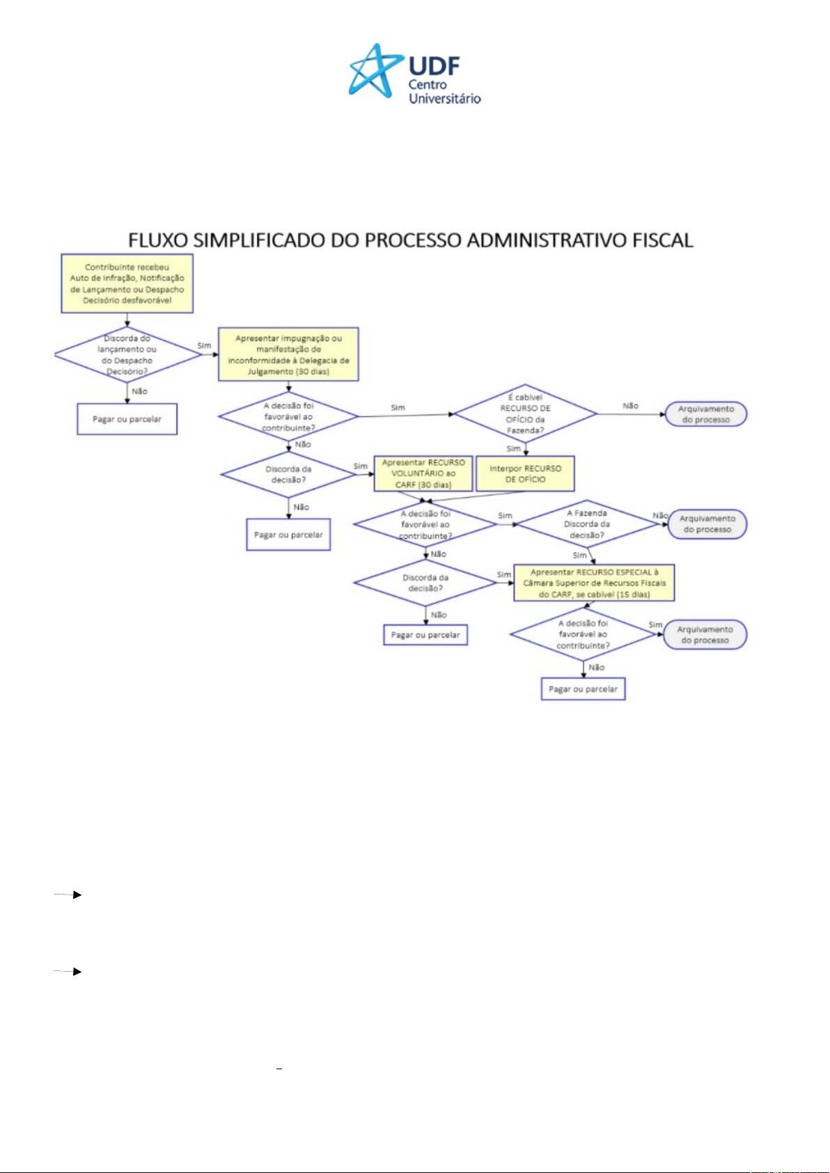 Direito Tributário II 1. Processo Administrativo Fiscal https://receita.economia.gov.br/orientacao/tributaria/julgamento-administrativo/fluxo-simplificado-do-processo-administrativo-fiscal 1.1 Normas básicas para o PAF A administração tributária faz parte da administração pública como um todo, portanto segue as normas gerais de processo administrativo. No âmbito federal temos uma norma geral, que trata do Processo Administrativo no âmbito da União. Ou seja, qualquer processo administrativo. É a Lei 9784/99. Temos uma norma específica sobre o Processo Administrativo Fiscal, que é o Decreto 70.235/72. Ou seja, quando não tiver resposta no Decreto 70.235/72, usaremos a Lei 9784/99. Art. 1o Esta Lei estabelece normas básicas sobre o processo administrativo no âmbito da Administração Federal direta e indireta, visando, em especial, à proteção dos direitos dos administrados e ao melhor cumprimento dos fins da Administração. § 1o Os preceitos desta Lei também se aplicam aos órgãos dos Poderes Legislativo e Judiciário da União, quando no desempenho de função administrativa. § 2o Para os fins desta Lei, consideram-se: I - órgão - a unidade de atuação integrante da estrutura da Administração direta e da estrutura da Administração indireta; II - entidade - a unidade de atuação dotada de personalidade jurídica; III - autoridade - o servidor ou agente público dotado de poder de decisão. Princípios Administrativos A Lei 9.784 traz outros princípios explícitos além do famoso L.I.M.P.E. previsto na Constituição Federal. Art. 2º A Administração Pública obedecerá, dentre outros, aos princípios da legalidade, finalidade, motivação, razoabilidade, proporcionalidade, moralidade, ampla defesa, contraditório, segurança jurídica, interesse público e eficiência. Direitos dos Administrados Tal como em relação aos princípios, preferiu a Lei trazer expressamente os chamados “Direitos dos Administrados”, previstos no Art. 3º: Art. 3º O administrado tem os seguintes direitos perante a Administração, sem prejuízo de outros que lhe sejam assegurados: I - ser tratado com respeito pelas autoridades e servidores, que deverão facilitar o exercício de seus direitos e o cumprimento de suas obrigações; II - ter ciência da tramitação dos processos administrativos em que tenha a condição de interessado, ter vista dos autos, obter cópias de documentos neles contidos e conhecer as decisões proferidas; III - formular alegações e apresentar documentos antes da decisão, os quais serão objeto de consideração pelo órgão competente; IV - fazer-se assistir, facultativamente, por advogado, salvo quando obrigatória a representação, por força de lei. Deveres dos Administrados (Art. 4º): Art. 4o São deveres do administrado perante a Administração, sem prejuízo de outros previstos em ato normativo: I - expor os fatos conforme a verdade; II - proceder com lealdade, urbanidade e boa-fé; III - não agir de modo temerário; IV - prestar as informações que lhe forem solicitadas e colaborar para o esclarecimento dos fatos. PROCESSO TRIBUTÁRIO também tem uma regra específica, o que coexiste com os preceitos expostos na Lei do Processo Administrativo. É o Decreto nº 70.235/72. Art. 1° Este Decreto rege o processo administrativo de determinação e exigência dos créditos tributários da União e o de consulta sobre a aplicação da legislação tributária federal. CAPÍTULO I Do Processo Fiscal SEÇÃO I Dos Atos e Termos Processuais Art. 2º Os atos e termos processuais, quando a lei não prescrever forma determinada, conterão somente o indispensável à sua finalidade, sem espaço em branco, e sem entrelinhas, rasuras ou emendas não ressalvadas. Parágrafo único. Os atos e termos processuais poderão ser formalizados, tramitados, comunicados e transmitidos em formato digital, conforme disciplinado em ato da administração tributária. (Redação dada pela Lei nº 12.865, de 2013) OBS: não há trâmite de informações verbais. Tudo deve ser por escrito. Também é possível na forma eletrônica. Art. 3° A autoridade local fará realizar, no prazo de trinta dias, os atos processuais que devam ser praticados em sua jurisdição, por solicitação de outra autoridade preparadora ou julgadora. Esse prazo é para quando uma outra autoridade requer informações para outro Fisco, SENDO ESTE CONSIDERADO COMO IMPRÓPRIO Art. 4º Salvo disposição em contrário, o servidor executará os atos processuais no prazo de oito dias. OBS: esses são os prazos que a Administração tem para movimentar os processos. Vejam que são prazos impróprios, pois em caso de descumprimento não há prevista nenhuma sanção. O máximo que pode ocorrer, se o contribuinte conseguir provar, é o crime de prevaricação. 1.2 Início do PAF O início do PAF tem previsao no Art. 7º do Decreto 70235/72: SEÇÃO III Do Procedimento Art. 7º O procedimento fiscal tem início com: (Vide Decreto nº 3.724, de 2001) I - o primeiro ato de ofício, escrito, praticado por servidor competente, cientificado o sujeito passivo da obrigação tributária ou seu preposto; II - a apreensão de mercadorias, documentos ou livros; III - o começo de despacho aduaneiro de mercadoria importada. § 1° O início do procedimento exclui a espontaneidade do sujeito passivo em relação aos atos anteriores e, independentemente de intimação a dos demais envolvidos nas infrações verificadas. § 2° Para os efeitos do disposto no § 1º, os atos referidos nos incisos I e II valerão pelo prazo de sessenta dias, prorrogável, sucessivamente, por igual período, com qualquer outro ato escrito que indique o prosseguimento dos trabalhos. Iniciado o PAF exclui-se a espontaneidade do sujeito passivo. A partir daí o sujeito passivo está sob investigação e análise. 1.3 Auto de infração e notificação do lançamento Art. 9º A exigência do crédito tributário e a aplicação de pena